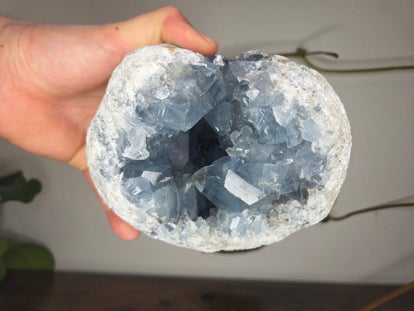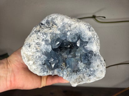 een grote celestien geode uit madagaskar van 4 kilo en 15,8 cm bij 13,4 cm bij 9,2 cm