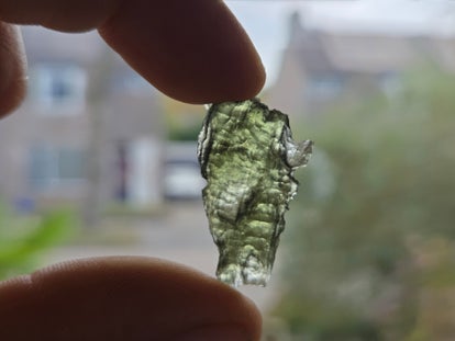 een groot stuk moldaviet uit nesmen hurka, tsjechië van 8,15 gram bij 3,6 cm bij 2,7 cm bij 1,1 cm