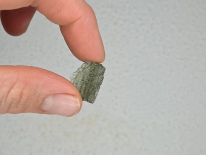 een stukje moldaviet uit chlum, tsjechië van 1,77 gram en 2,5 cm bij 1,3 cm bij 0,6 cm
