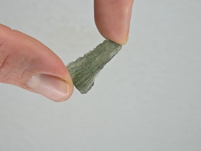 een stukje moldaviet uit chlum, tsjechië van 1,80 gram en 3 cm bij 1,8 cm bij 0,3 cm
