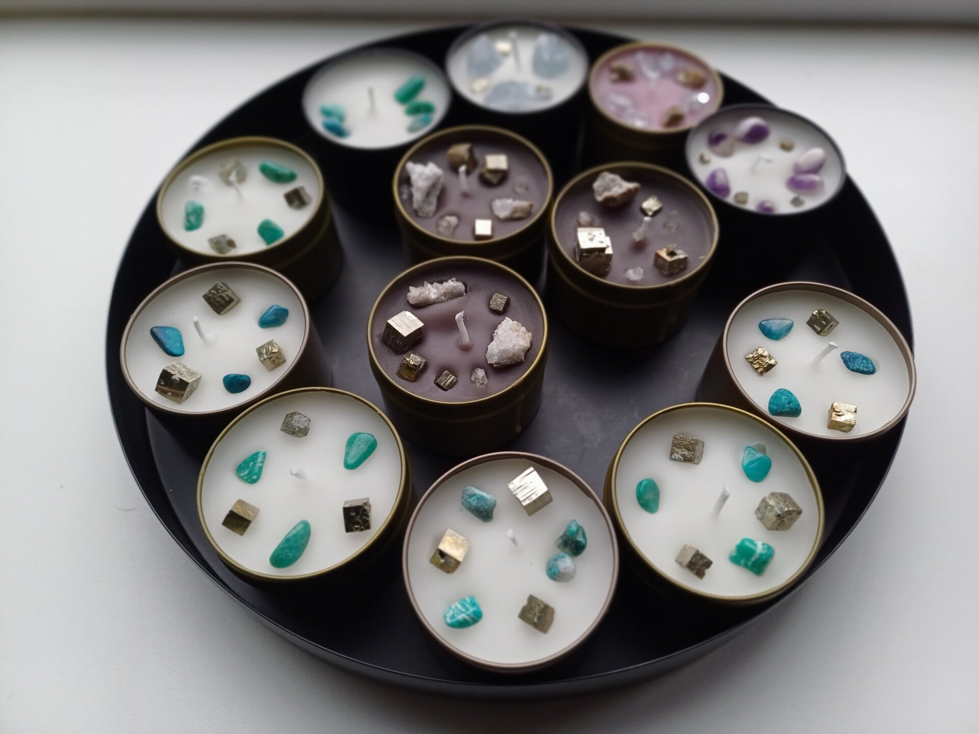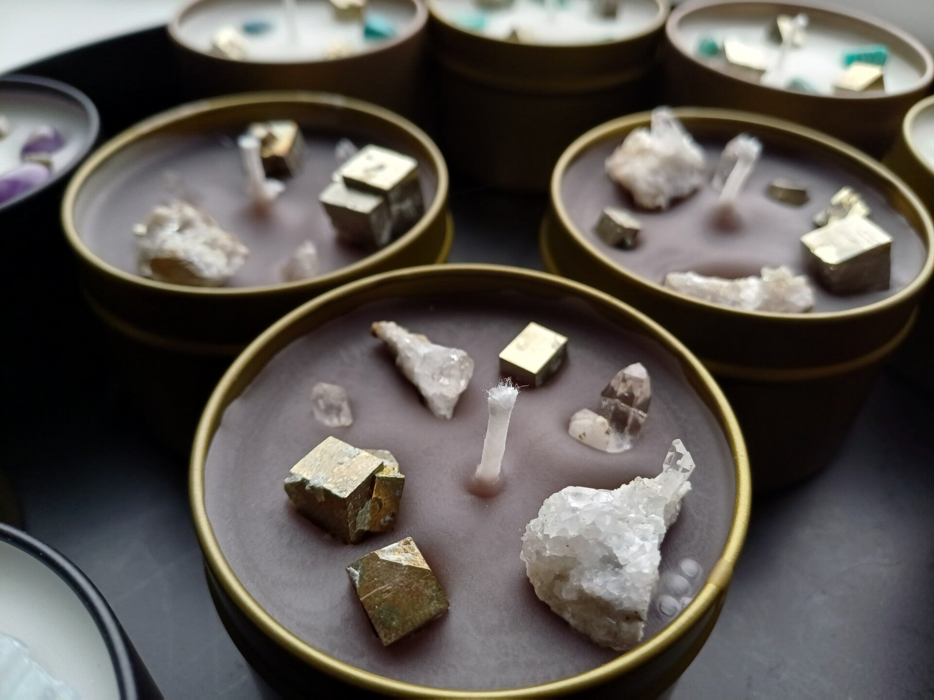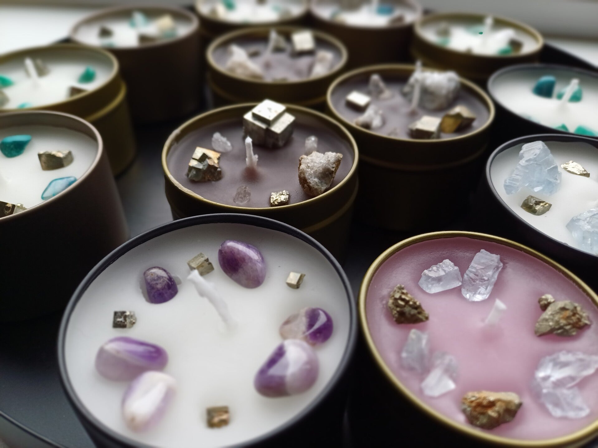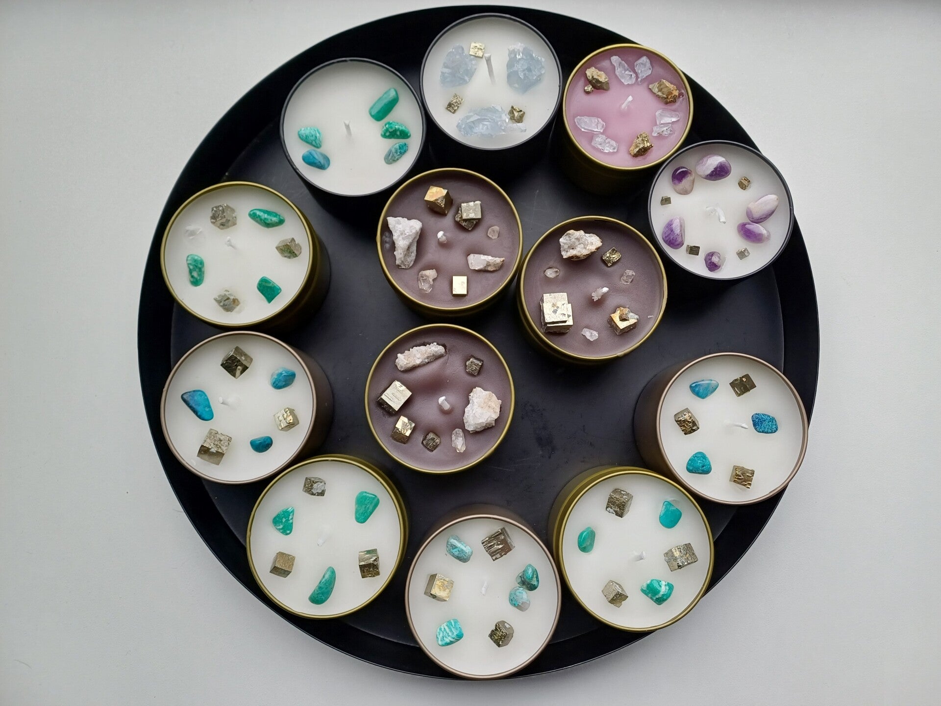 Geurkaarsen met verschillende Mineralen erin.