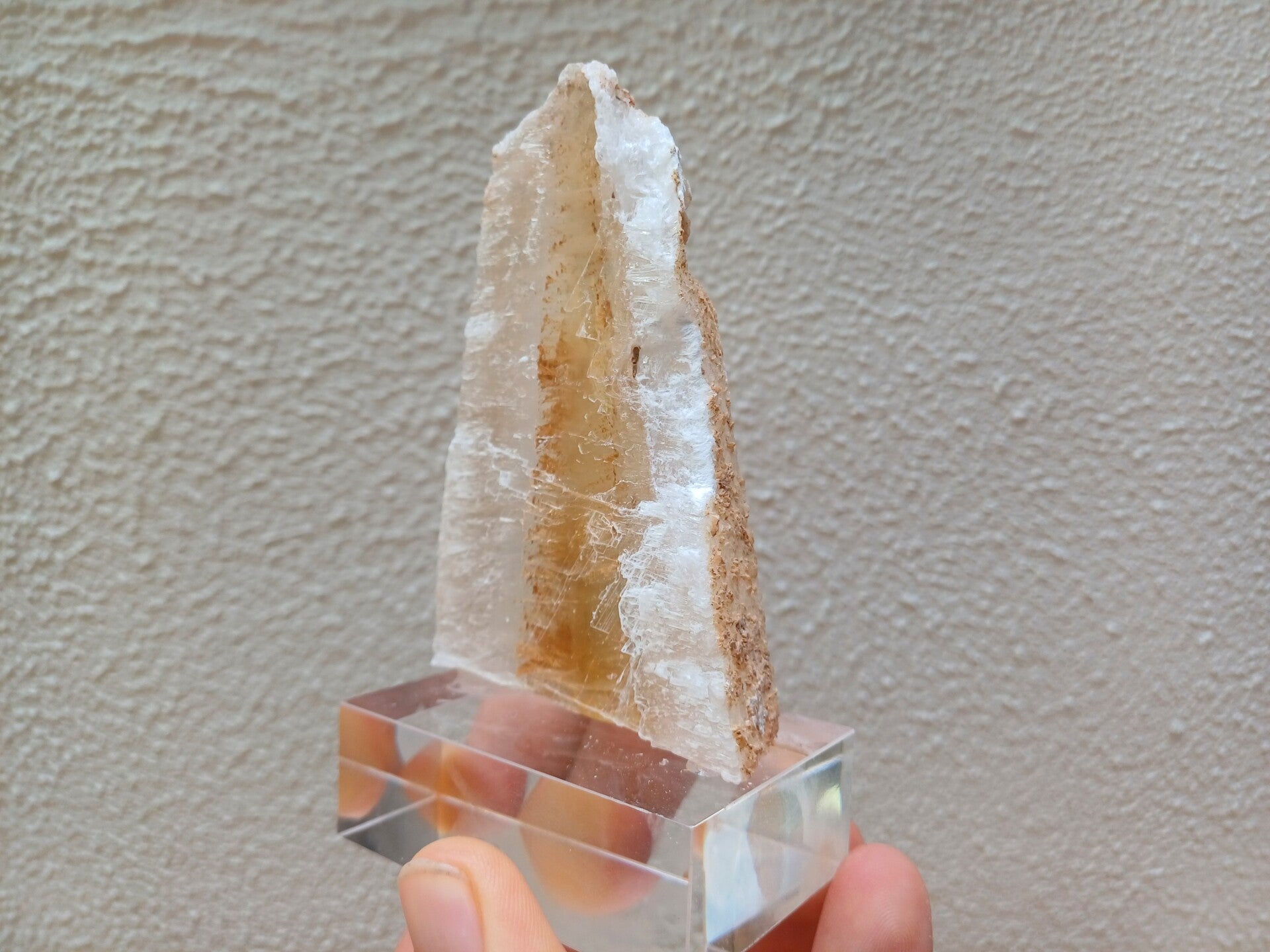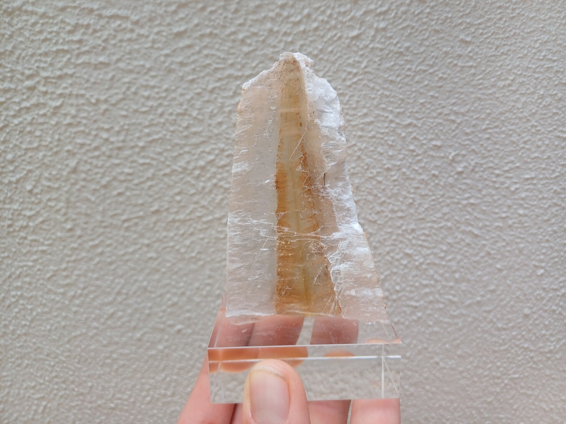 een tricolor seleniet op sokkel uit Utrillas, Spanje van 9 cm bij 5,5 cm bij 1,2 cm. de maat is zonder sokkel.