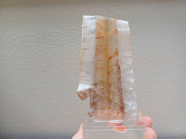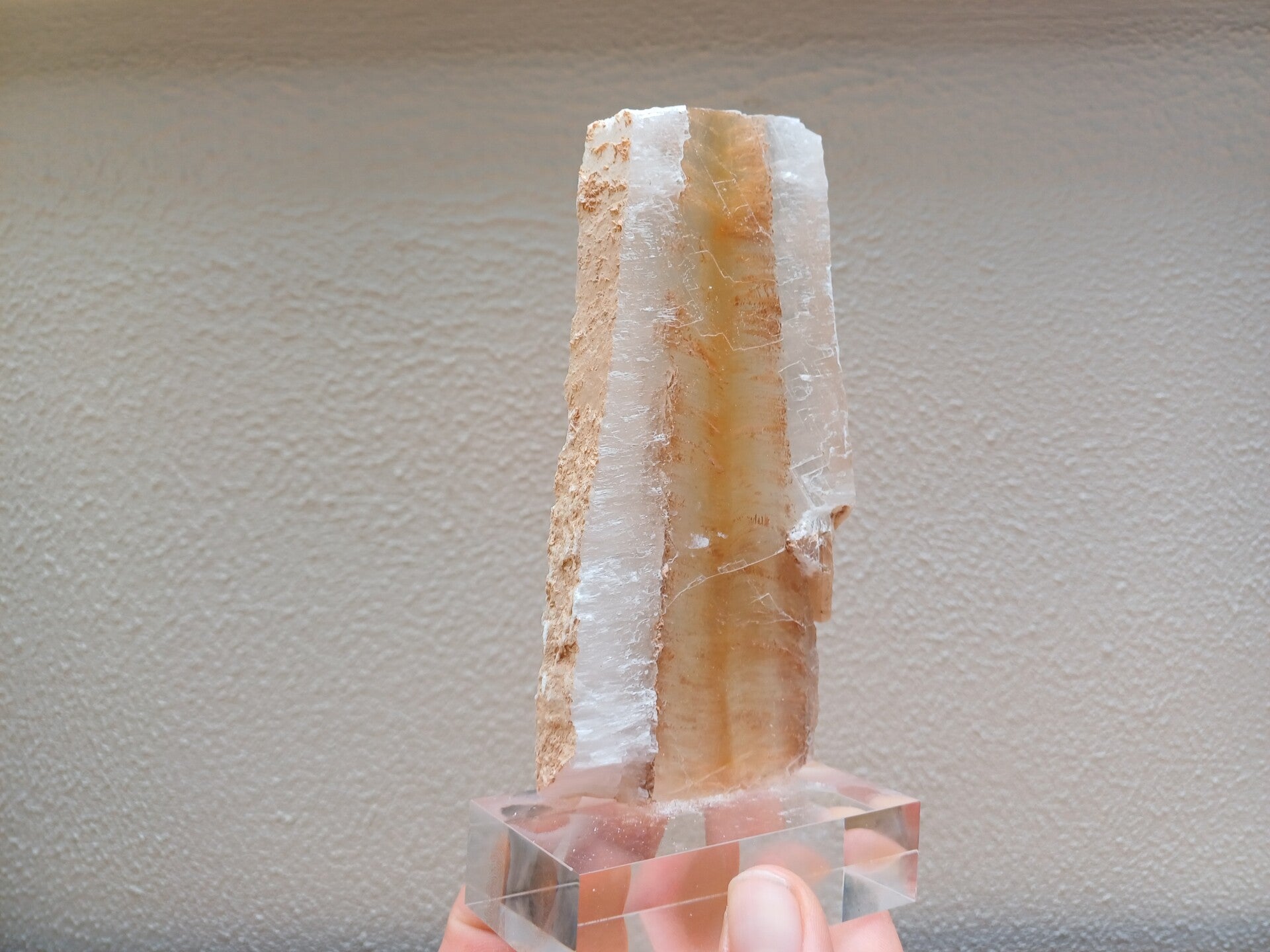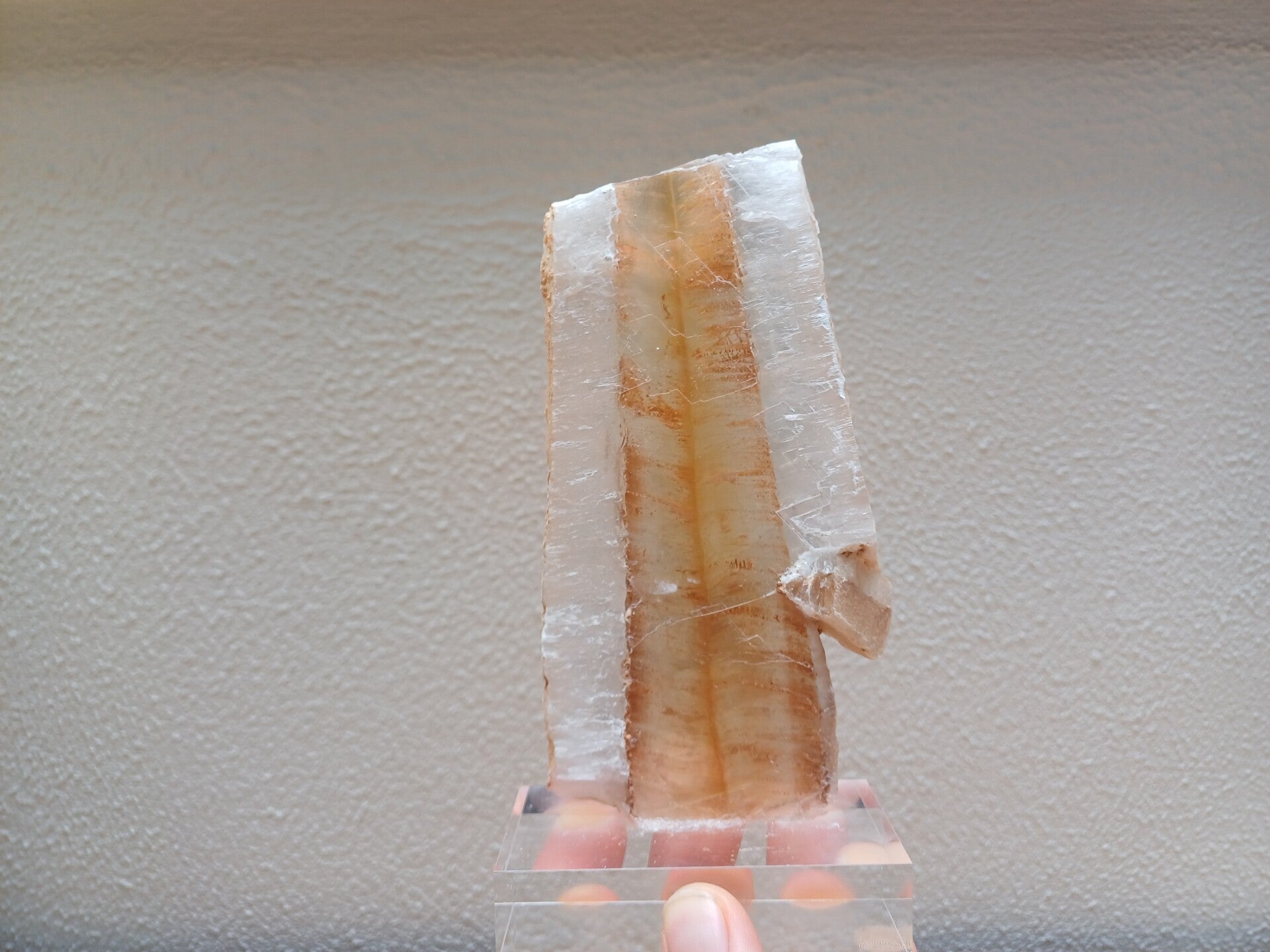 een tricolor seleniet op sokkel uit Utrillas, Spanje van 14,5 cm bij 7,6 cm bij 1,8 cm. de maat is zonder de sokkel.