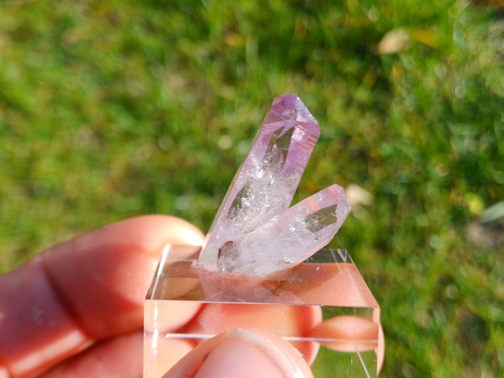 een veracruz amethist uit las vigas, mexico van 2,8 cm bij 2,1 cm bij 1,8 cm. de maat is zonder de sokkel.