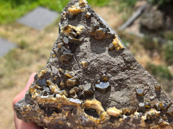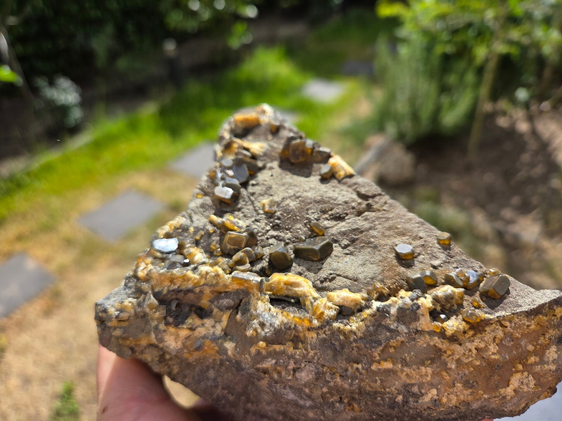 een stuk kwartsiet met daarop bariet kristallen uit jenikov, tsjechië van 14,6 cm bij 11,7 cm bij 9,7 cm