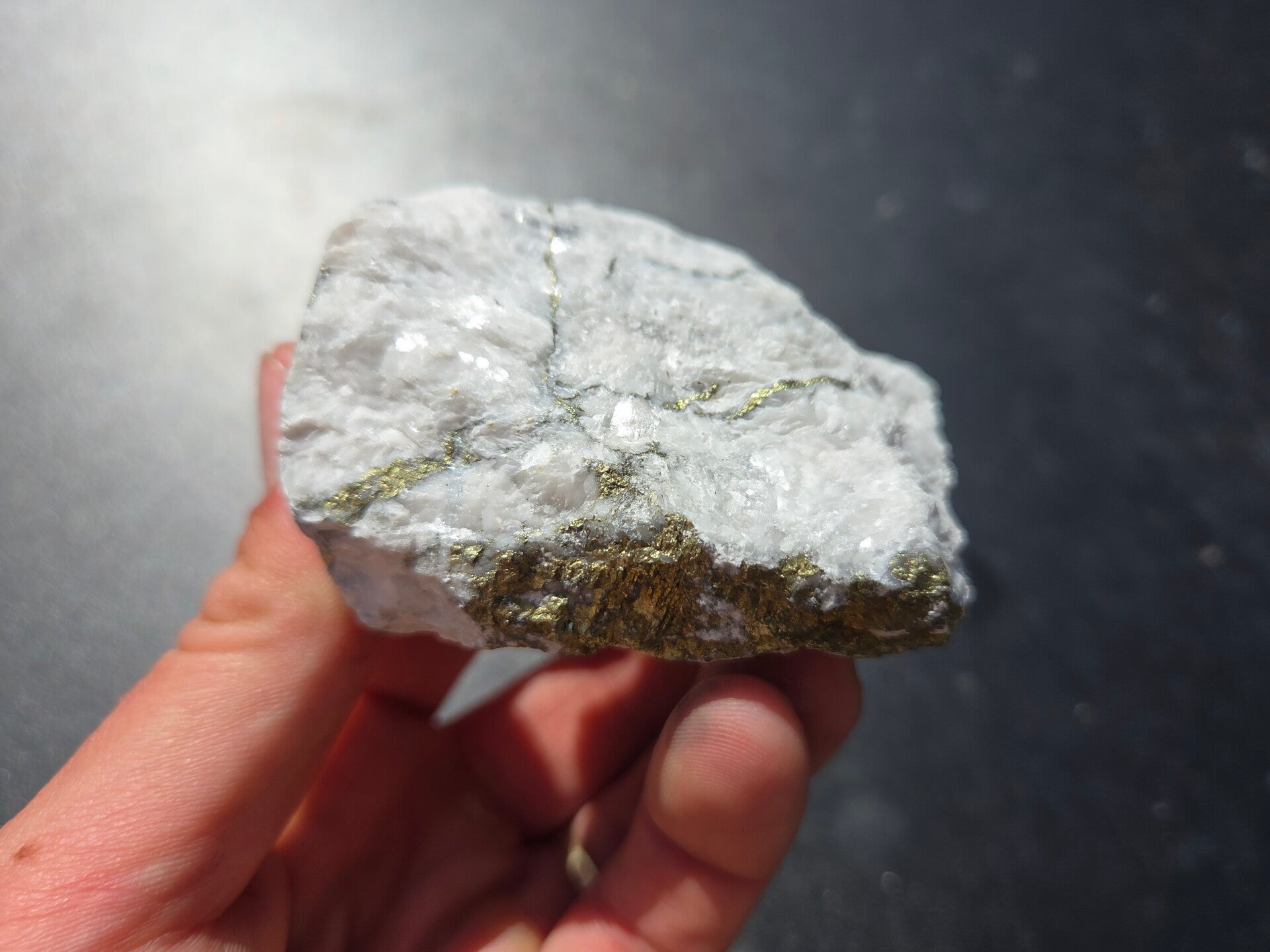 een stuk chalcopyriet met magnesiet uit hnutsa, slowakije van 7,4 cm bij 4,6 cm bij 4,8 cm