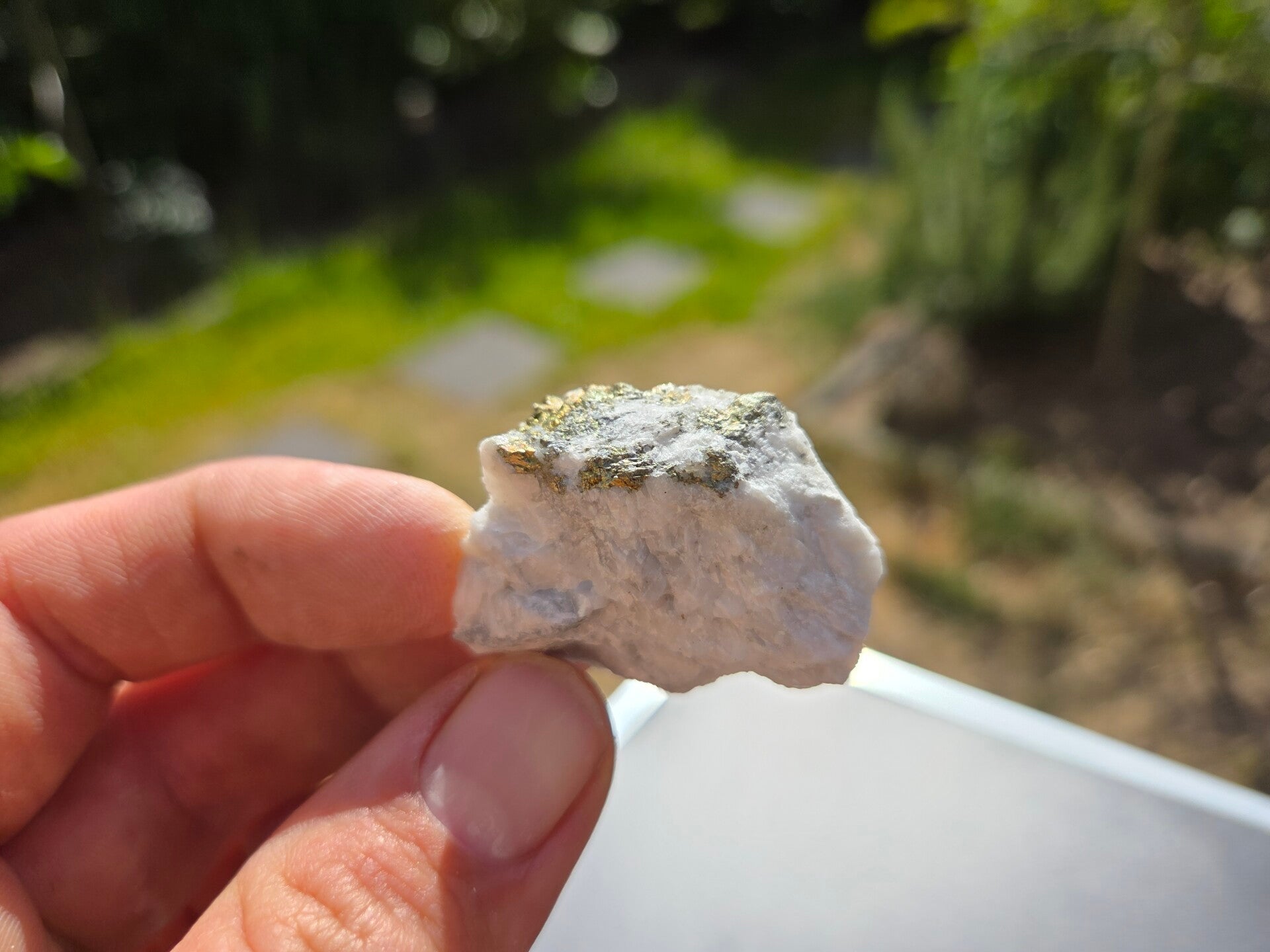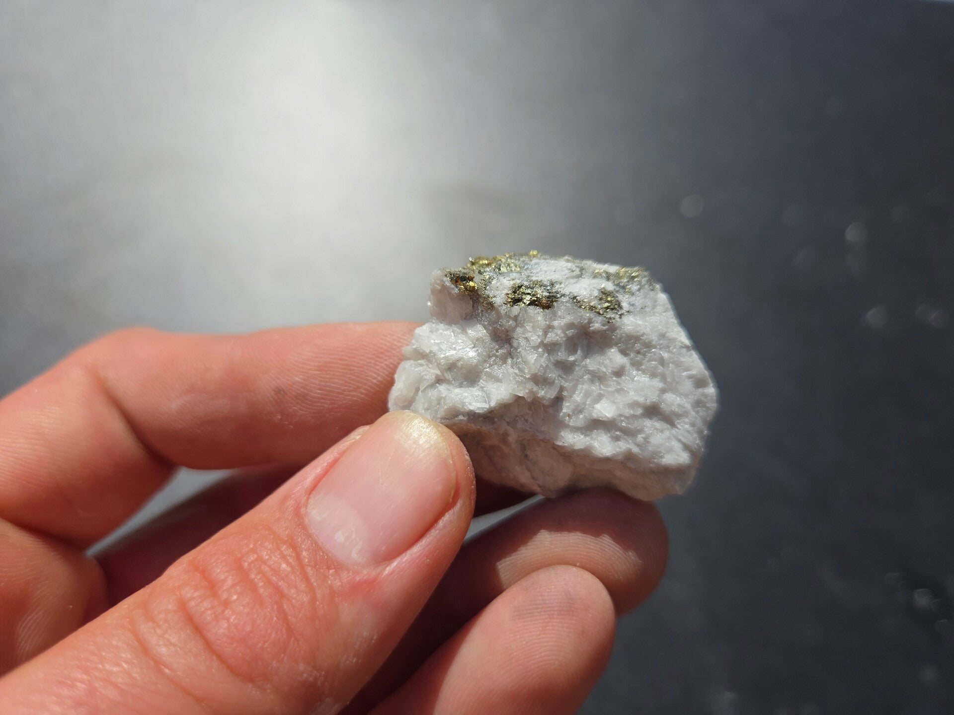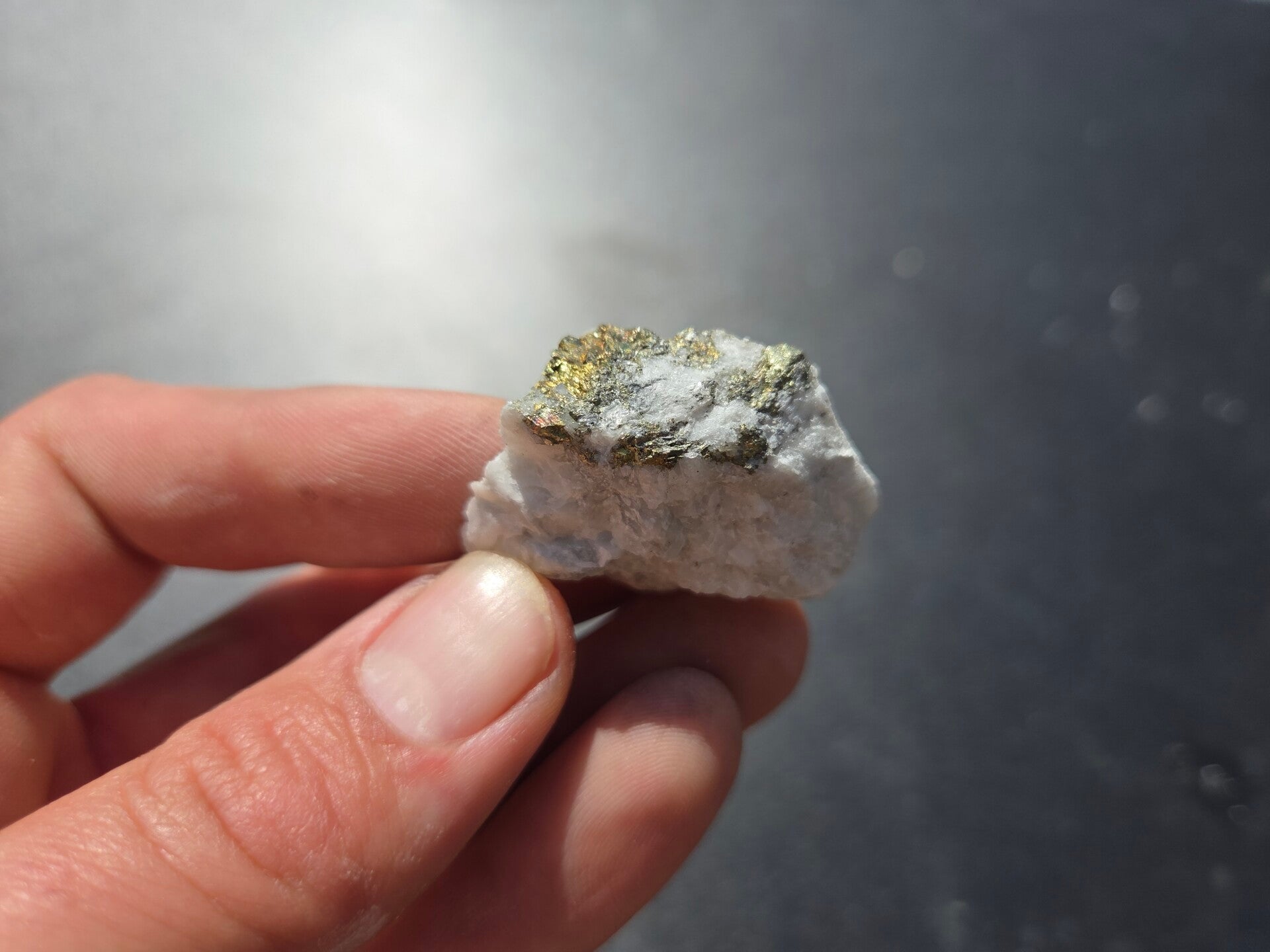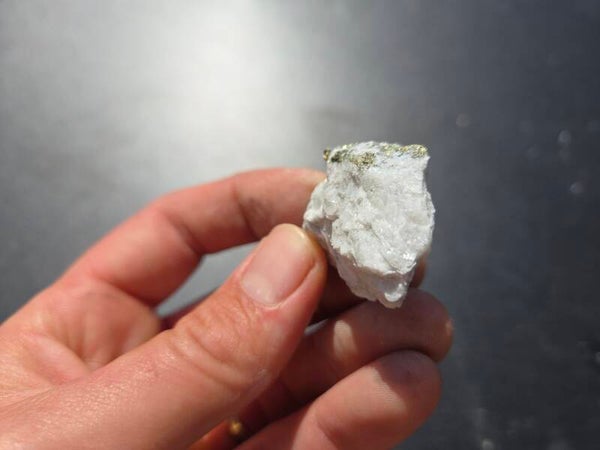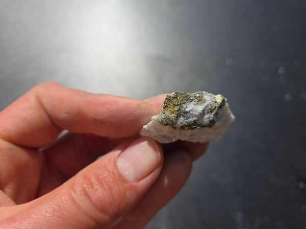 een stuk chalcopyriet met magnesiet uit hnutsa, slowakije van 3,9 cm bij 1,8 cm bij 3,1 cm