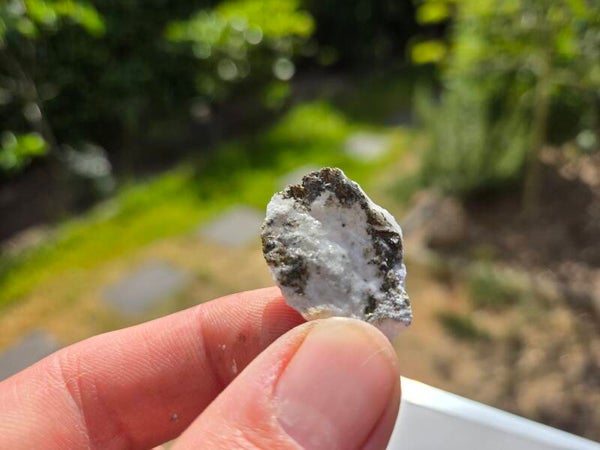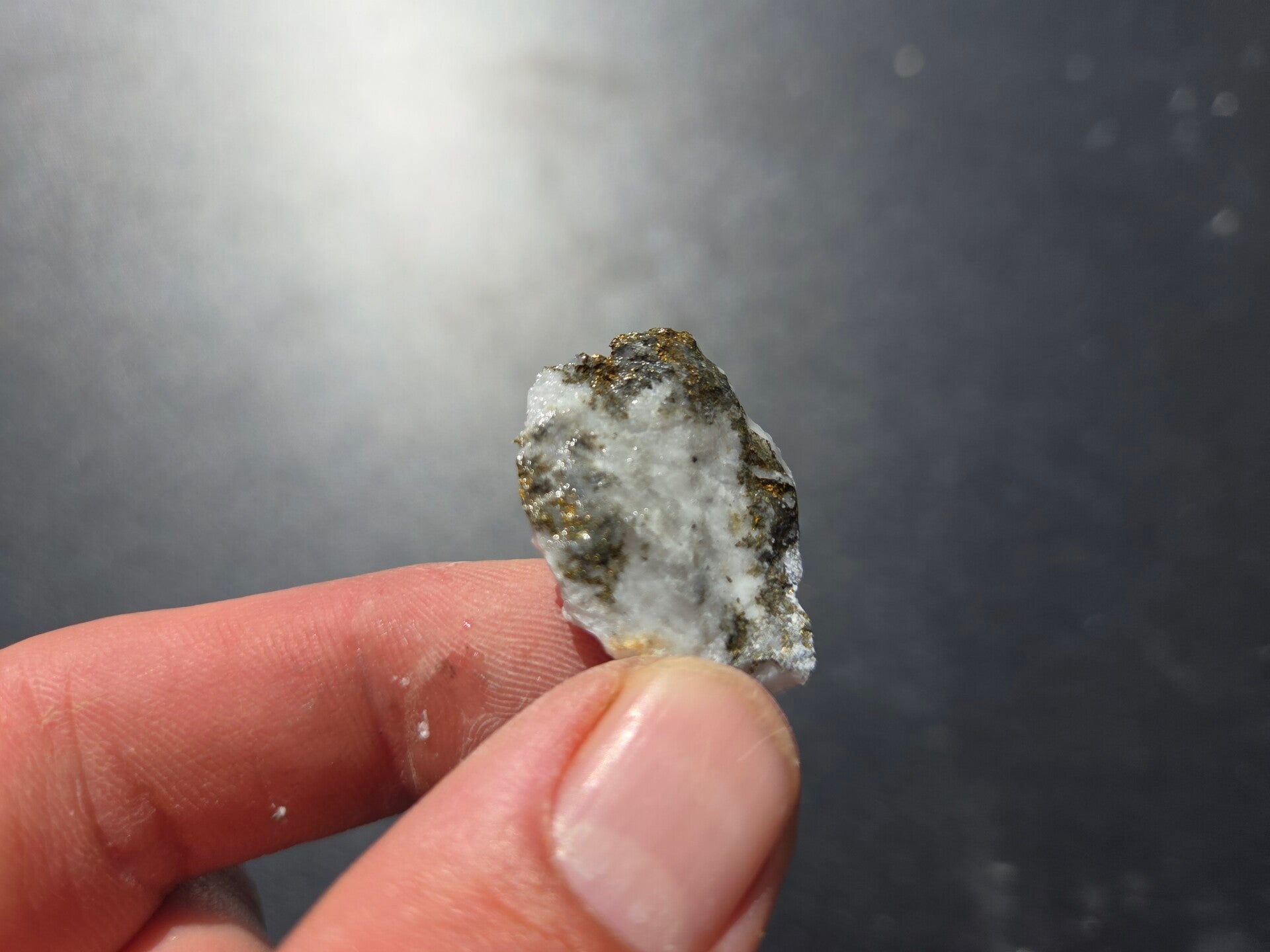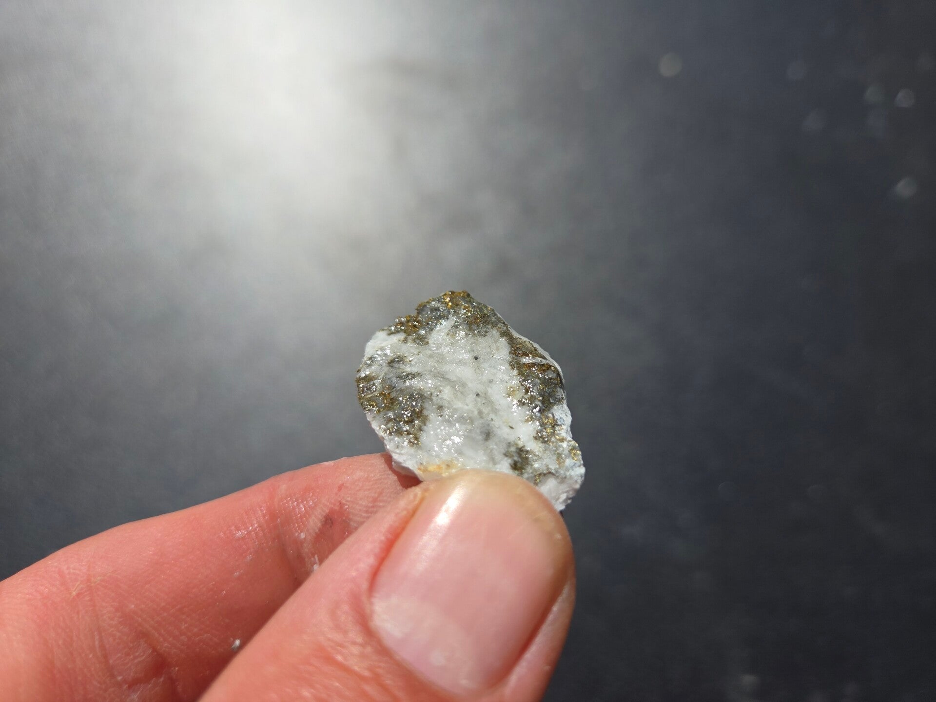 een stuk chalcopyriet met magnesiet uit hnutsa, slowakije van 2,8 cm bij 2,7 cm bij 1,1 cm
