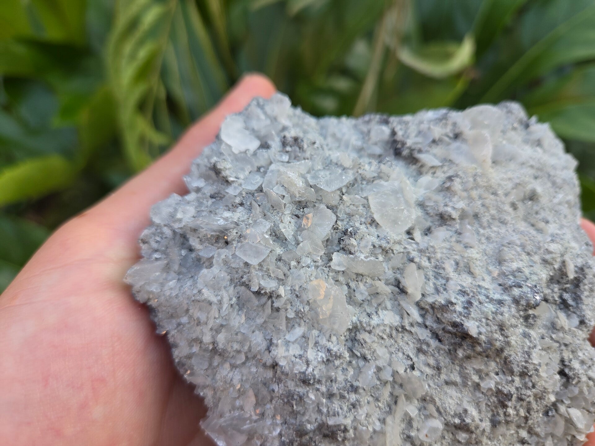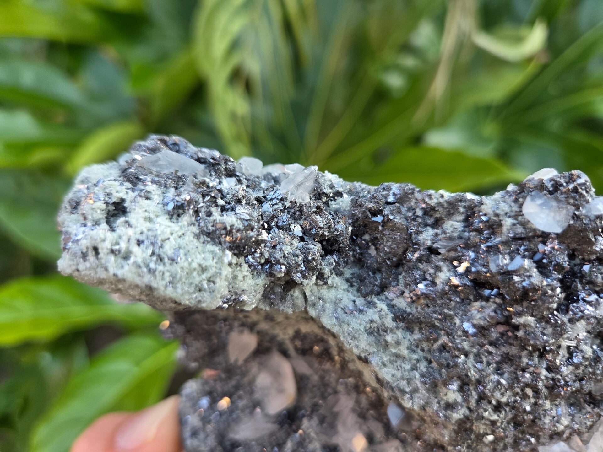 een stuk galeniet met witte calciet die roze oplicht onder uv licht lange golf uit madan, bulgarije van 9,7 cm bij 11 cm bij 4,7 cm