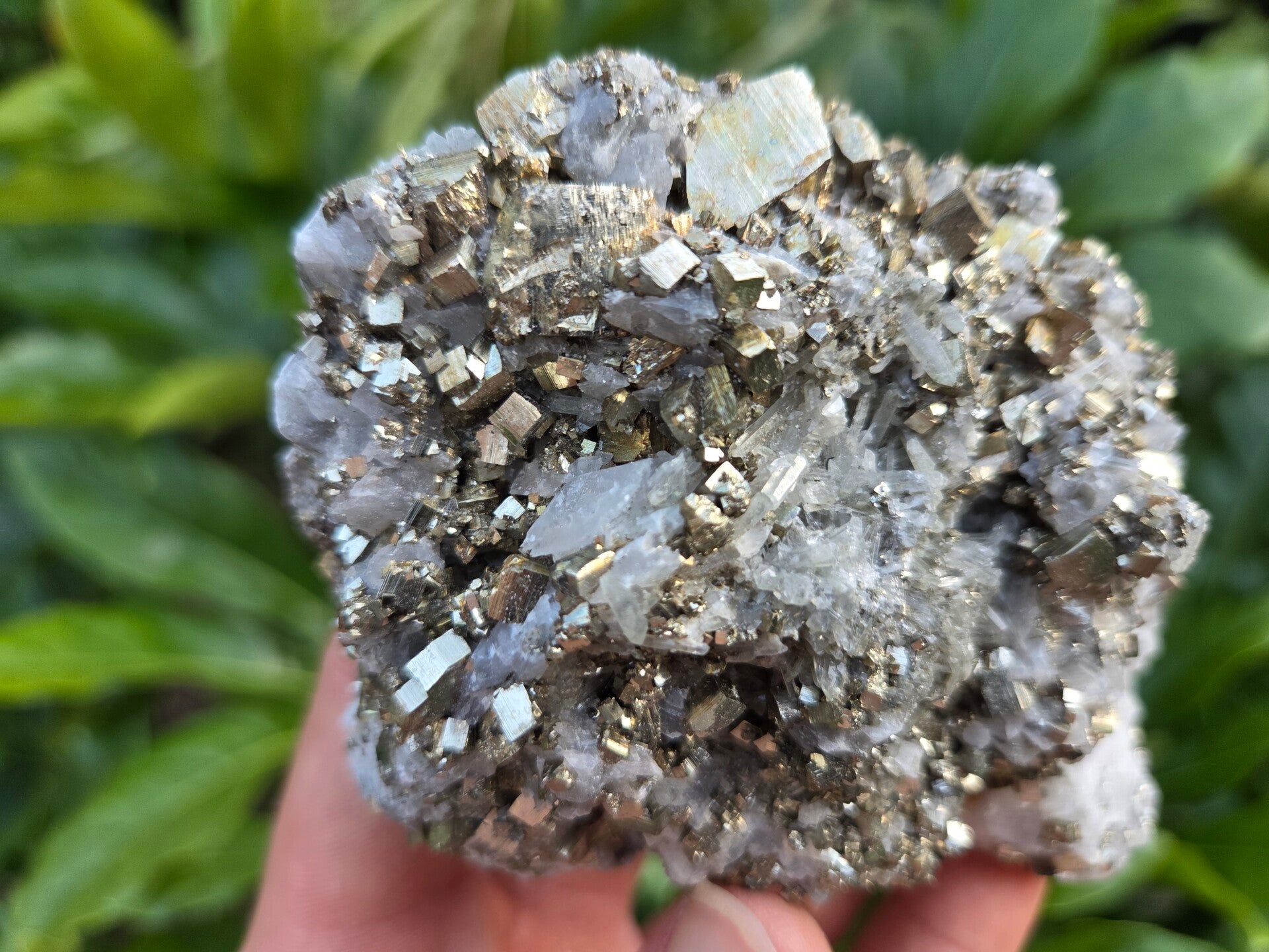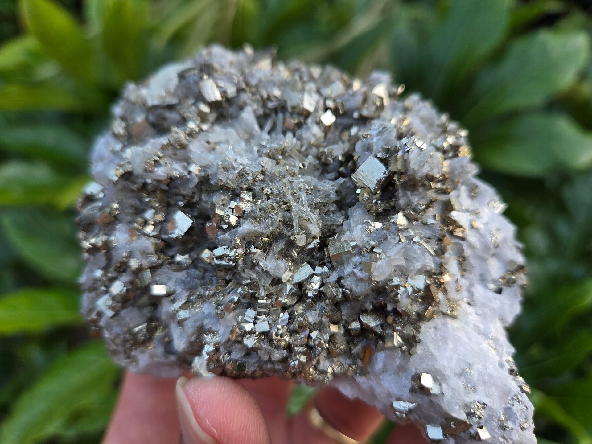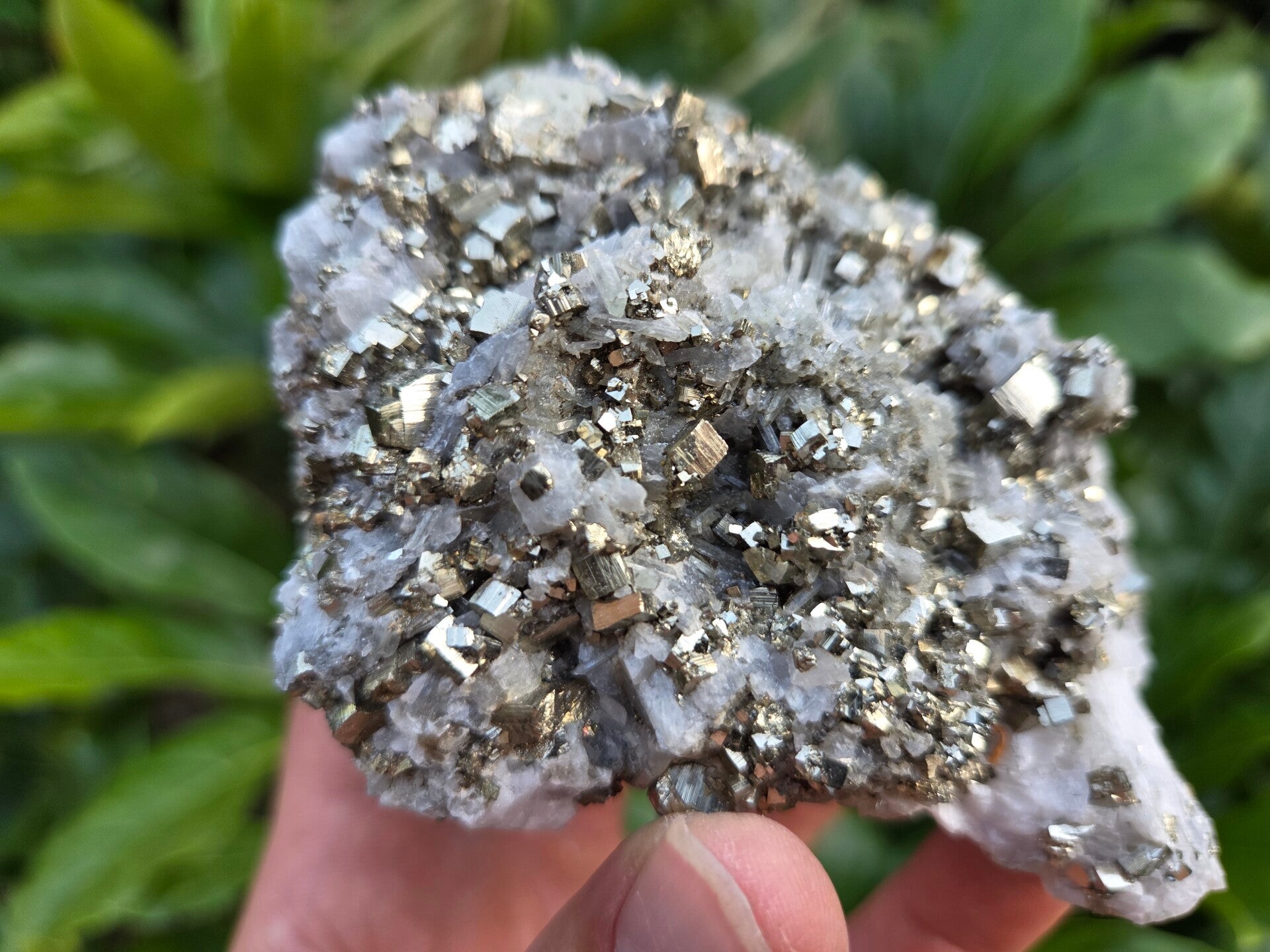 een stuk kwarts met pyriet en calciet er tussen die roze word met uv licht uit madan, bulgarije van 9,1 cm bij 8,4 cm bij 3,1cm
