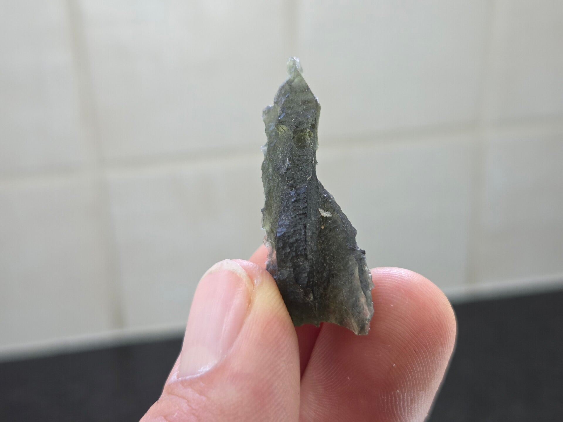 een groot stuk moldaviet uit vrabce/kroclov, tsjechië van 6,18 gram bij 3,9 cm bij 2 cm bij 1,3 cm