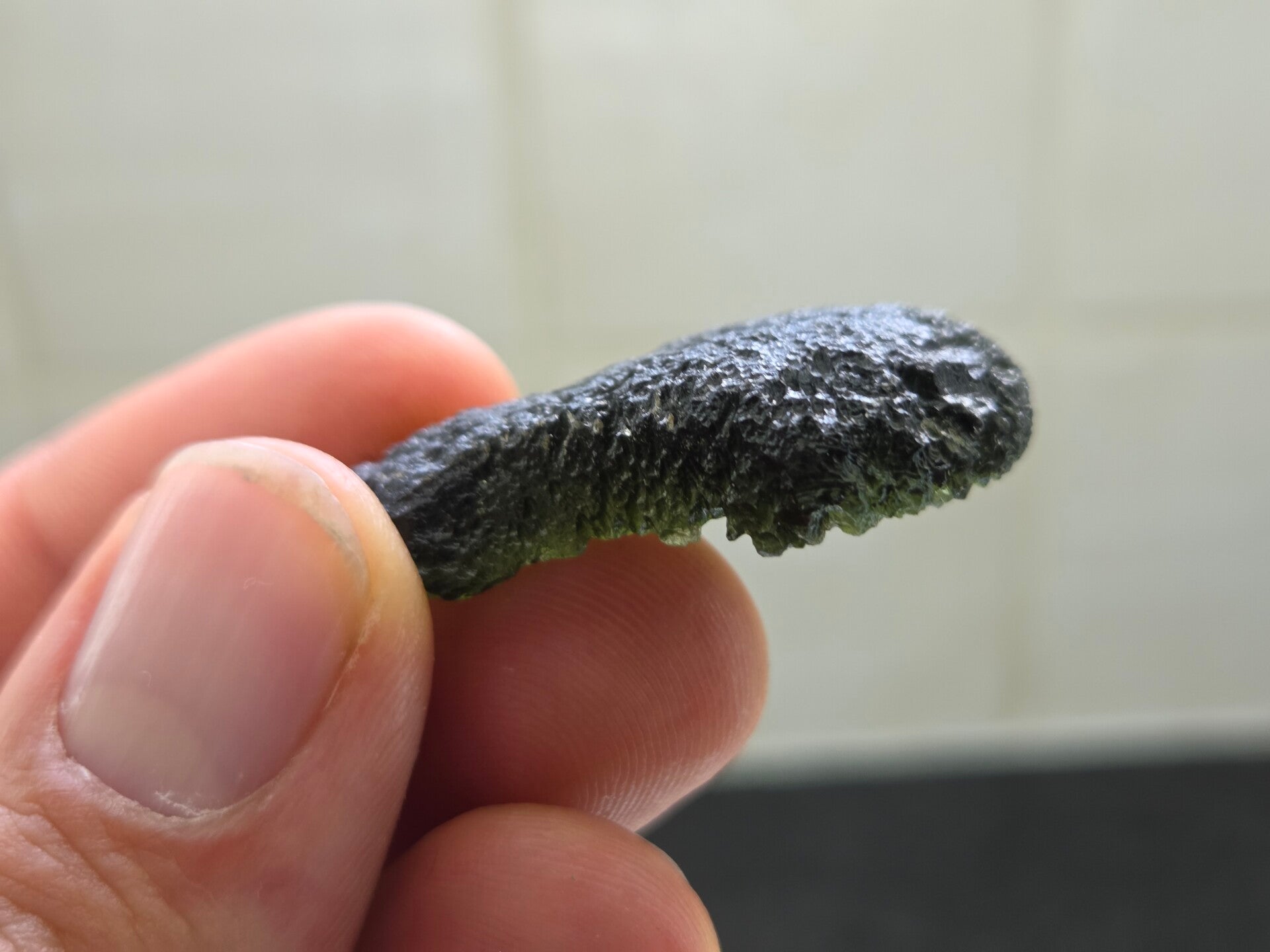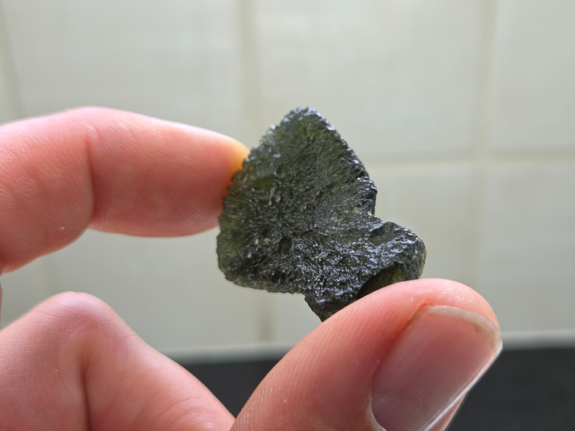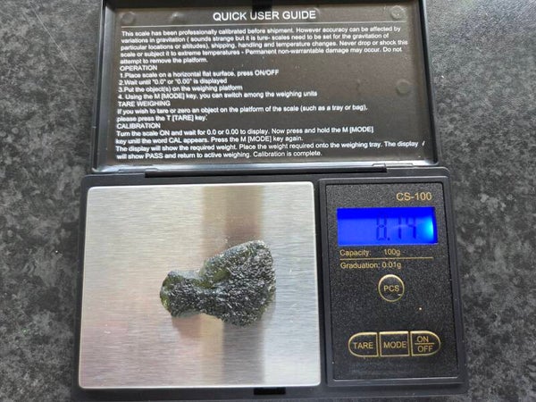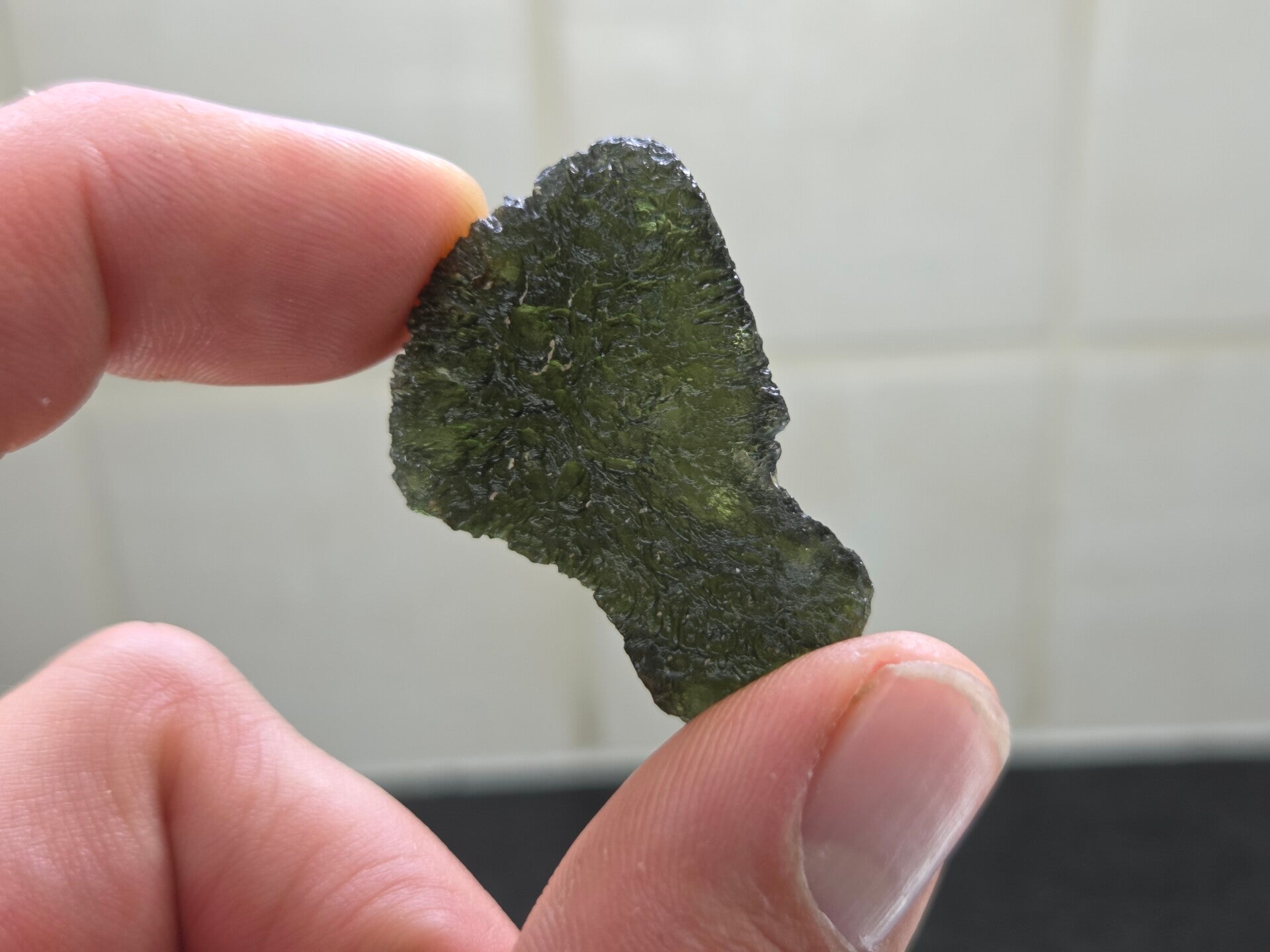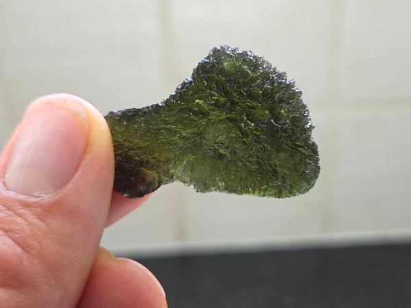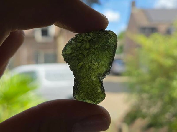 een groot stuk moldaviet uit nesmen hurka, tsjechië van 8,15 gram bij 3,6 cm bij 2,7 cm bij 1,1 cm