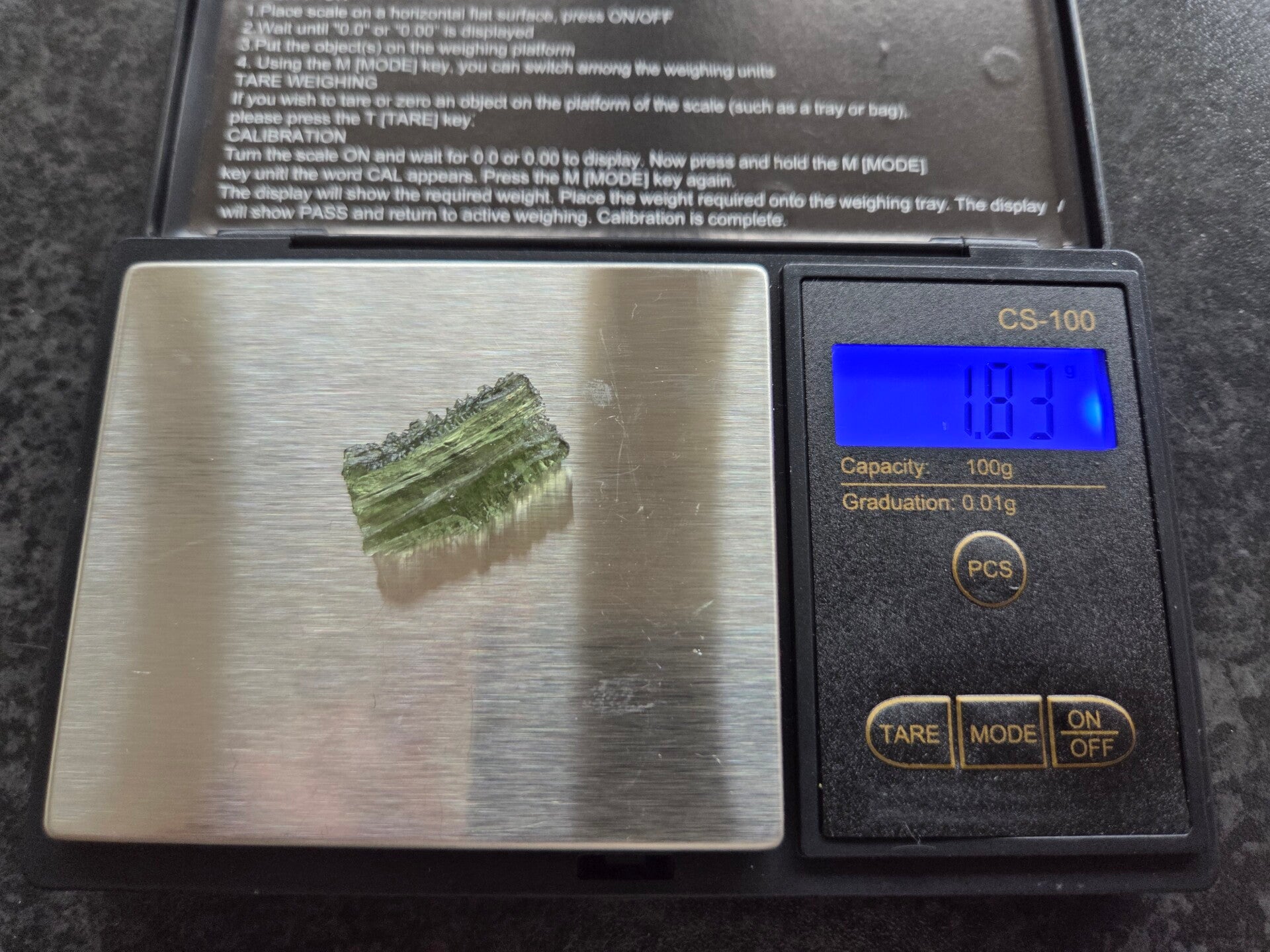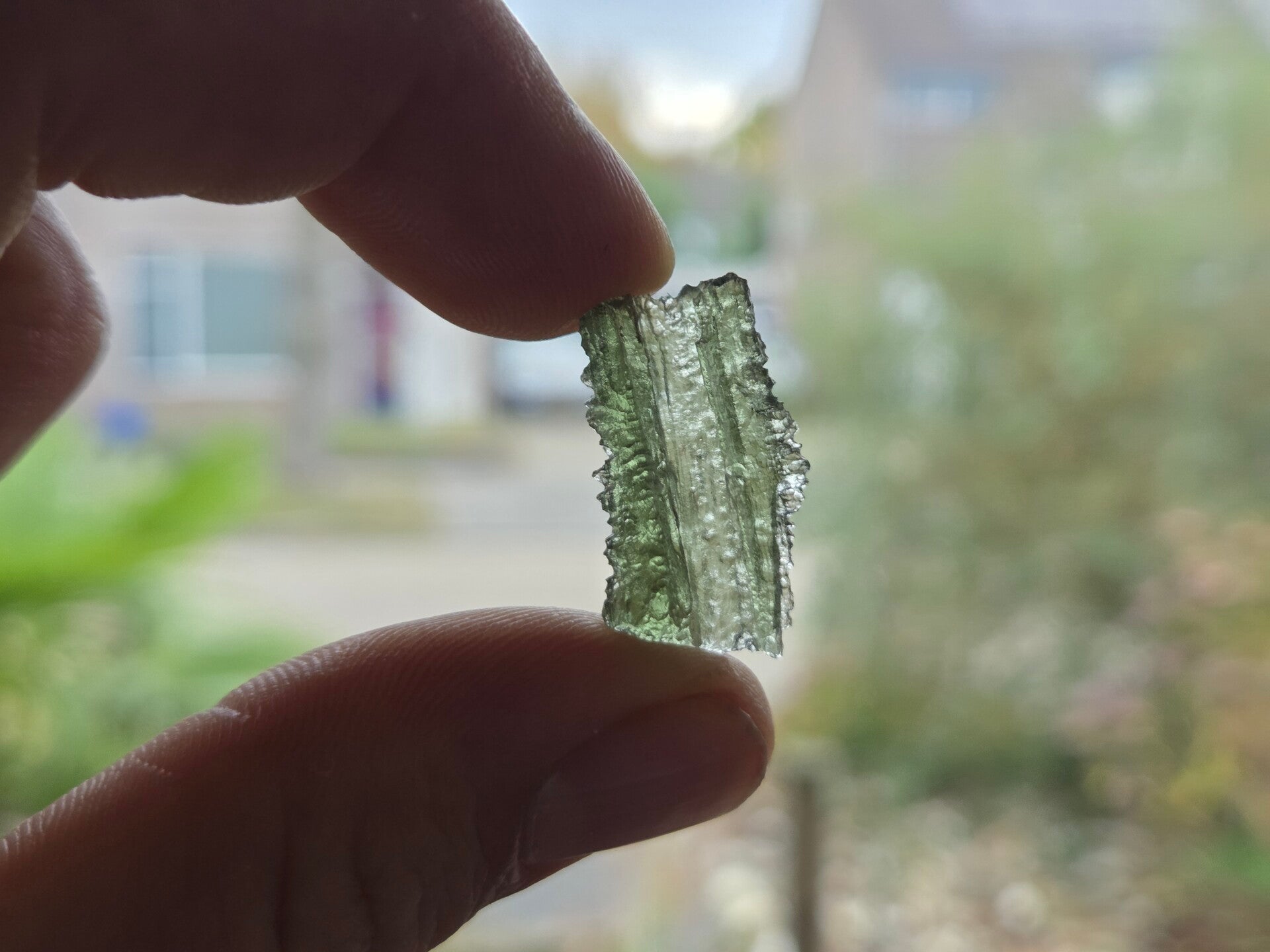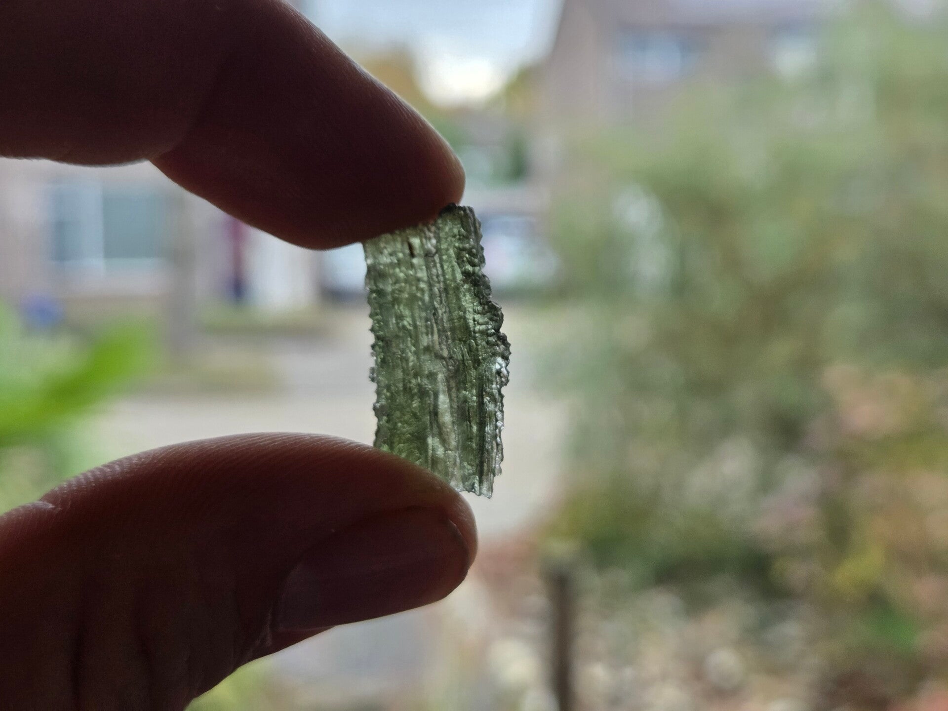 een stukje moldaviet uit nesmen, silazka, tsjechië van 1,85 gram en 2,3 cm bij 1,5 cm bij 0,7 cm