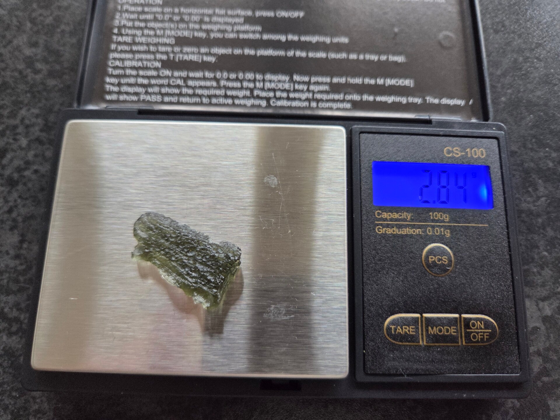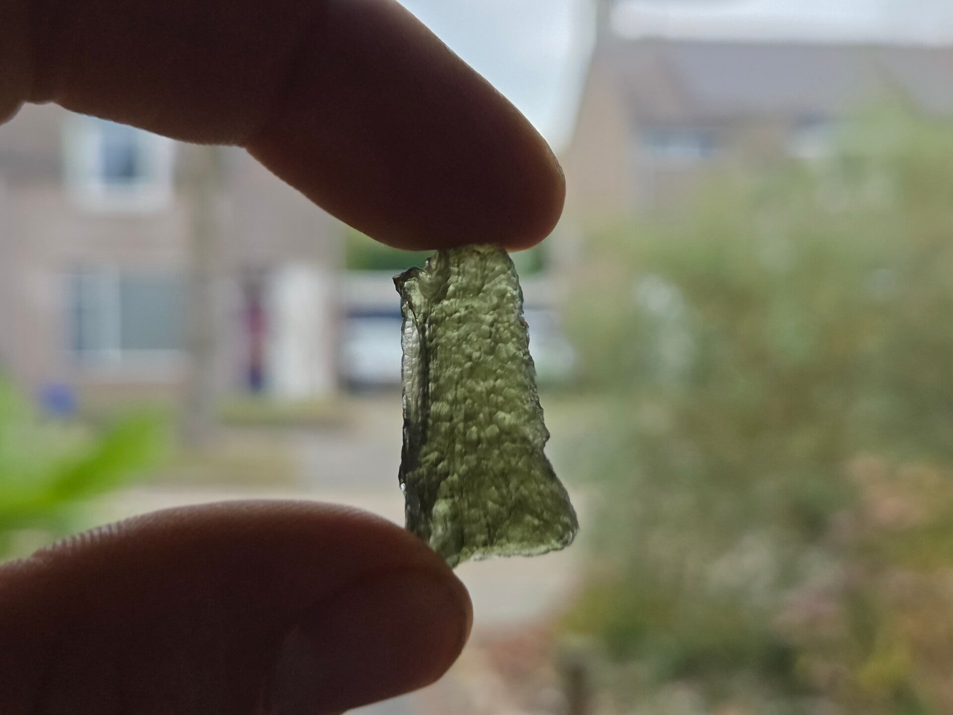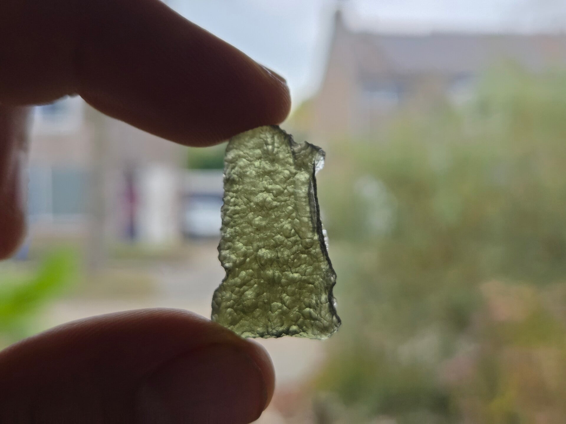 een stukje moldaviet uit nesmen, silazka, tsjechië van 2,87 gram en 2,8 cm bij 1,7 cm bij 0,5 cm