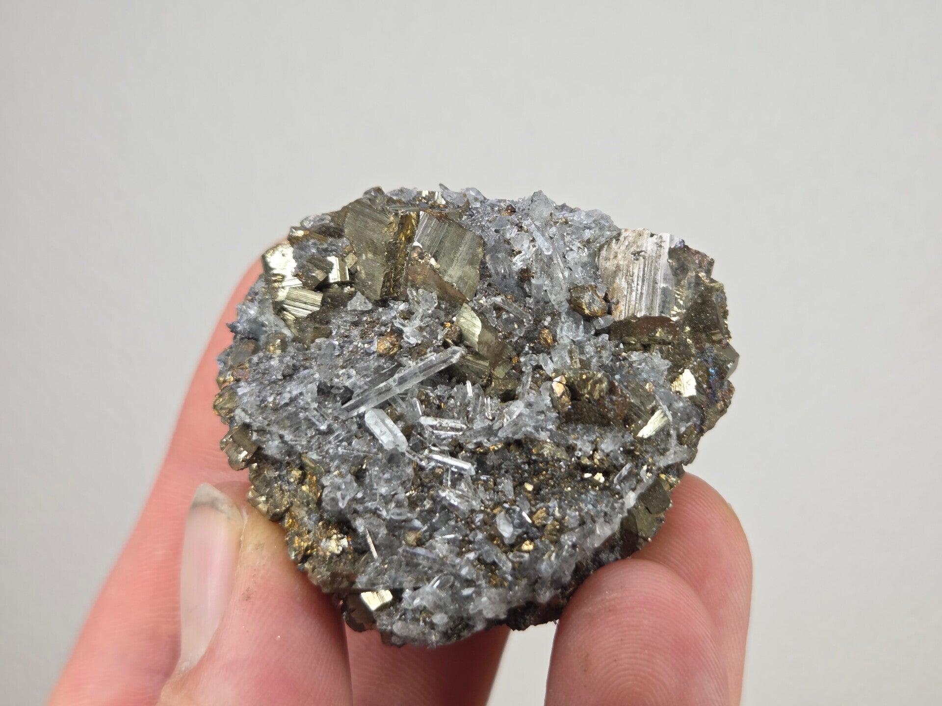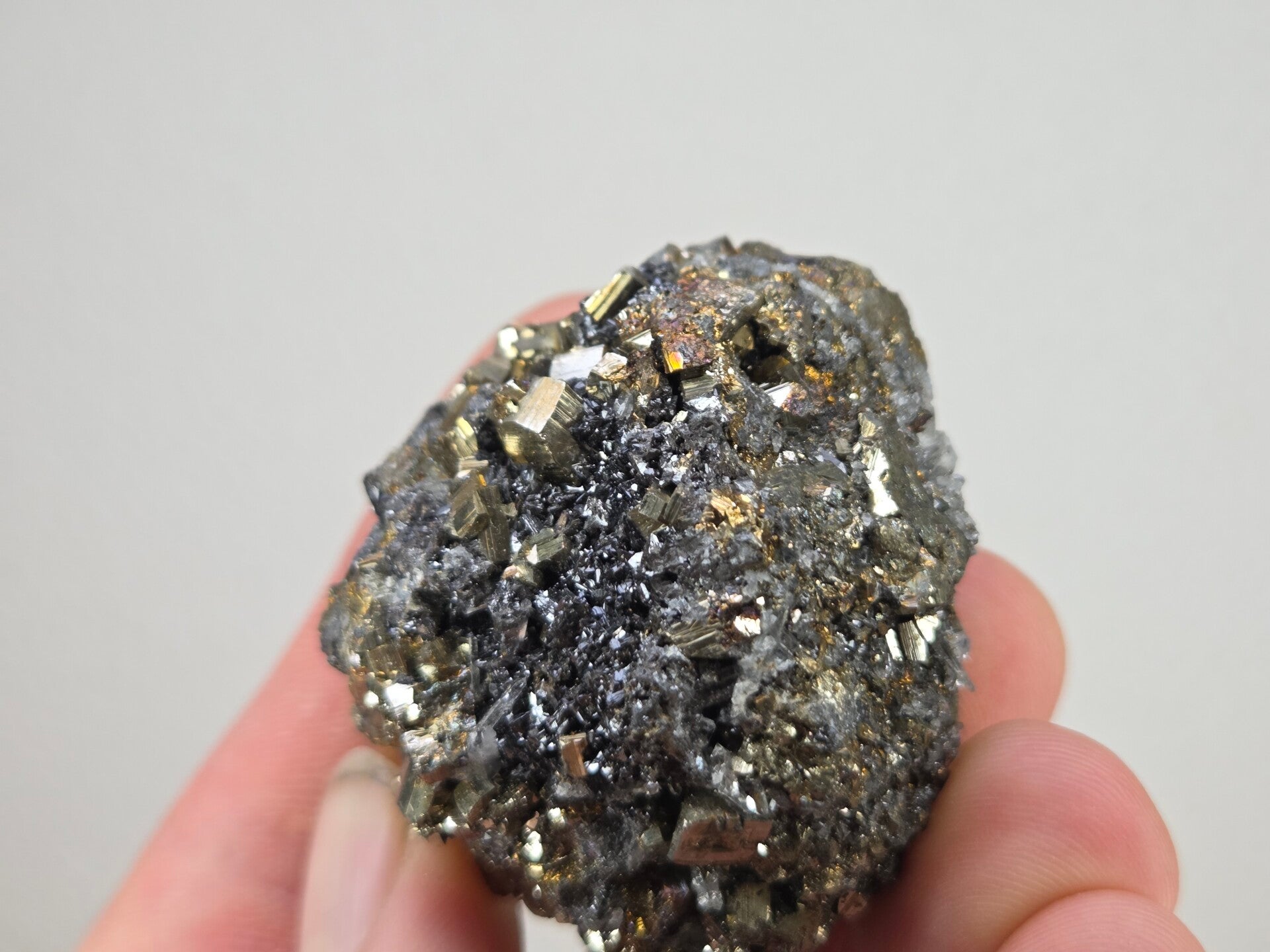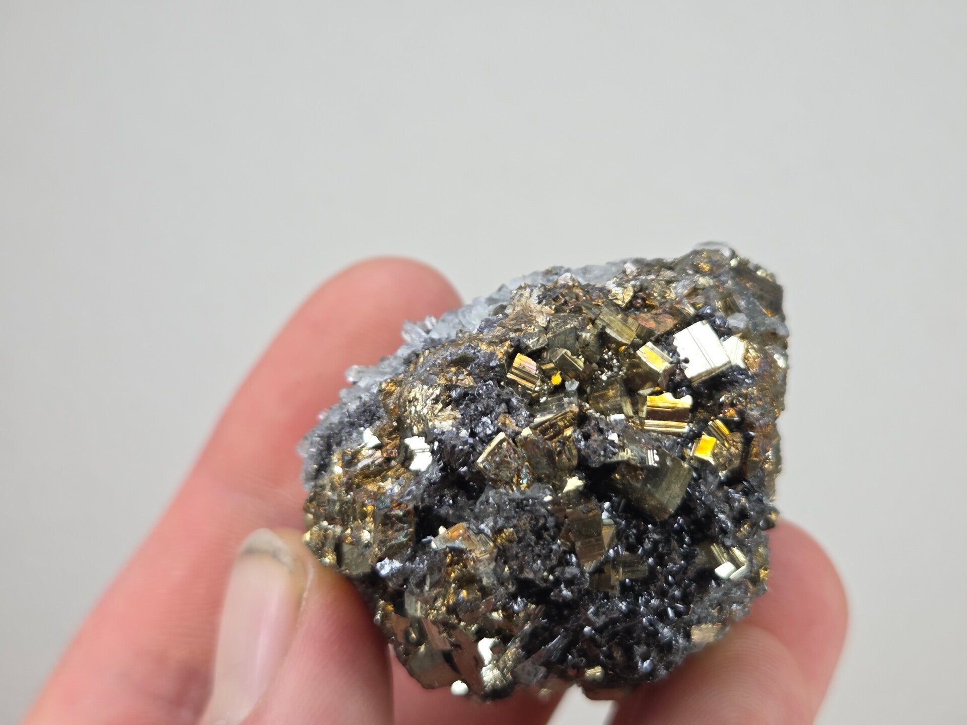 een stukje pyriet, galeniet en kwarts uit madan, bulgarije van 5 cm bij 4,9 cm bij 2,8 cm