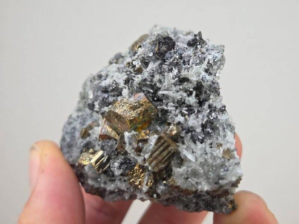 een stukje pyriet, galeniet en kwarts uit madan, bulgarije van 5,8 cm bij 5,6 cm bij 3,8 cm