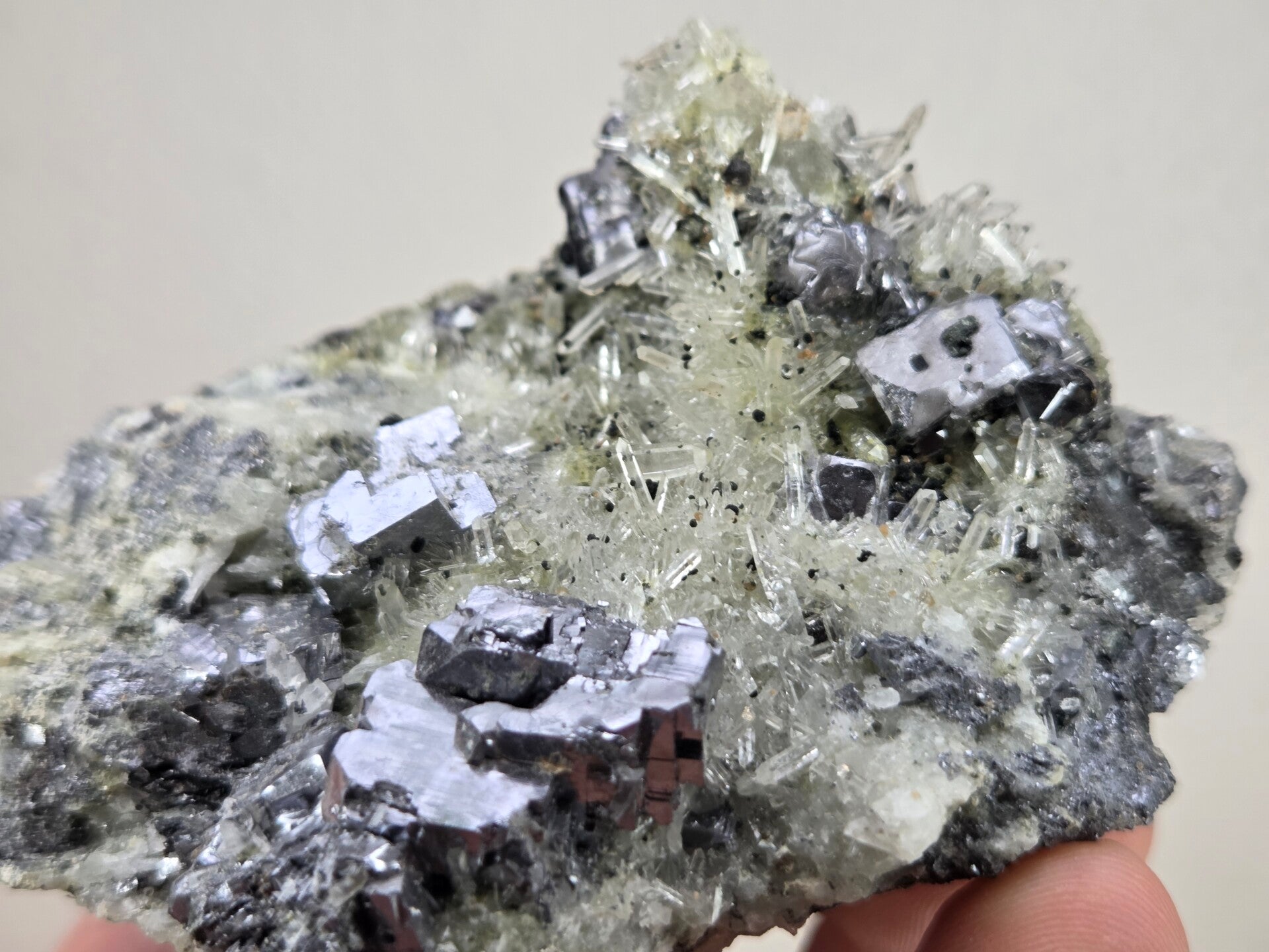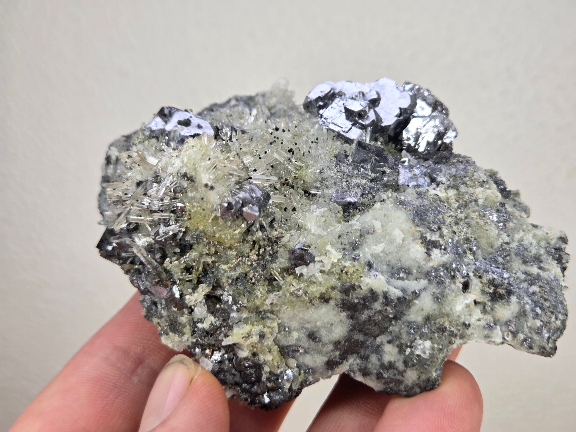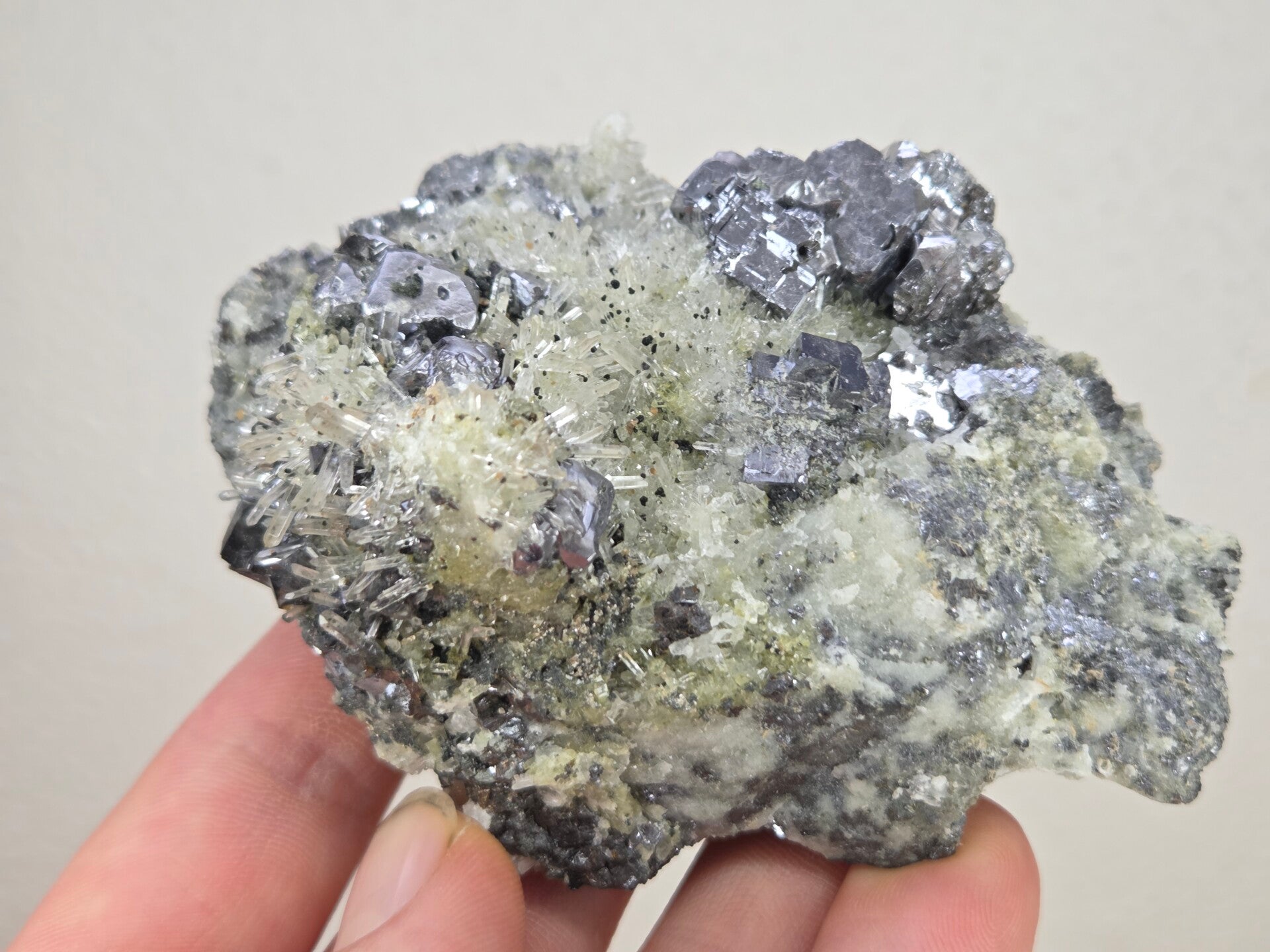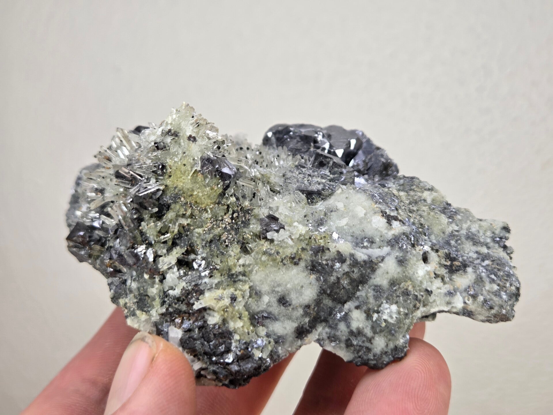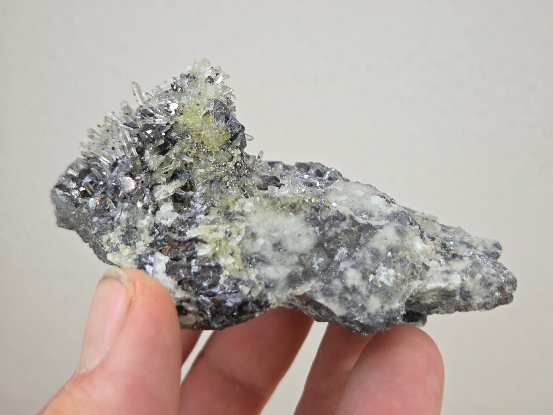 een stukje galeniet met heldere kwarts uit madan, bulgarije van 9,4 cm bij 7 cm bij 4,8 cm
