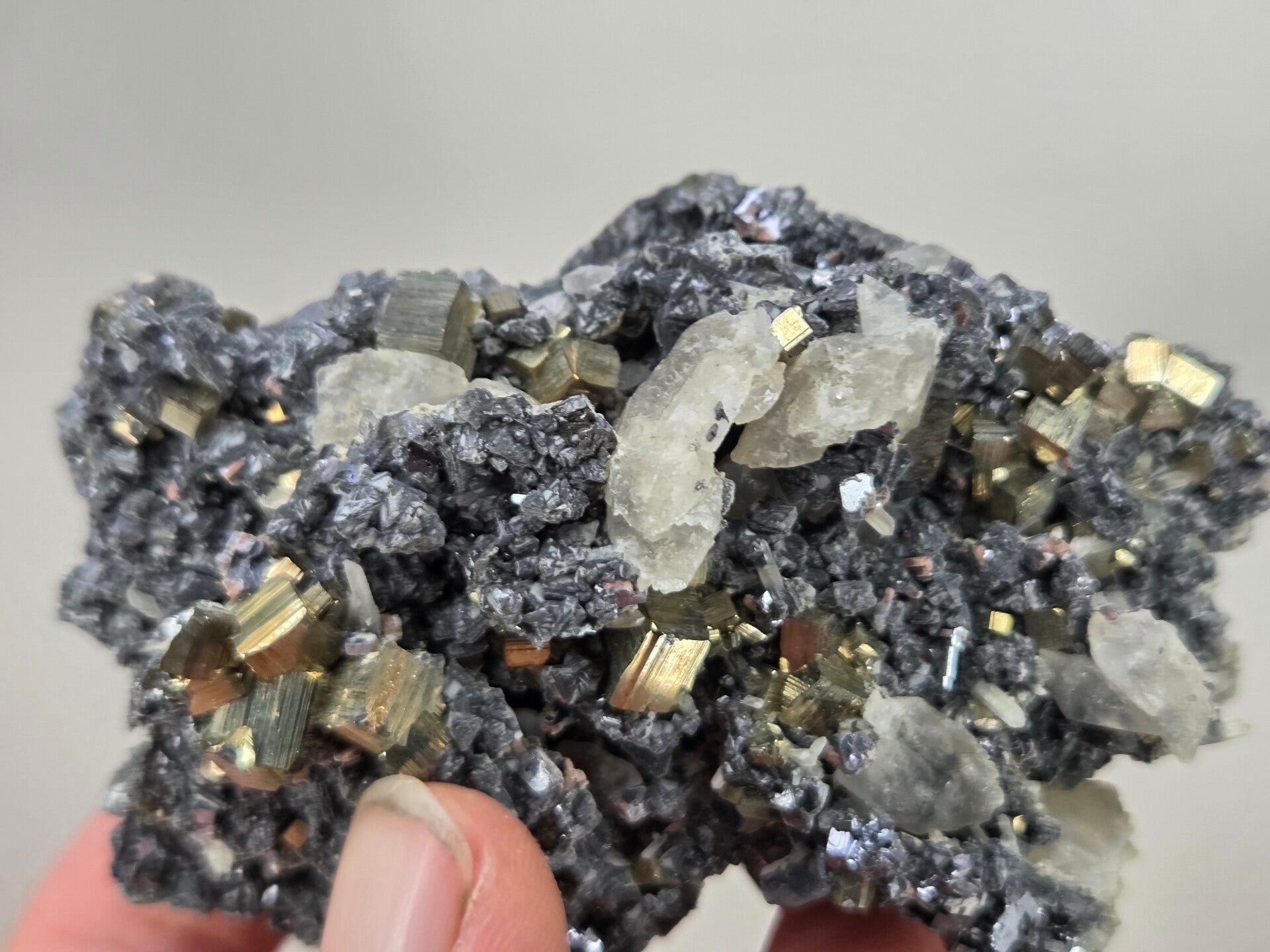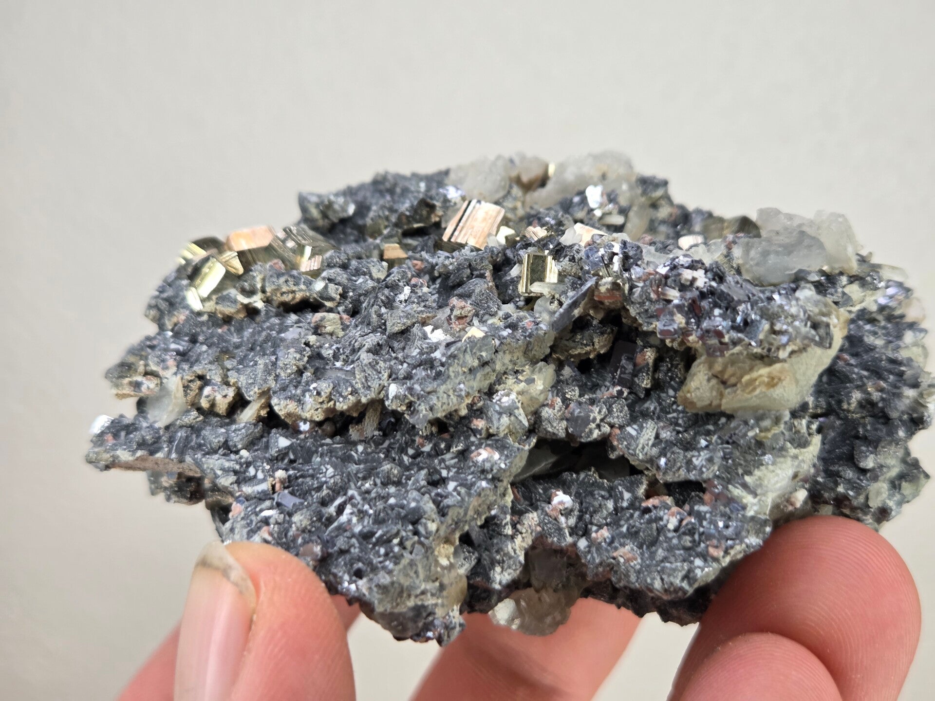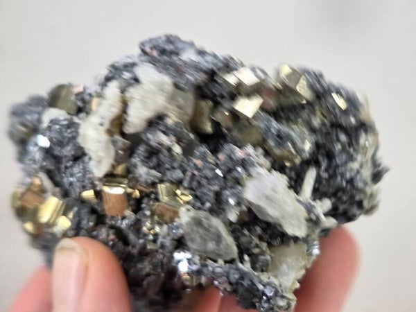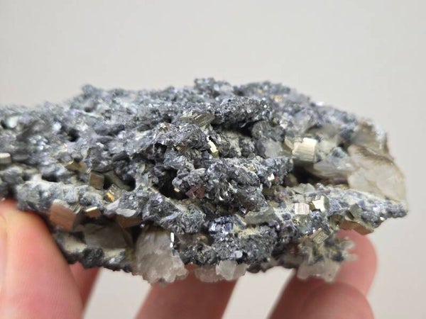 een stukje galeniet, kwarts en pyriet uit madan, bulgarije van 8,6 cm bij 6,1 cm bij 4,2 cm