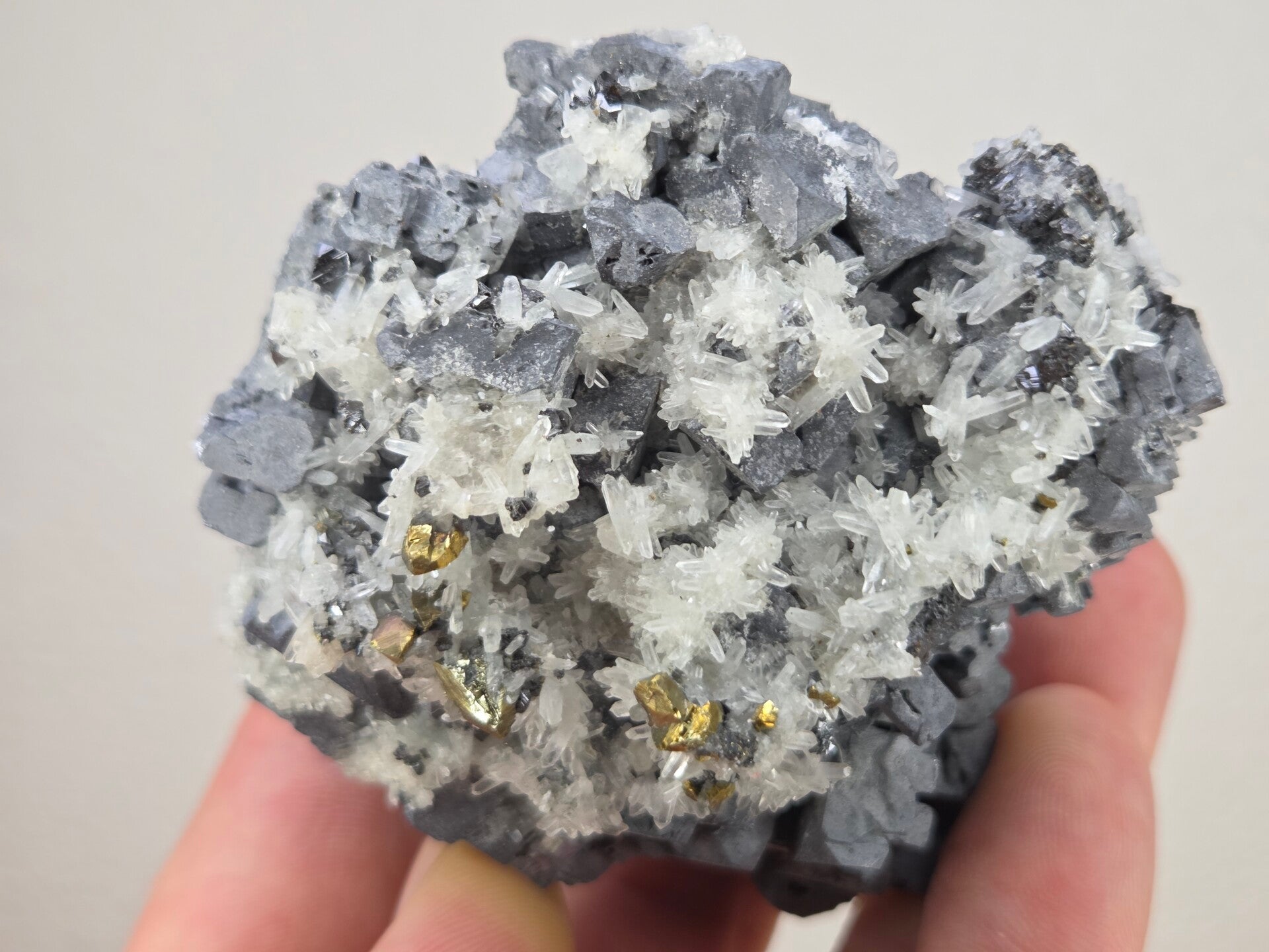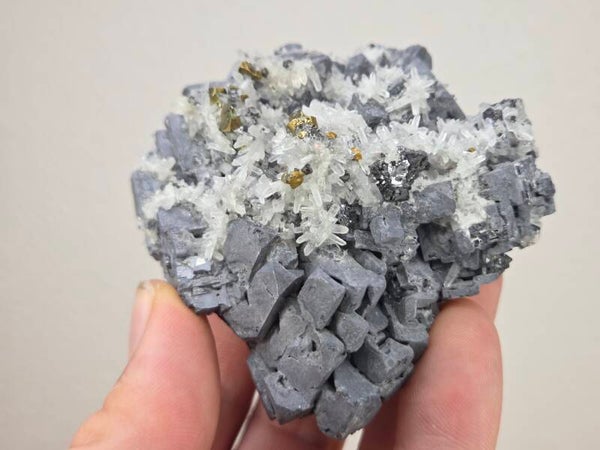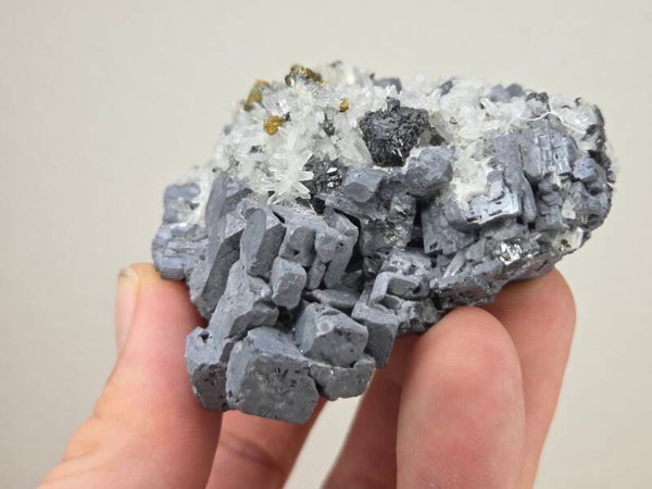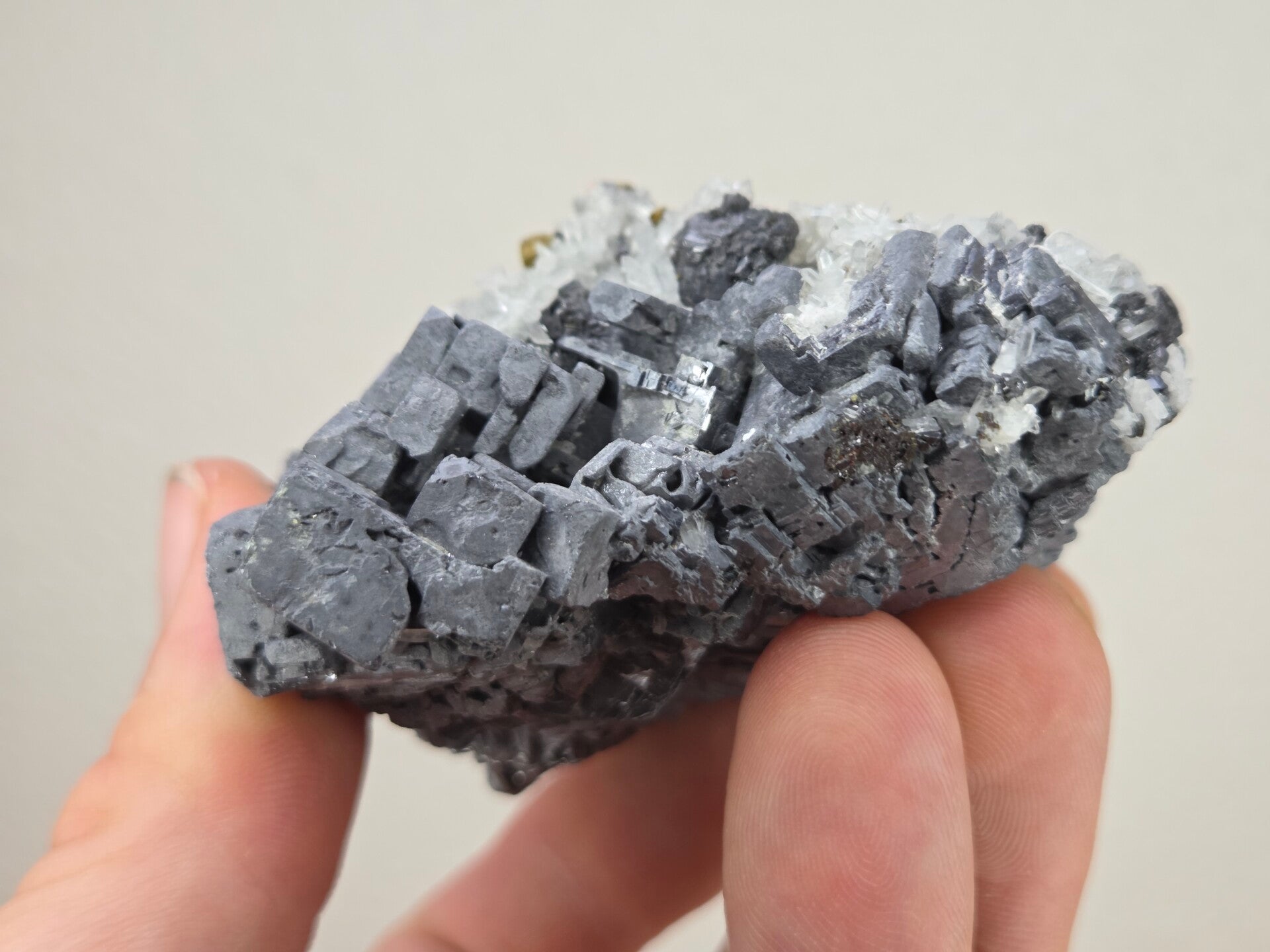 een stukje galeniet met witte kwarts uit madan, bulgarije van 6,8 cm bij 7 cm bij 4 cm