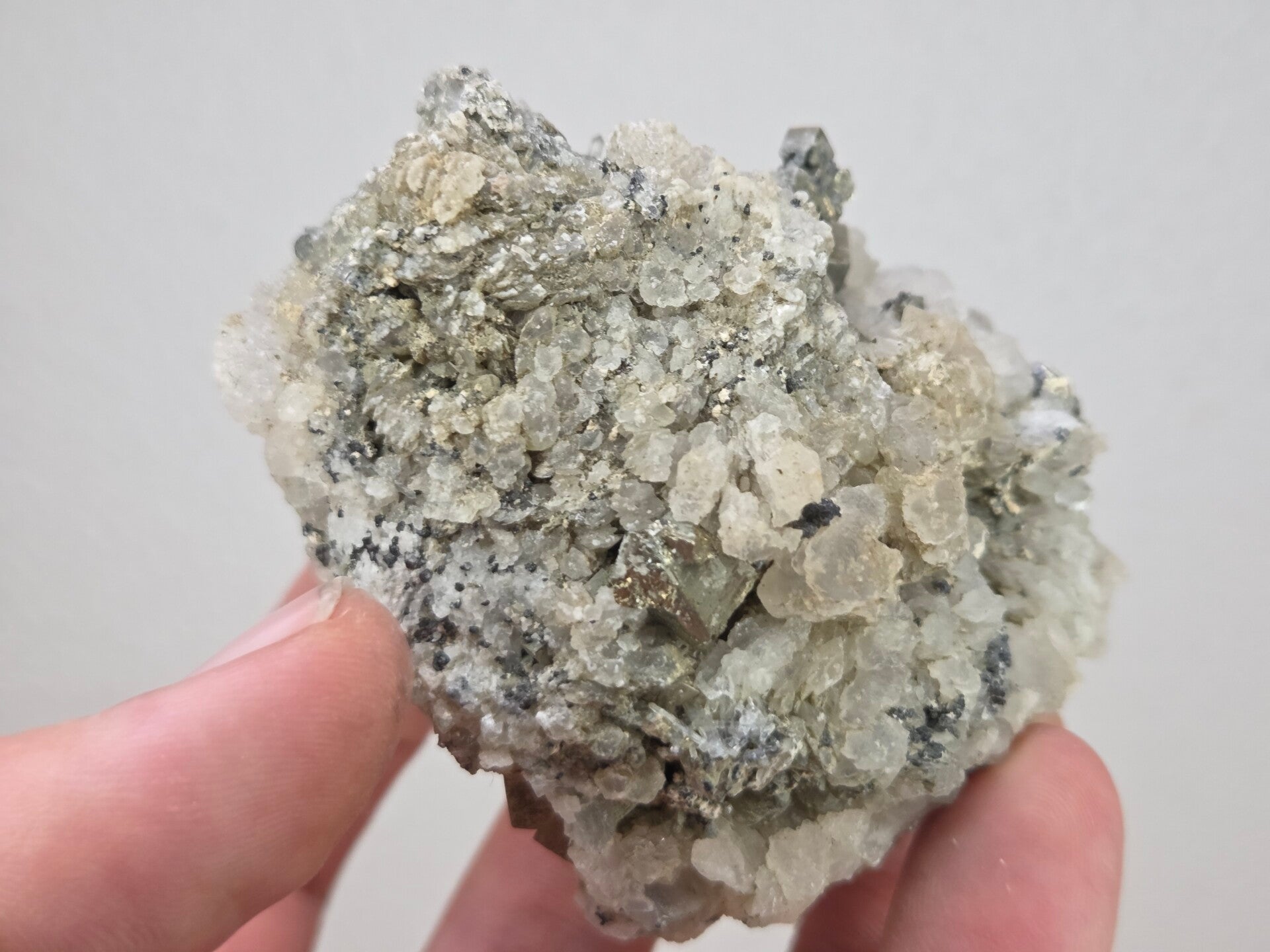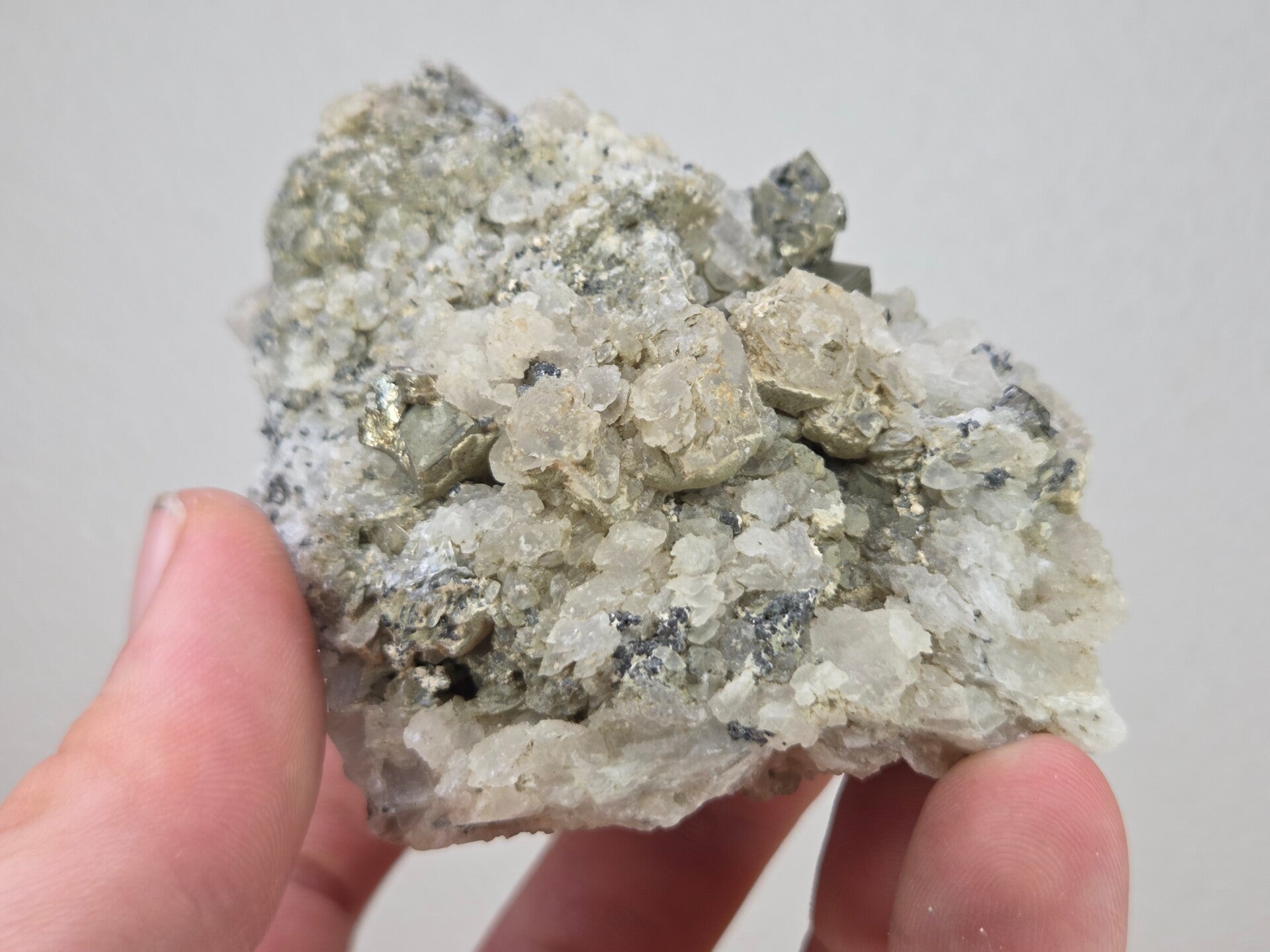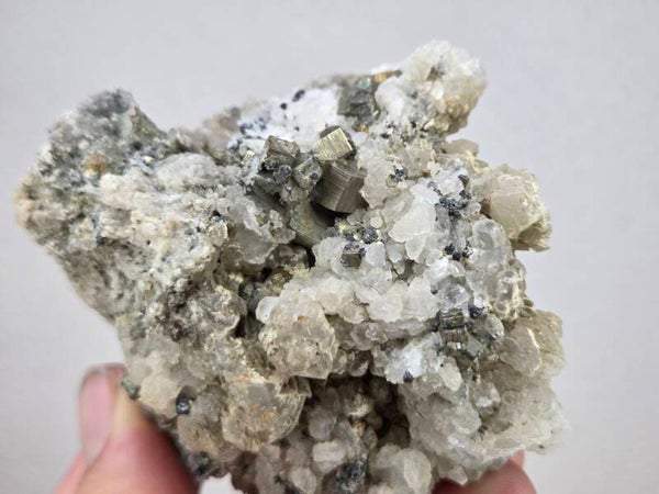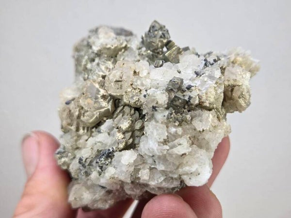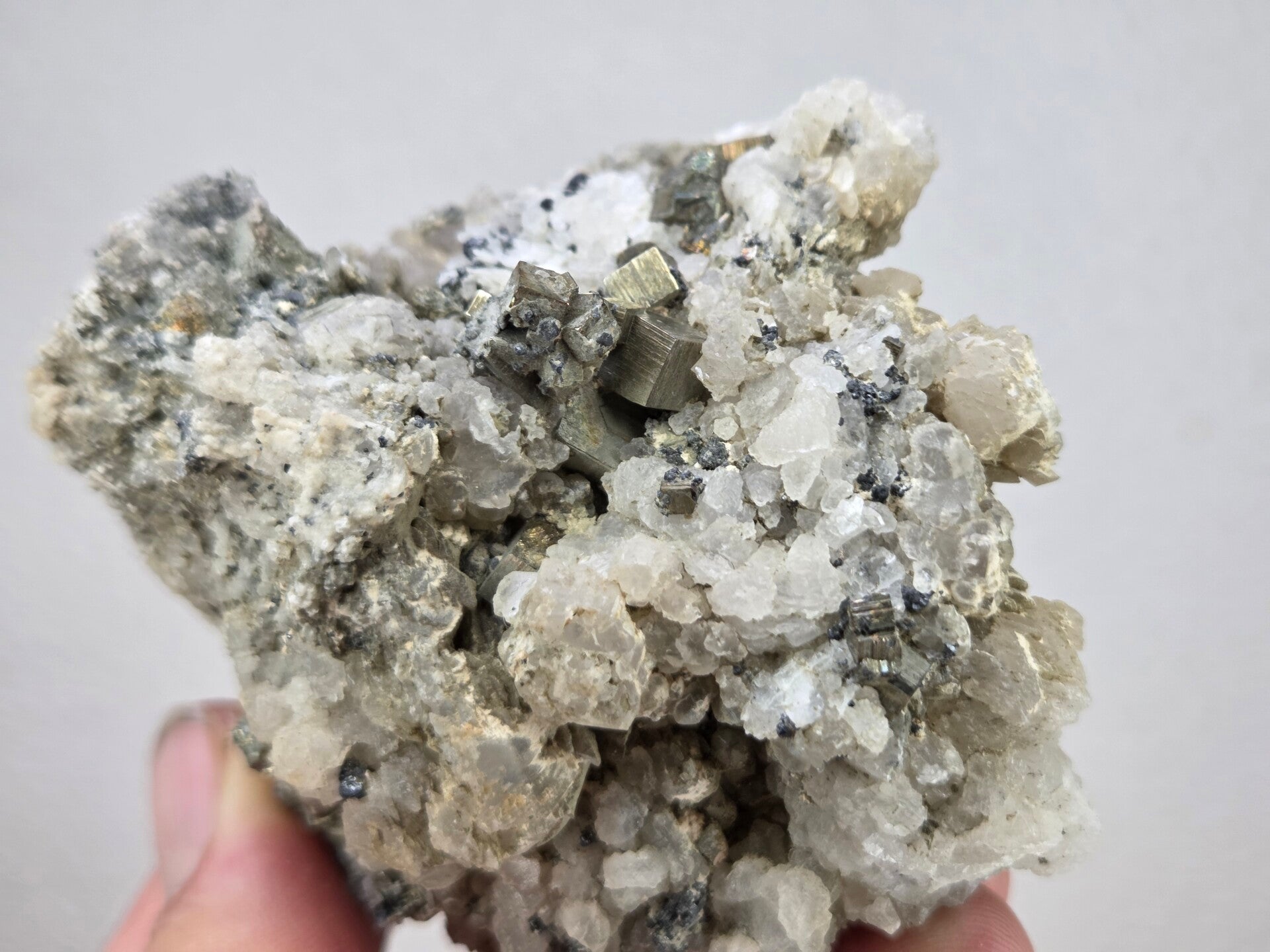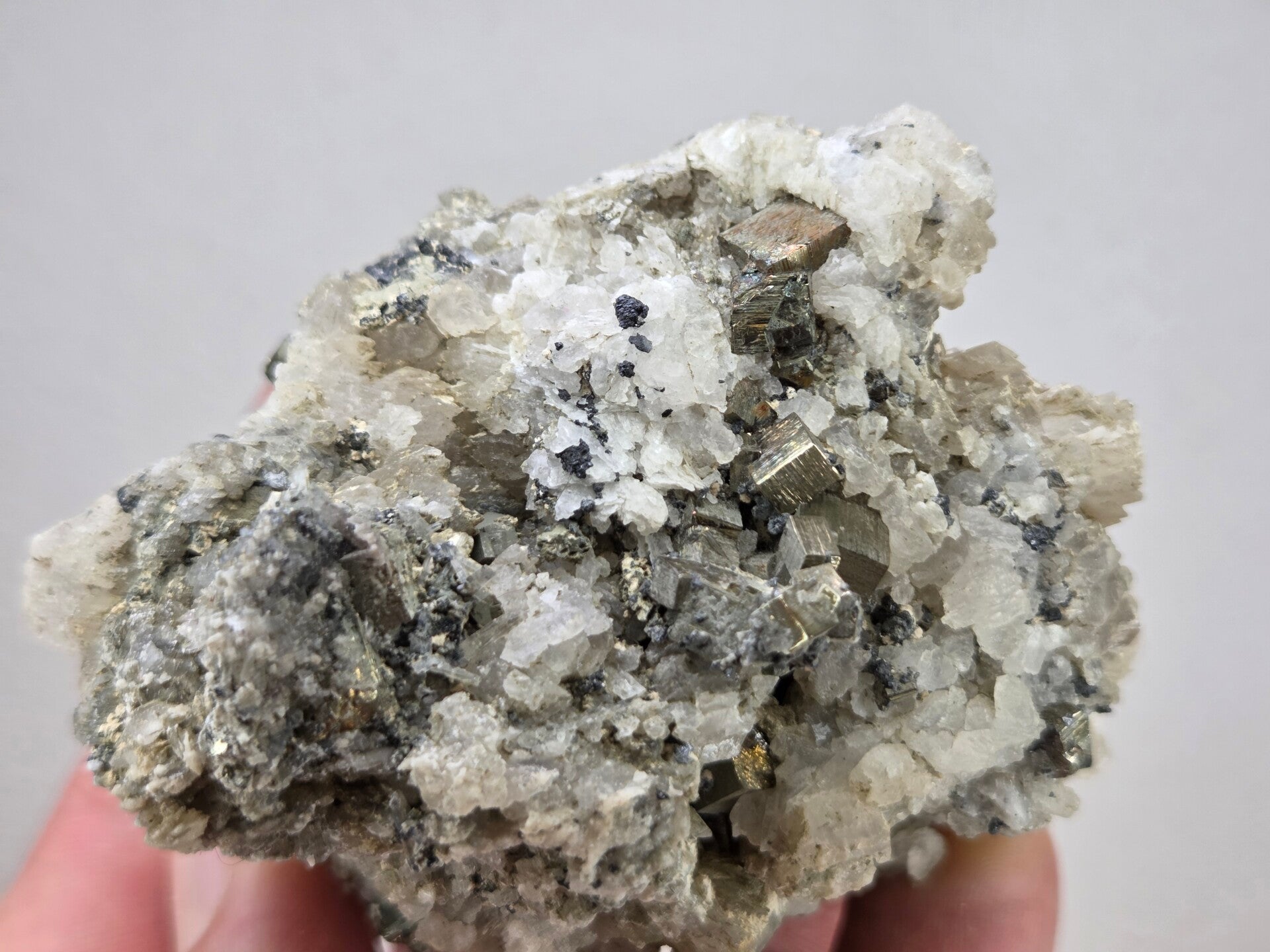 een stukje calciet met pyriet uit madan, bulgarije van 7,2 cm bij 6,1 cm bij 4,6 cm