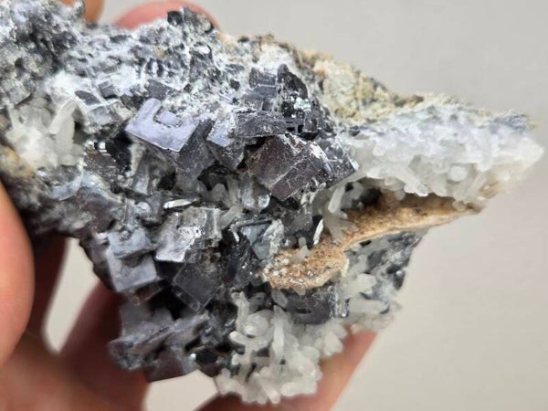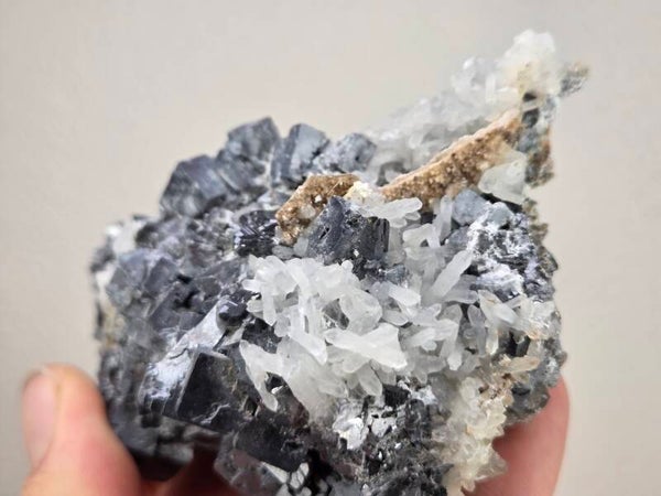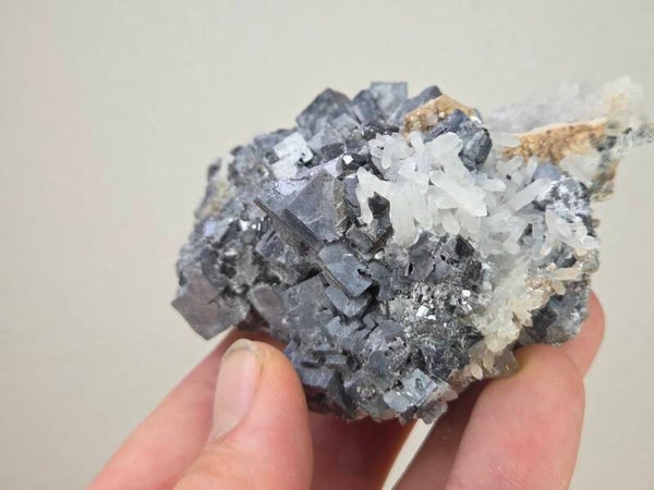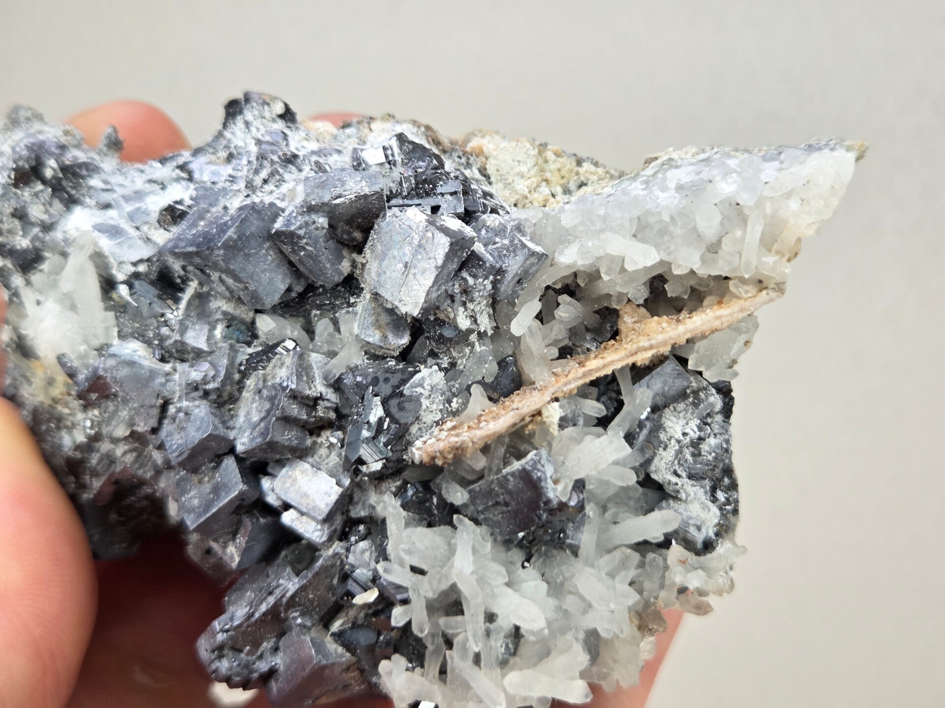 een stukje galeniet met kwarts uit madan, bulgarije van 8,6 cm bij 6,5 cm bij 4,2 cm