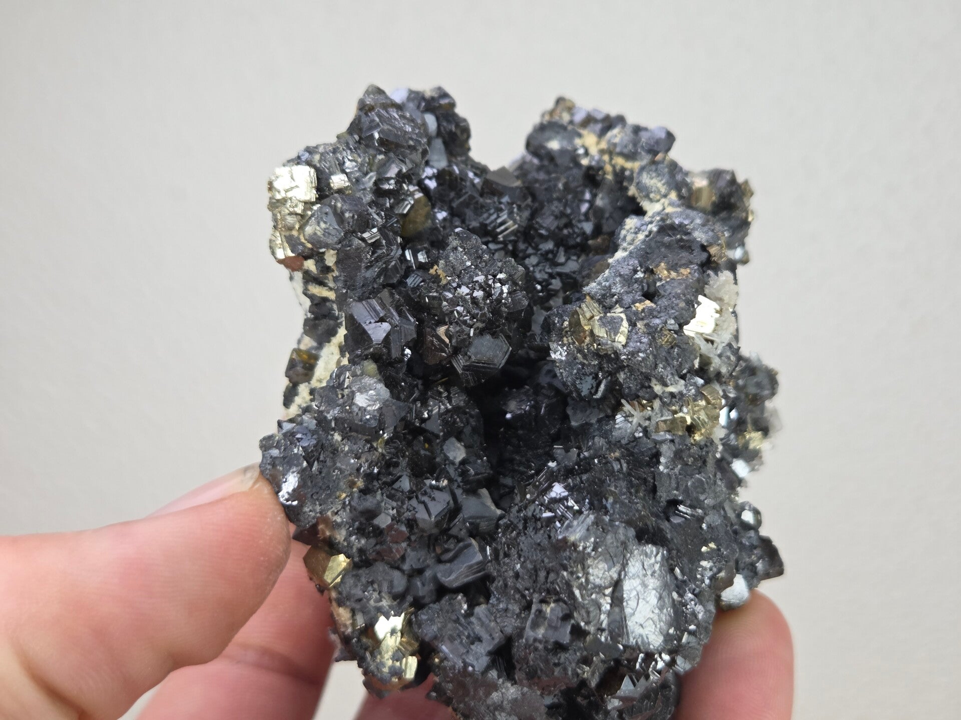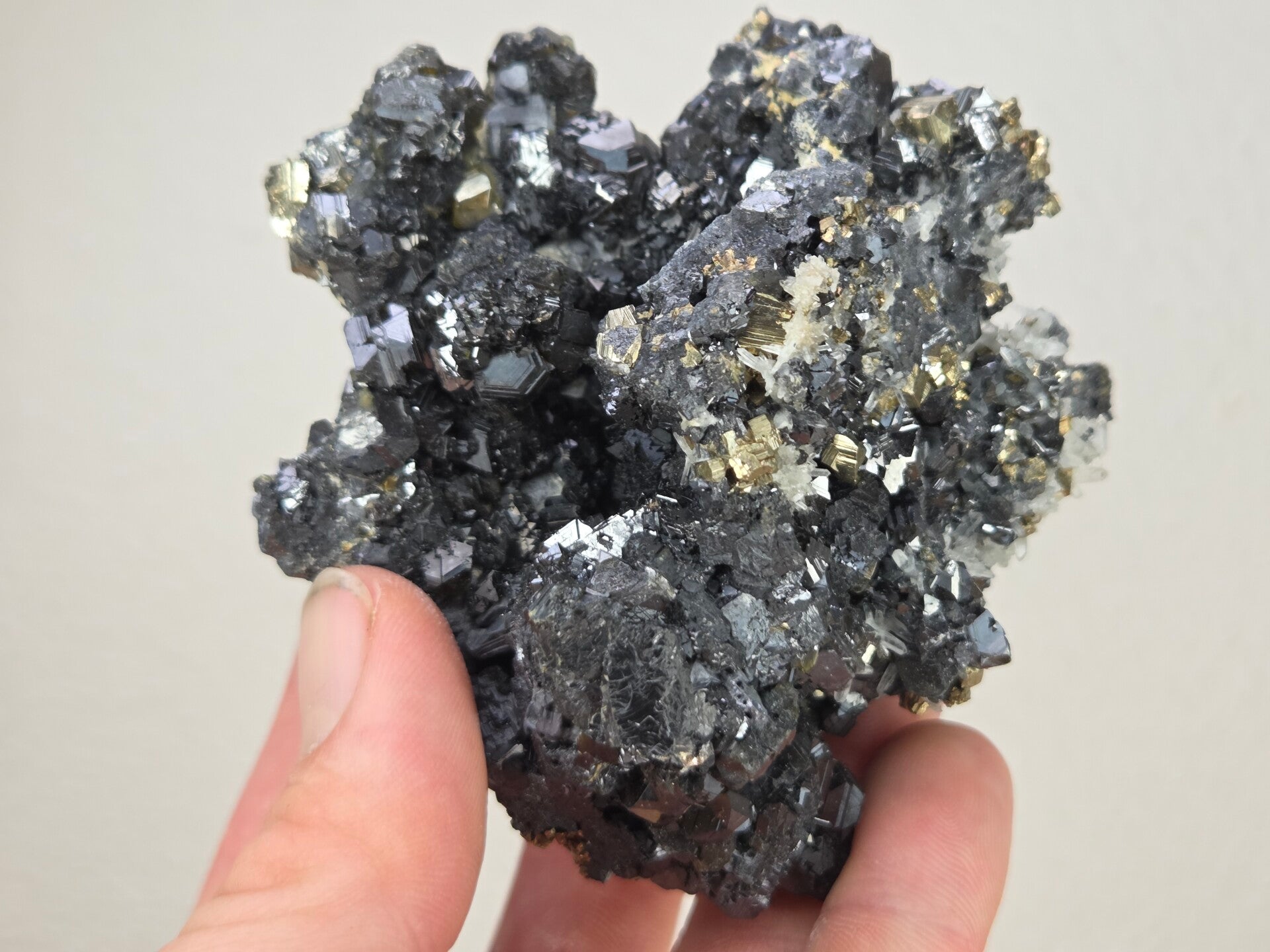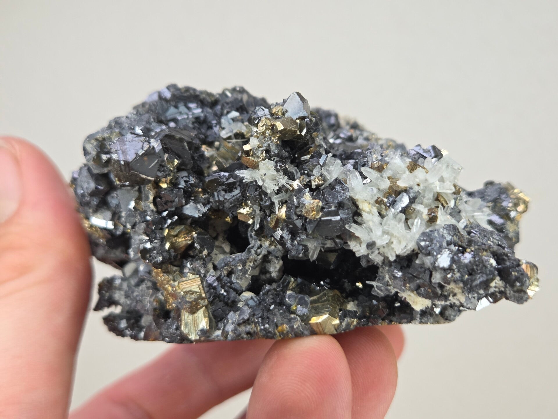 een stukje sphaleriet, pyriet en kwarts uit madan, bulgarije van 8,5 cm bij 8,8 cm bij 5 cm