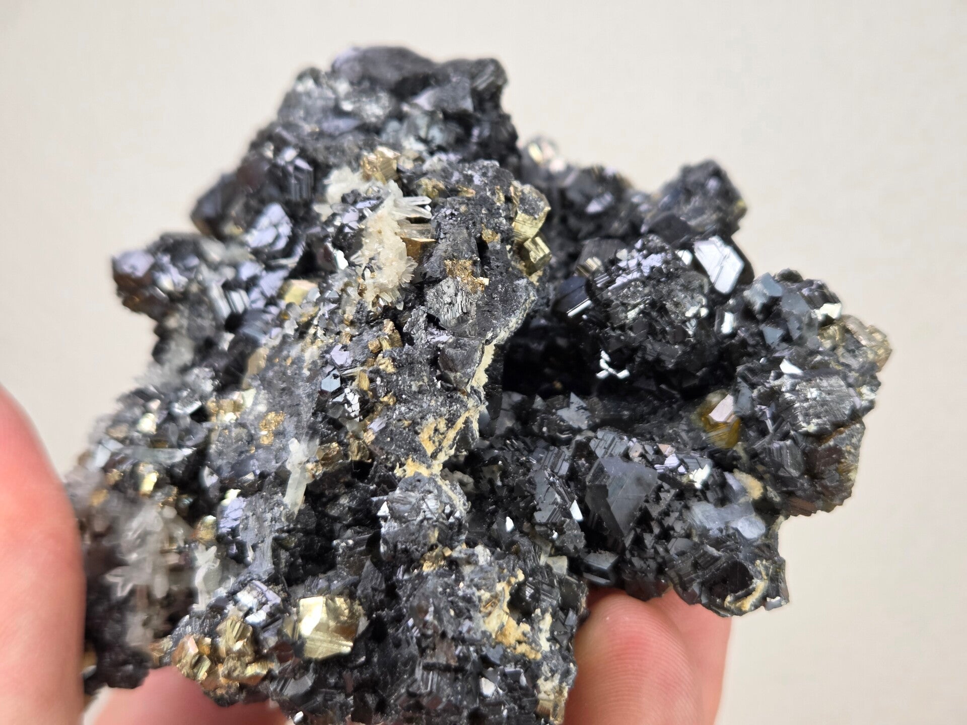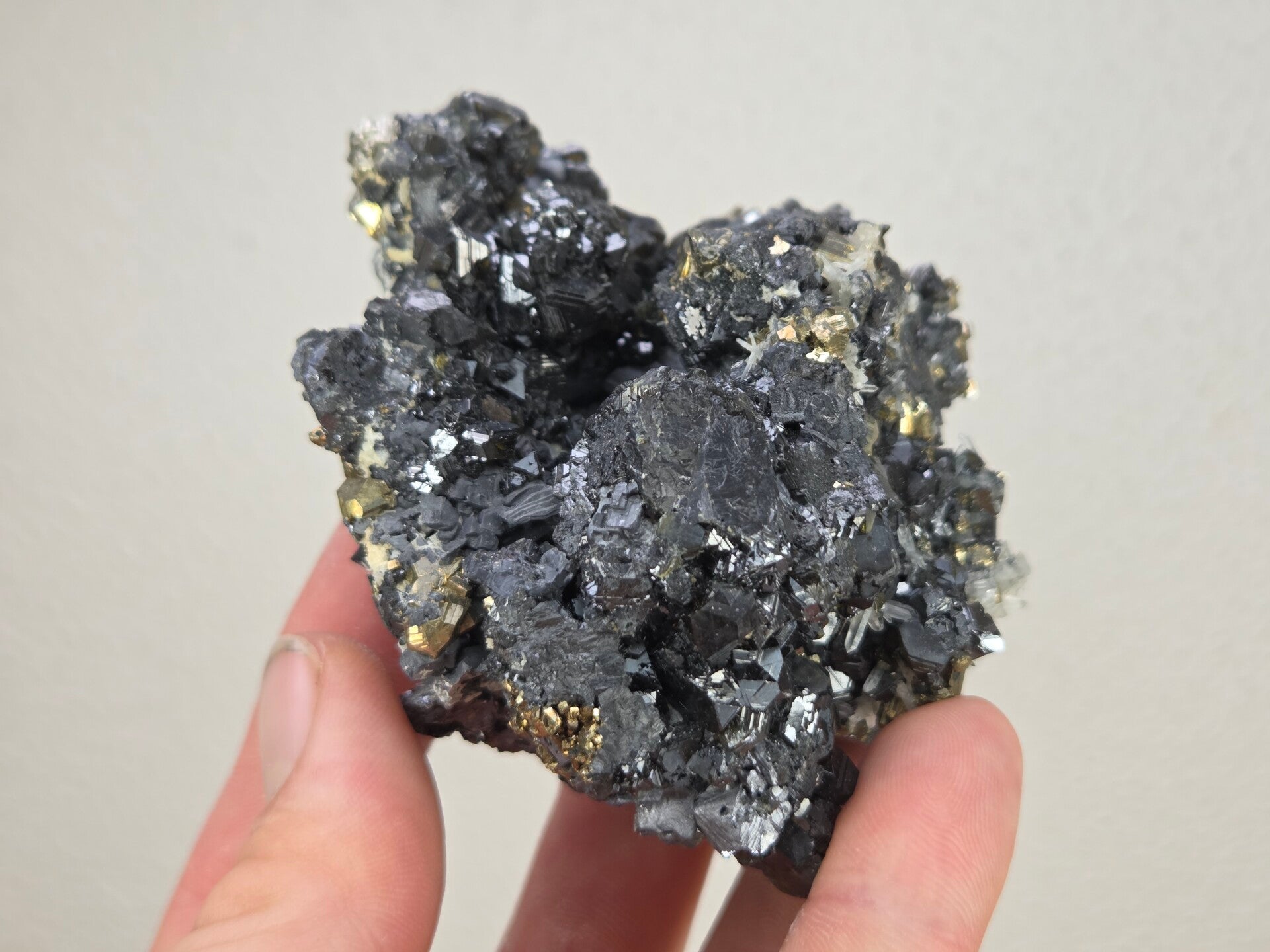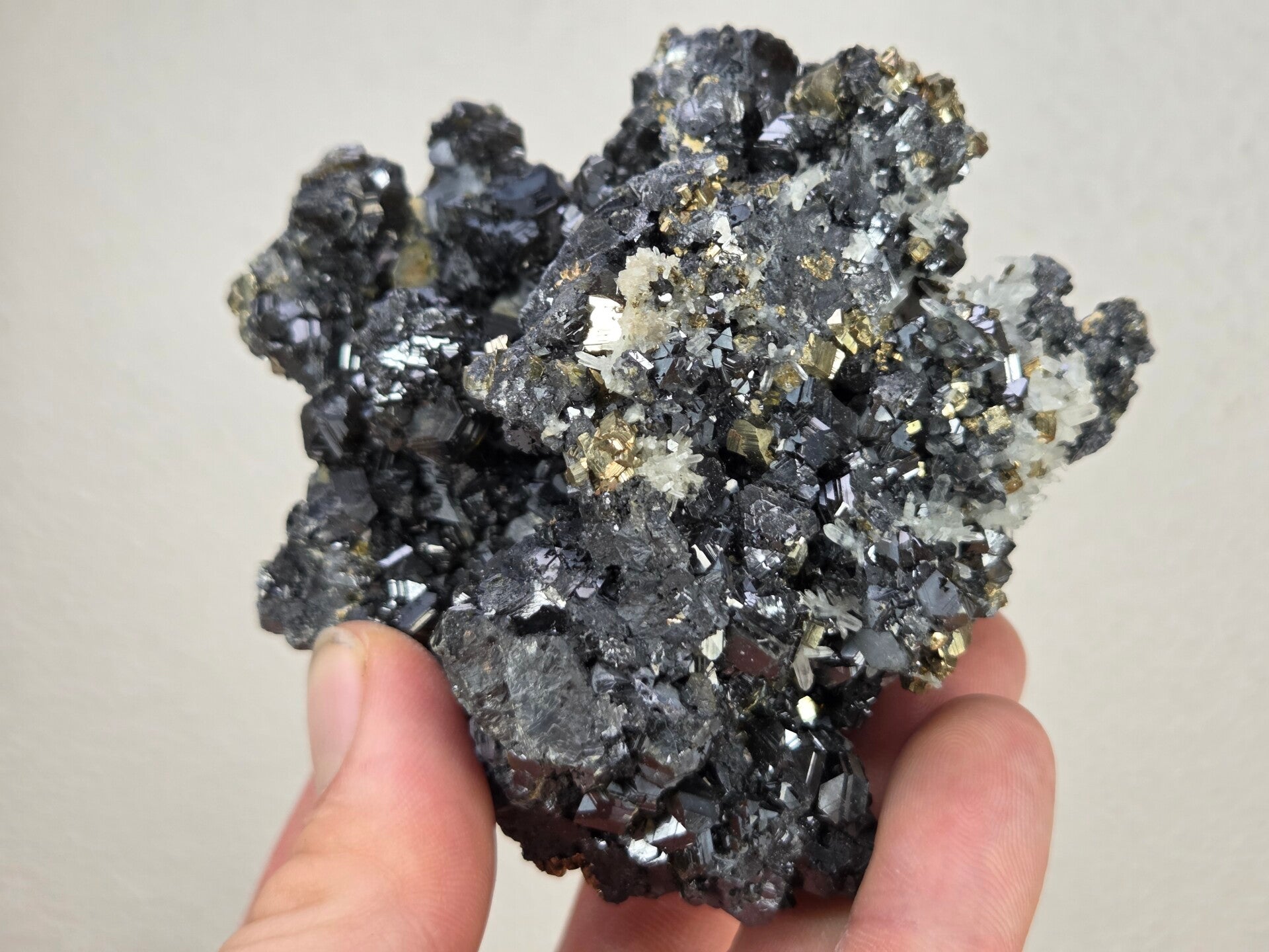 een stukje sphaleriet, pyriet en kwarts uit madan, bulgarije van 8,5 cm bij 8,8 cm bij 5 cm