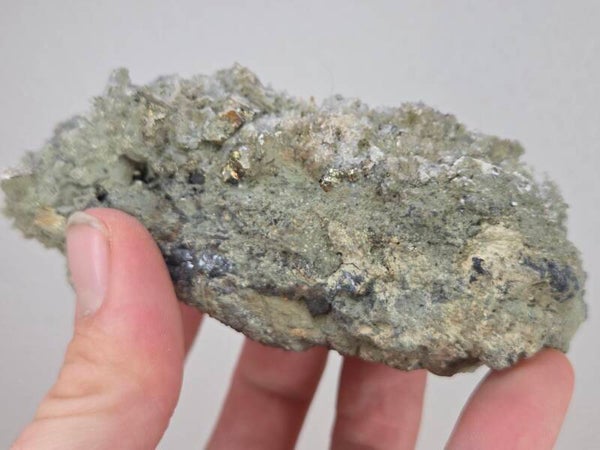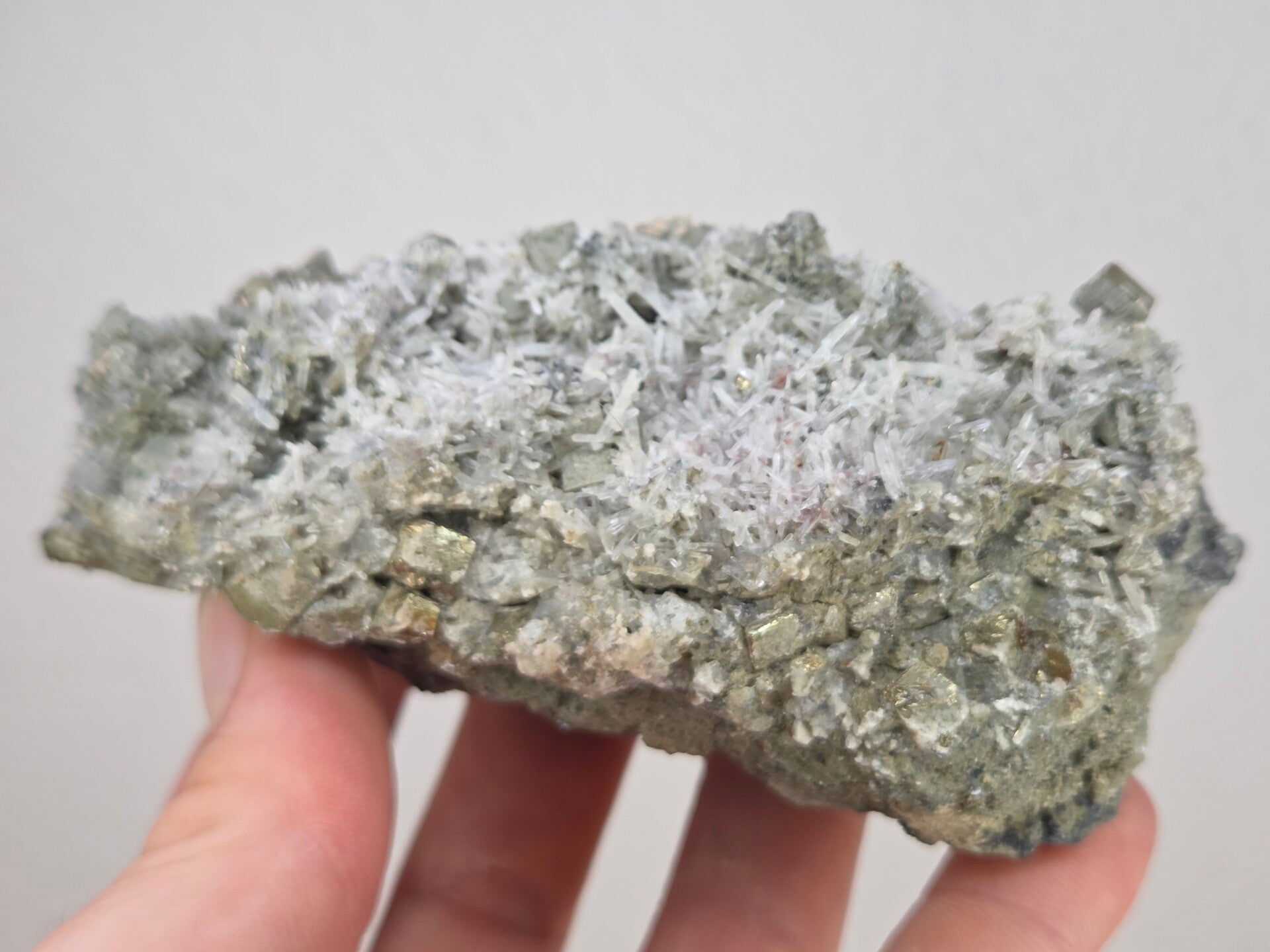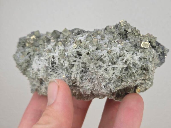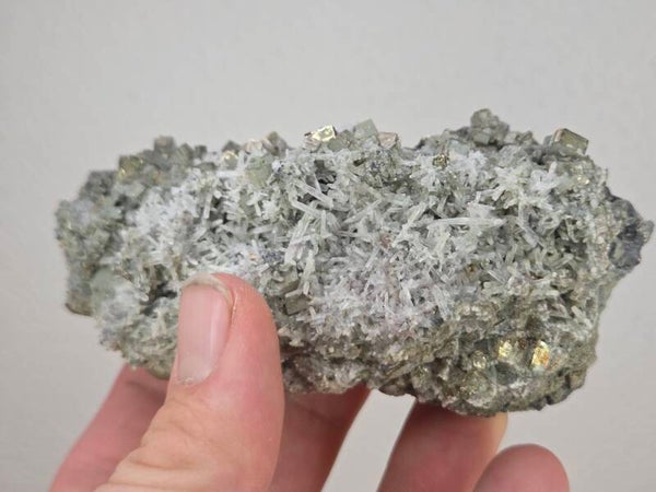 een stukje pyriet met kwart uit madan, bulgarije van 11 cm bij 5,5 cm bij 4,5 cm