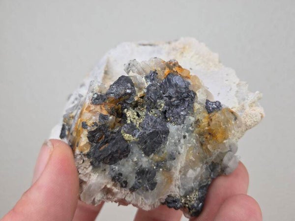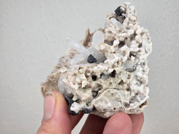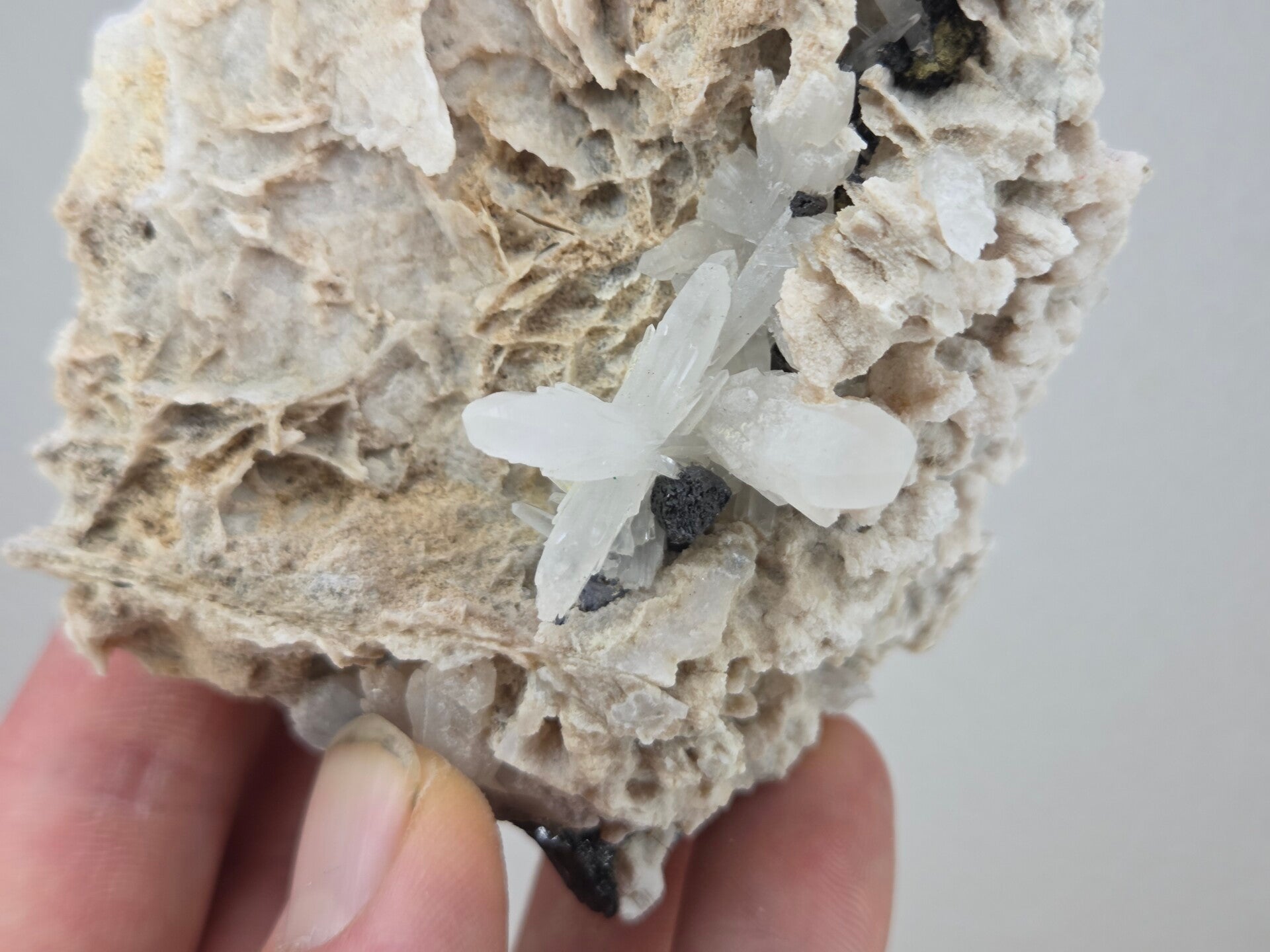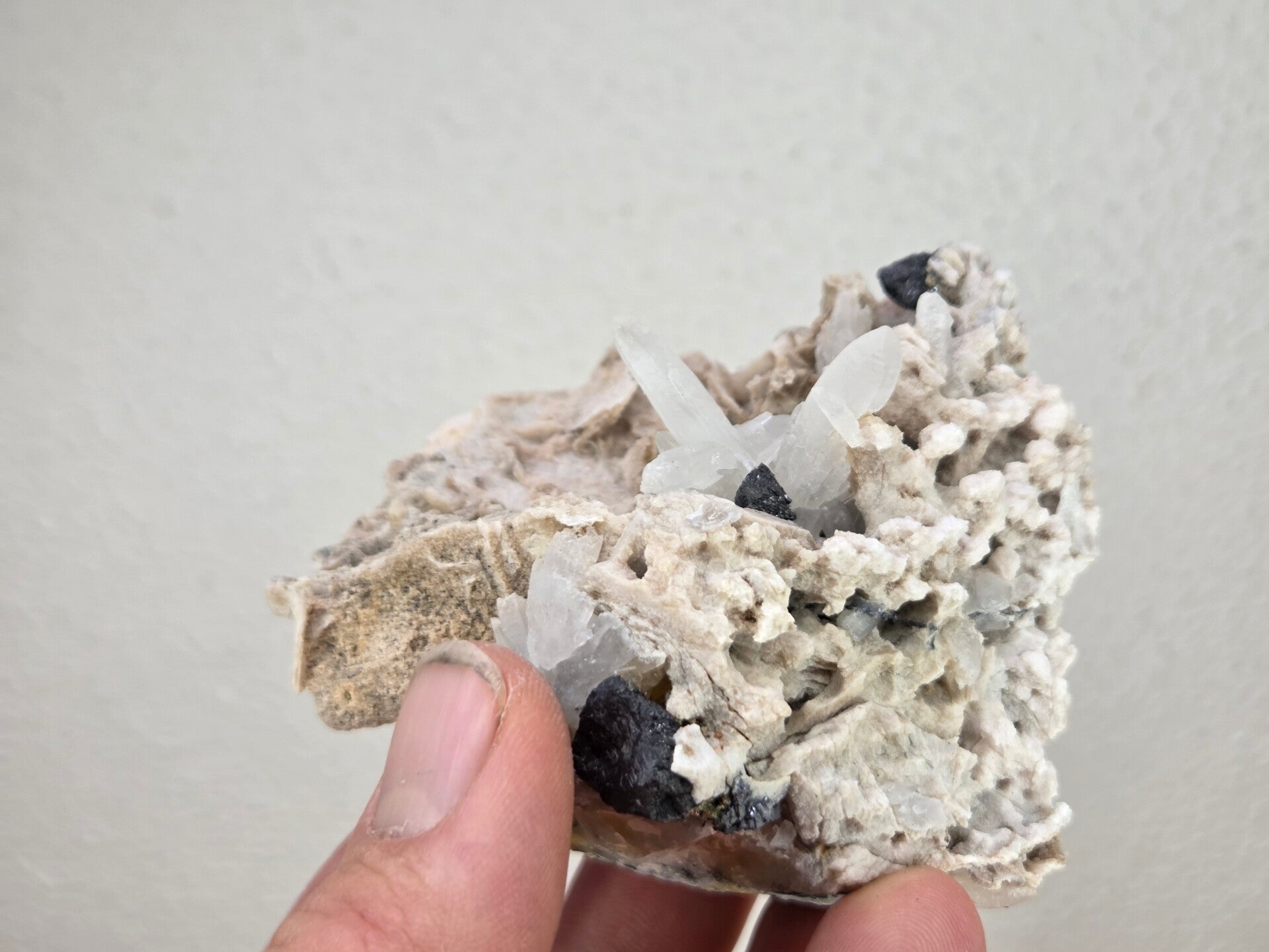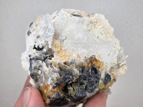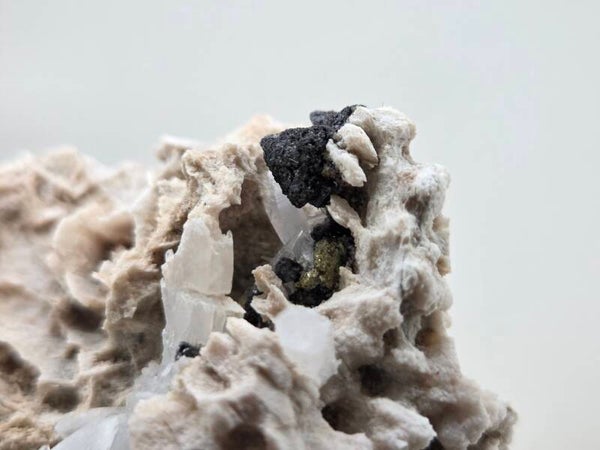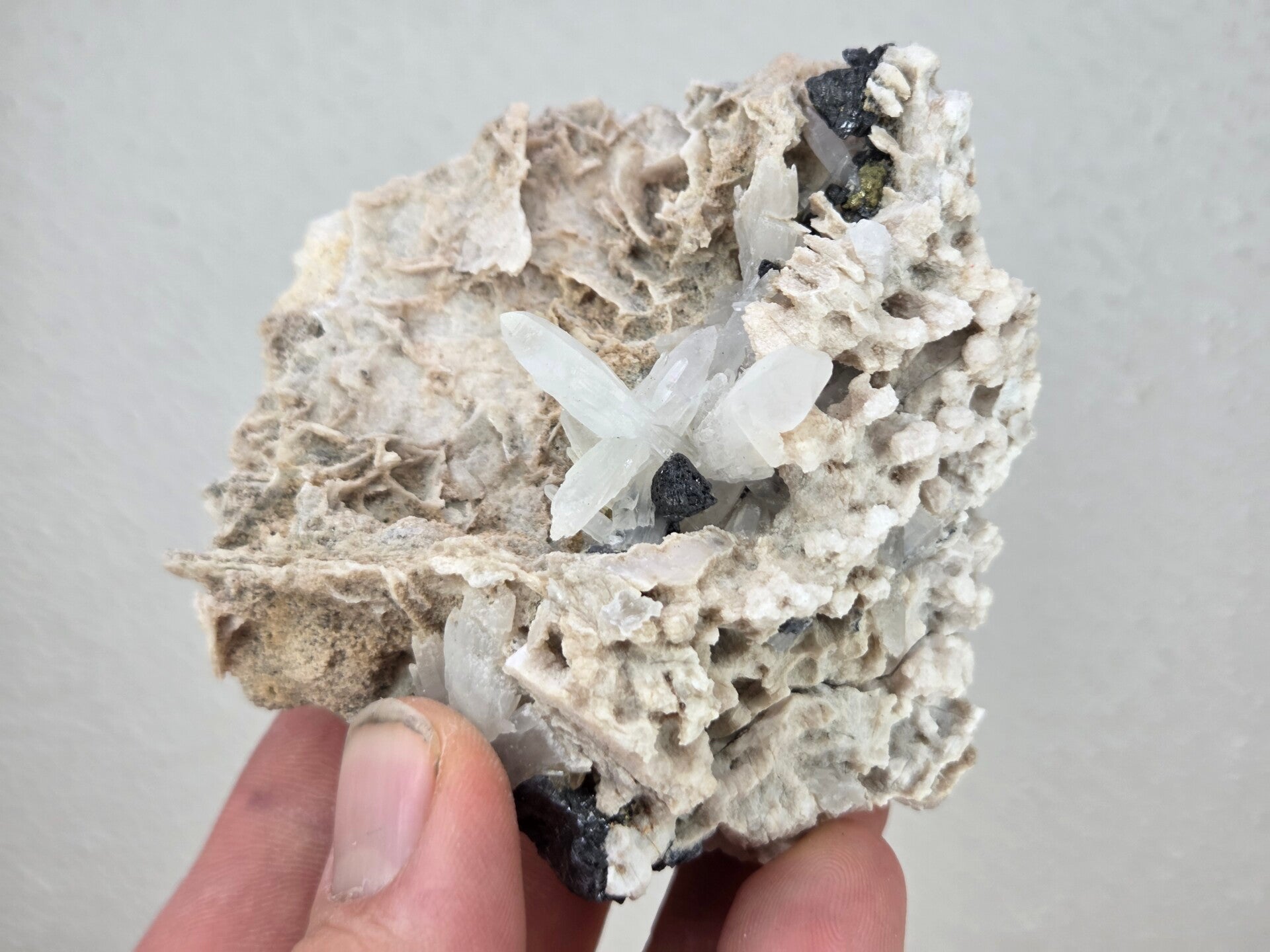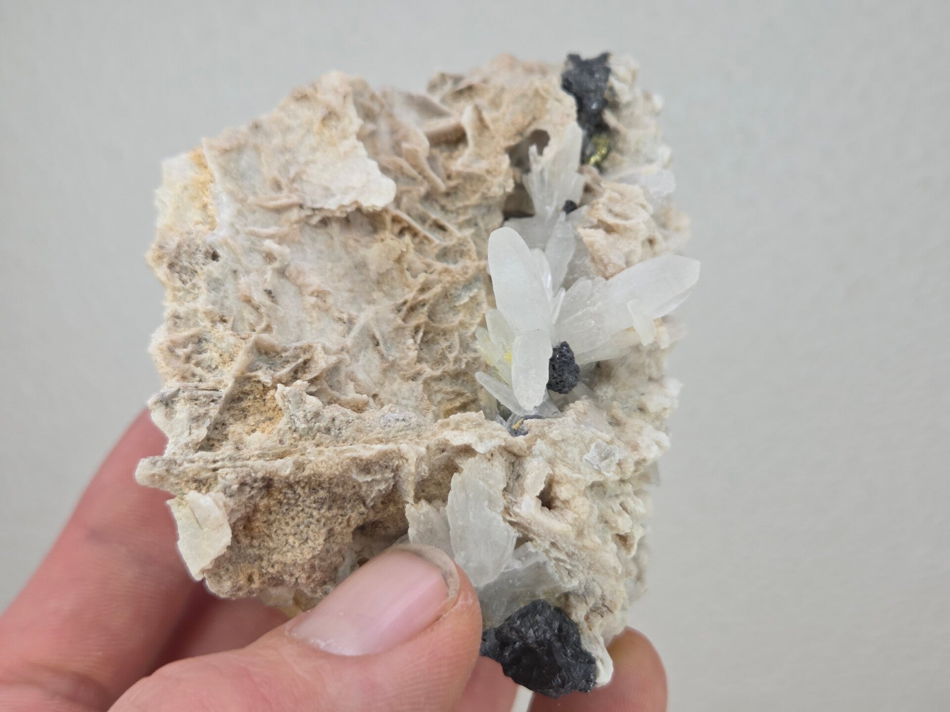 een stuk veldspaat met daarop sphaleriet en een cluster kwarts uit madan, bulgarije van 8,3 cm bij 8 cm bij 6 cm