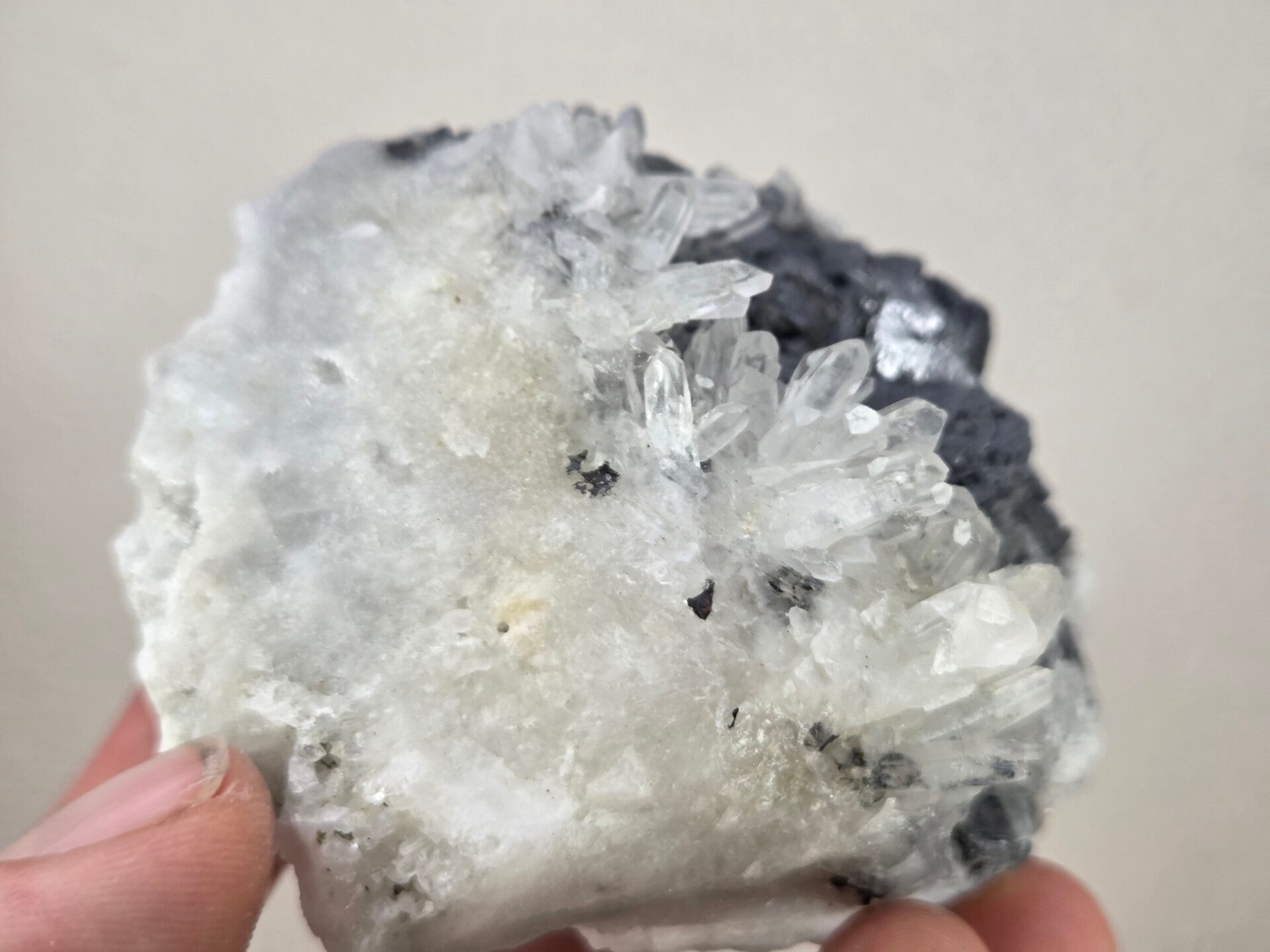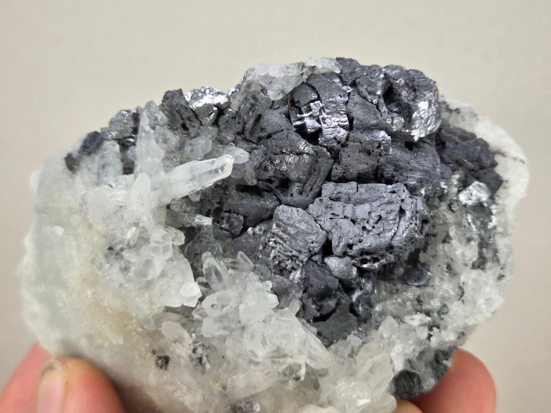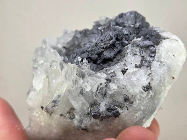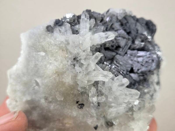 een stukje galeniet met kwarts uit madan, bulgarije van 9,2 cm bij 6,2 cm bij 5,5 cm