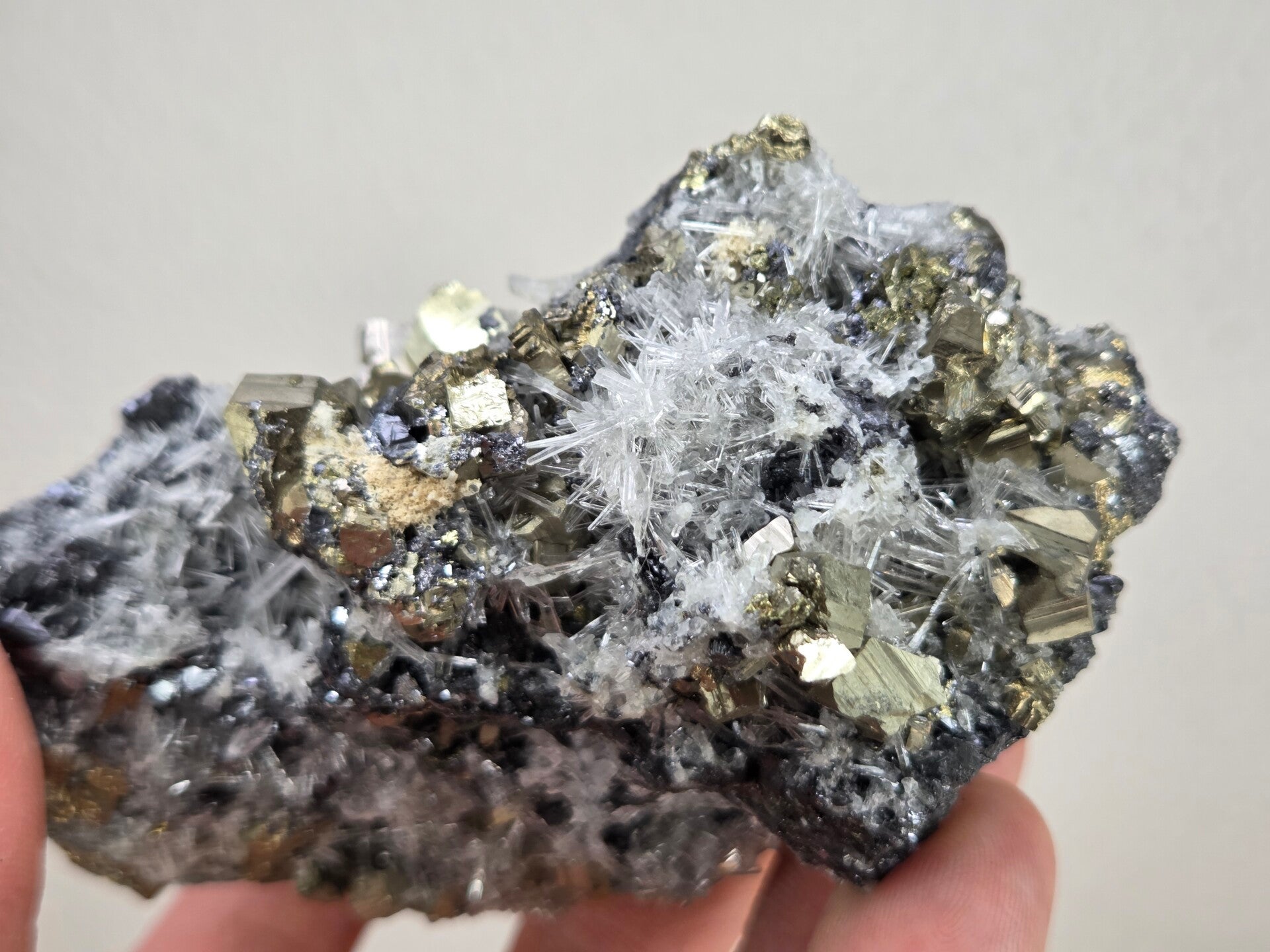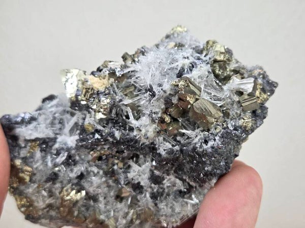 een stukje galeniet met pyriet en kwarts uit madan, bulgarije van 9,7 cm bij 6,6 cm bij 5,2 cm
