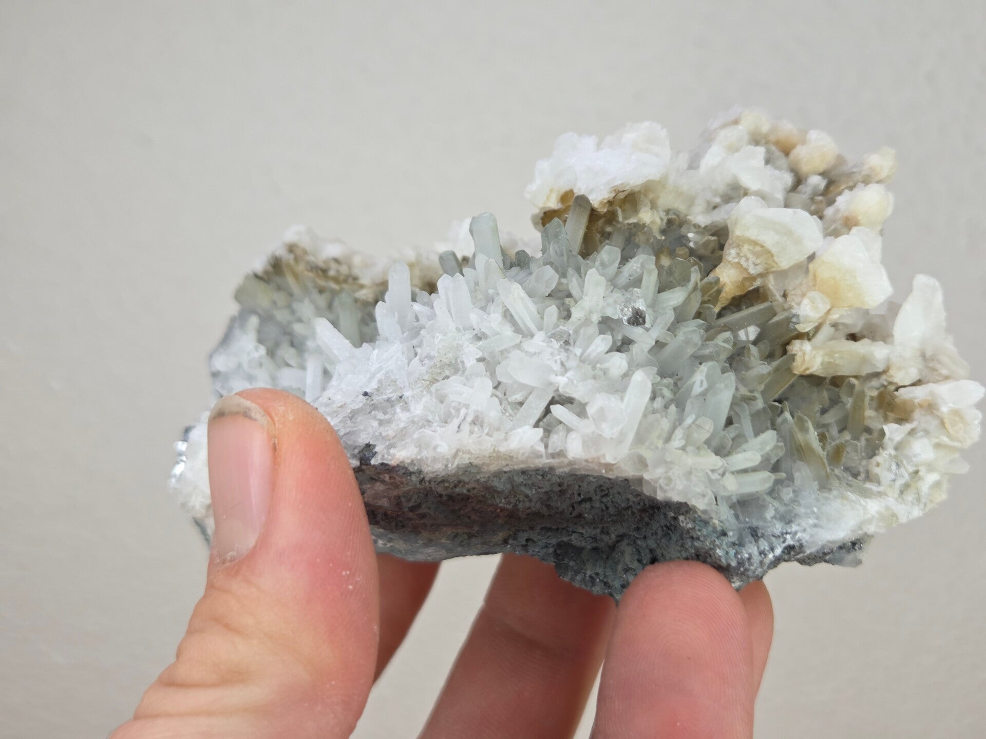 een stuk kwarts met witte calciet erop uit madan, bulgarije van 10,2 cm bij 6,2 cm bij 5,1 cm