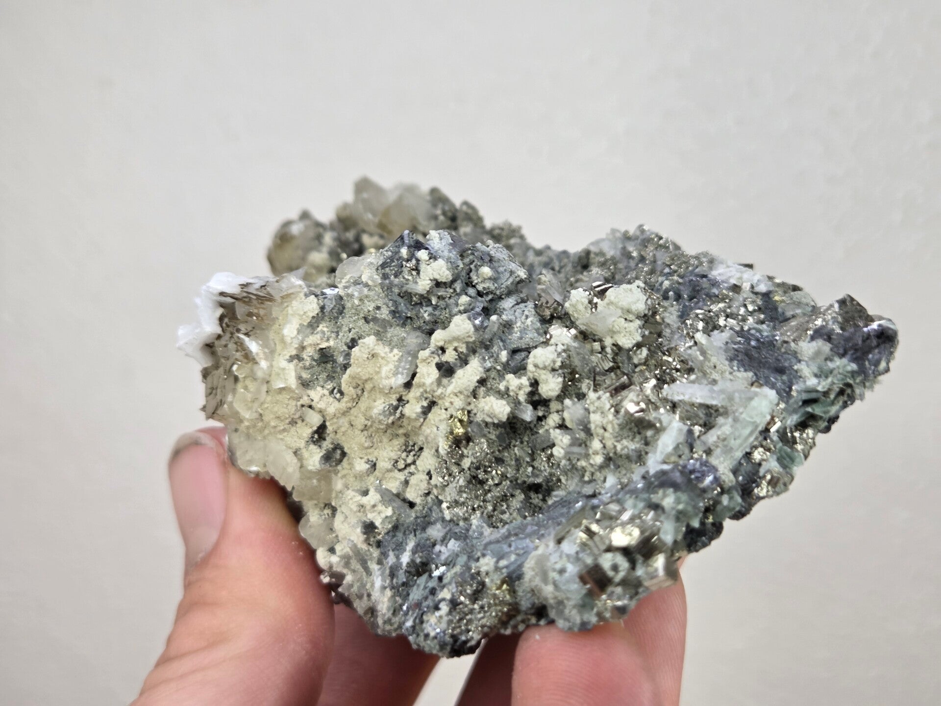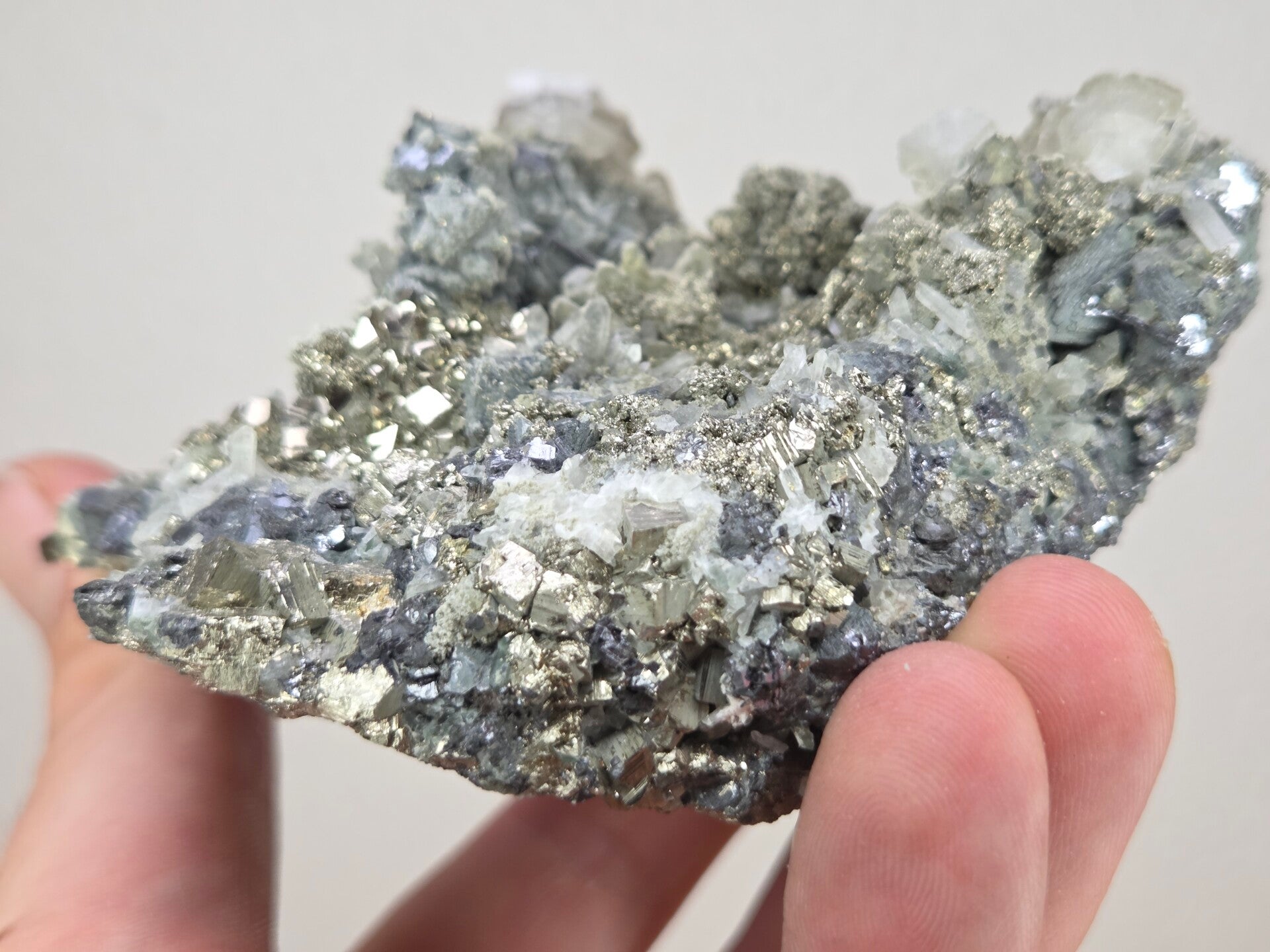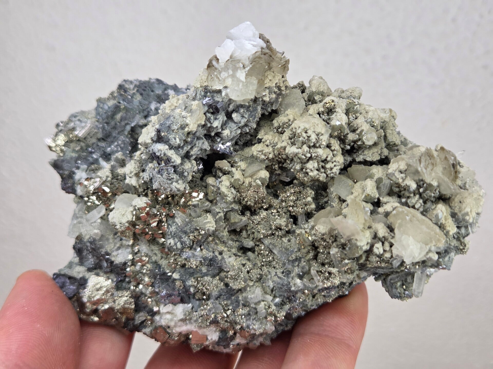 een stukje galeniet met calciet en pyriet uit madan, bulgarije van 10 cm bij 7,2 cm bij 5,1 cm