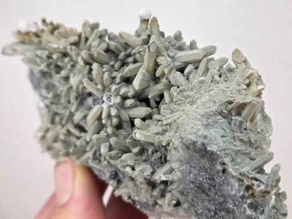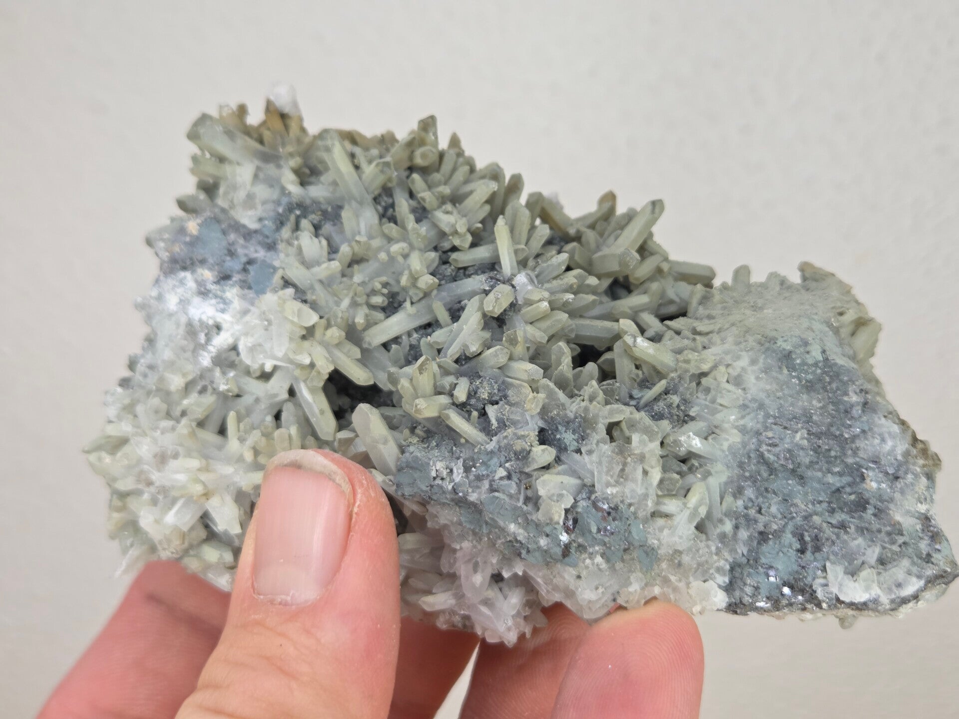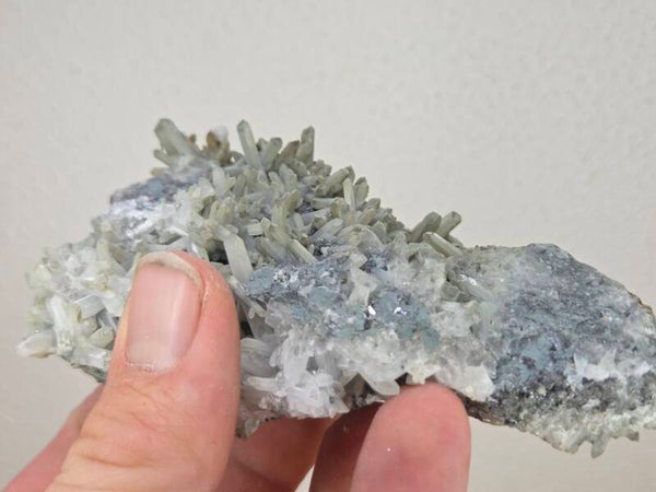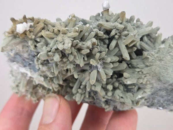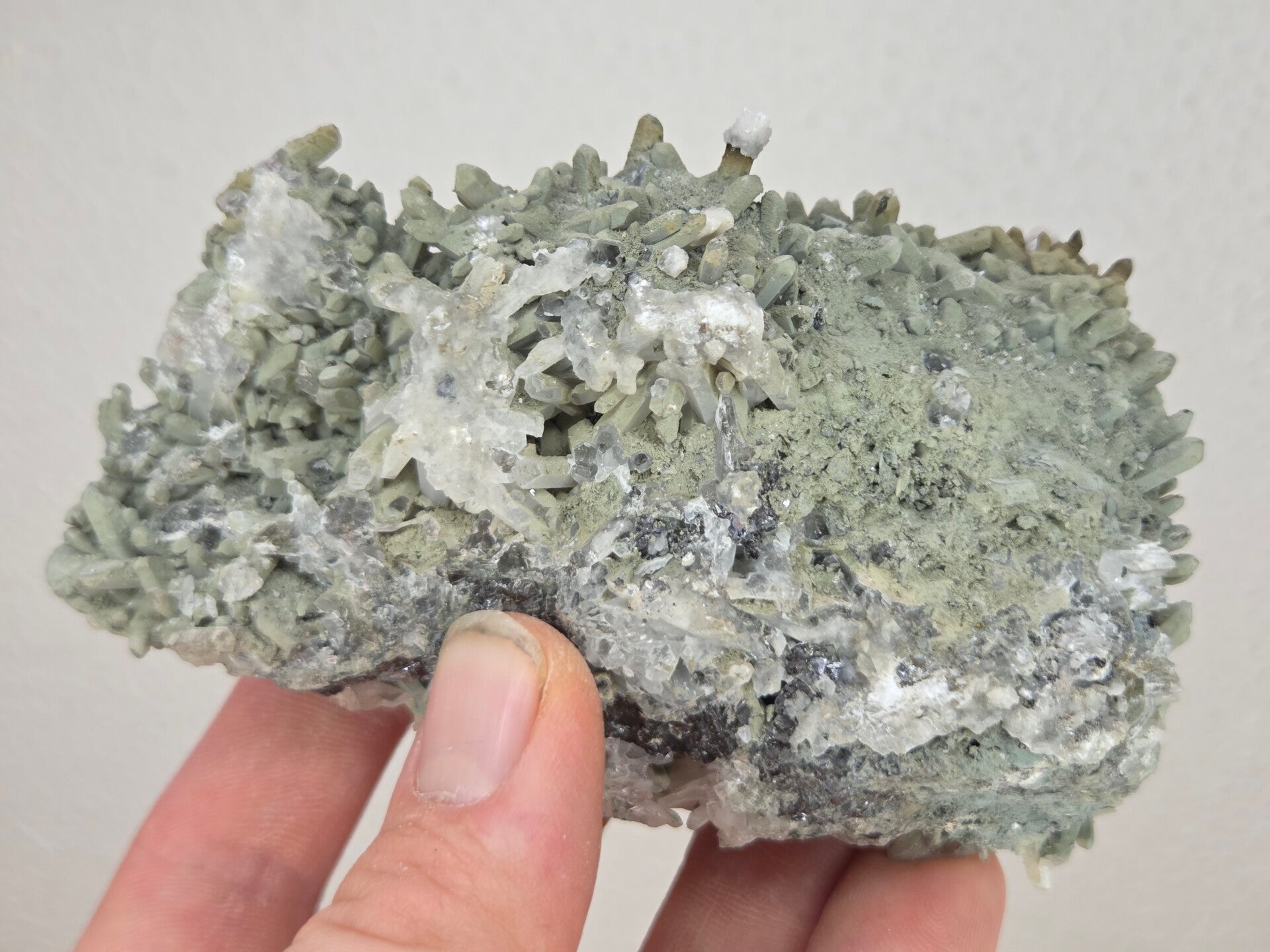 een stukje kwarts met calciet uit madan, bulgarije van 10,7 cm bij 6,6 cm bij 4,7 cm