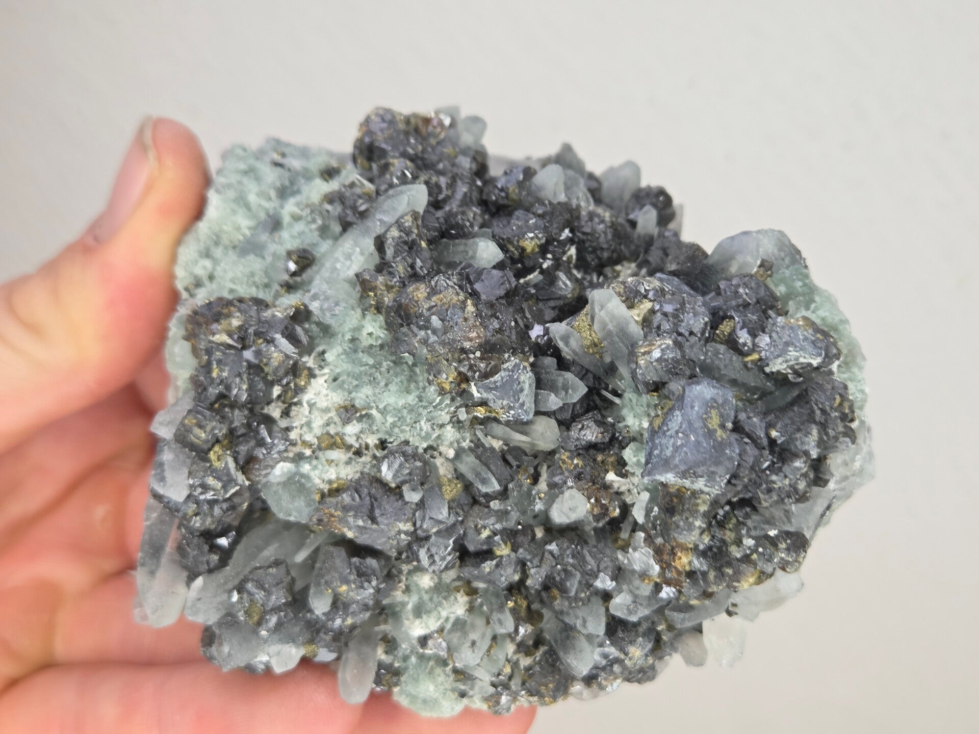 een stukje sphaleriet met kwarts uit madan, bulgarije van 9 cm bij8,4 cm bij 6,1 cm