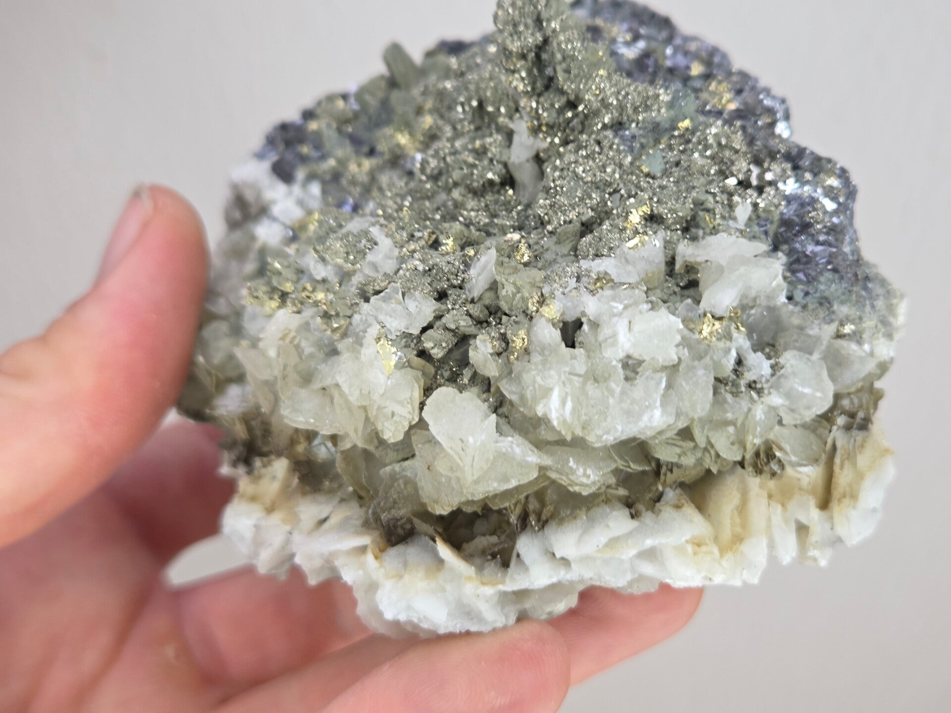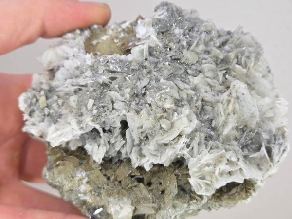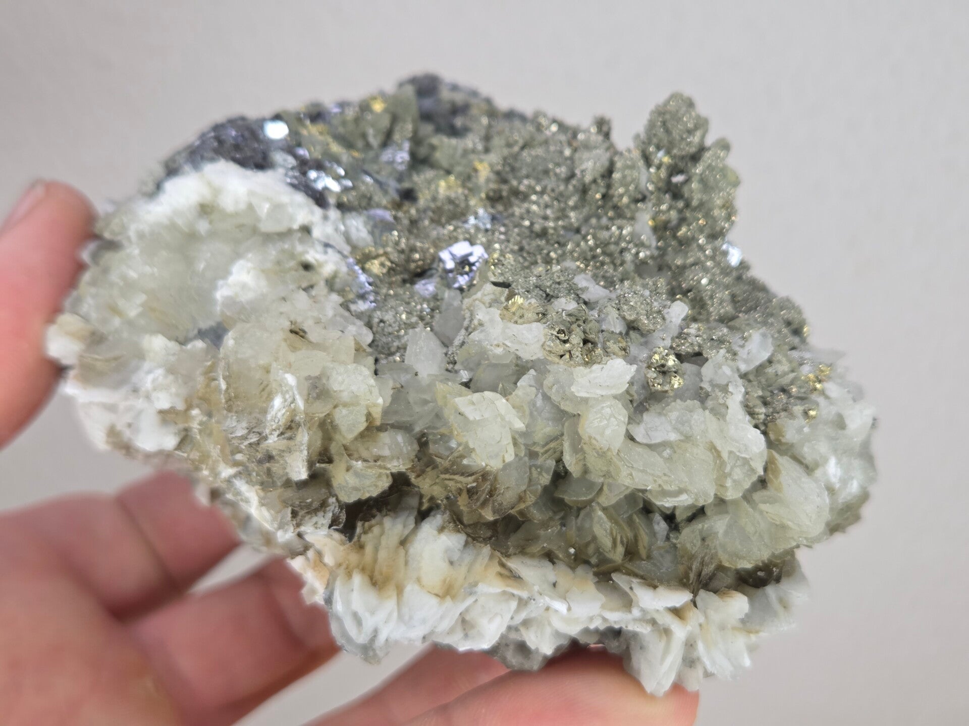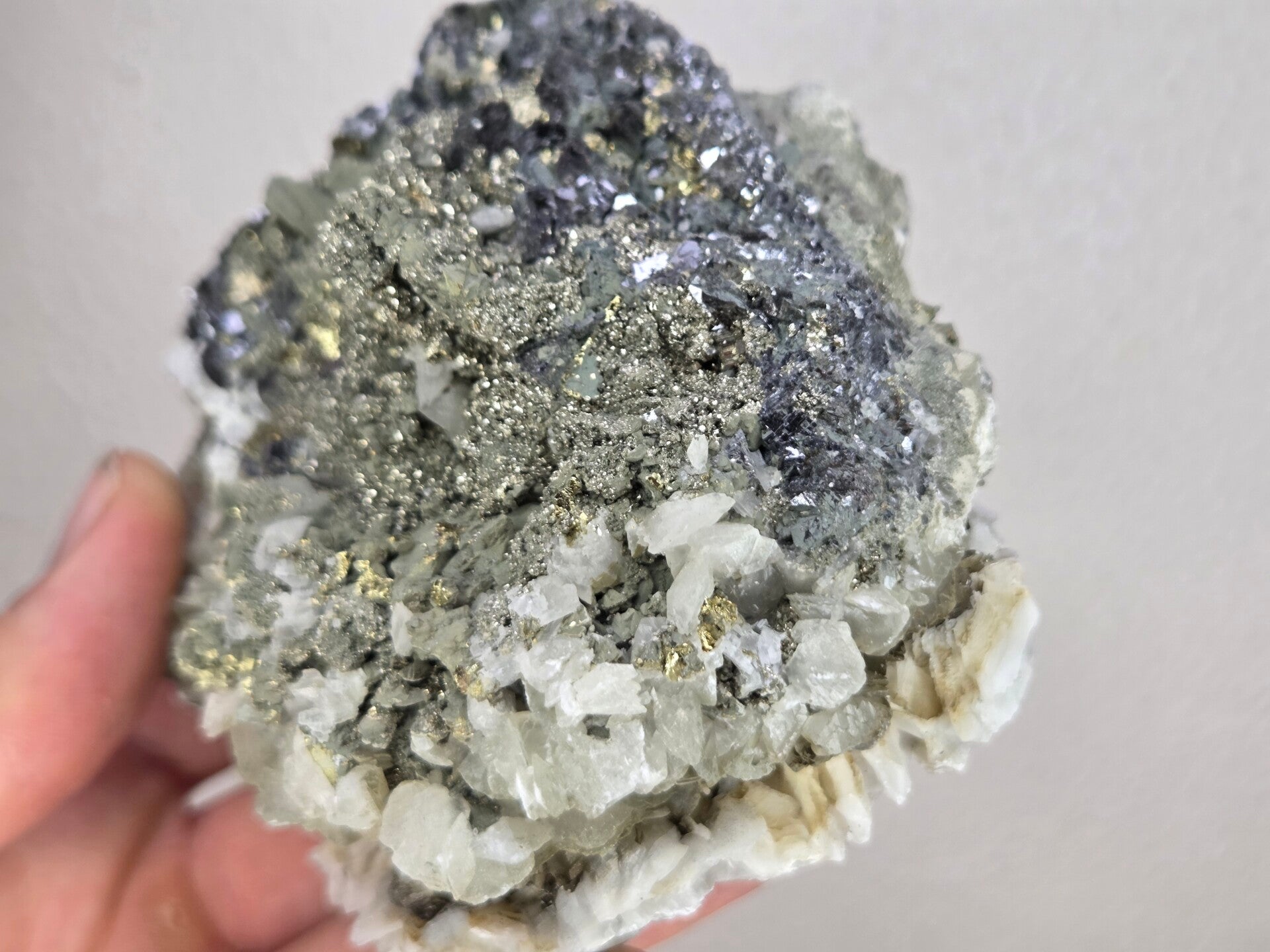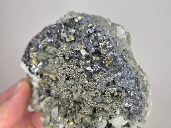 een stukje galeniet met calciet en pyriet uit madan, bulgarije van 10,7 cm bij 9,7 cm bij 7 cm