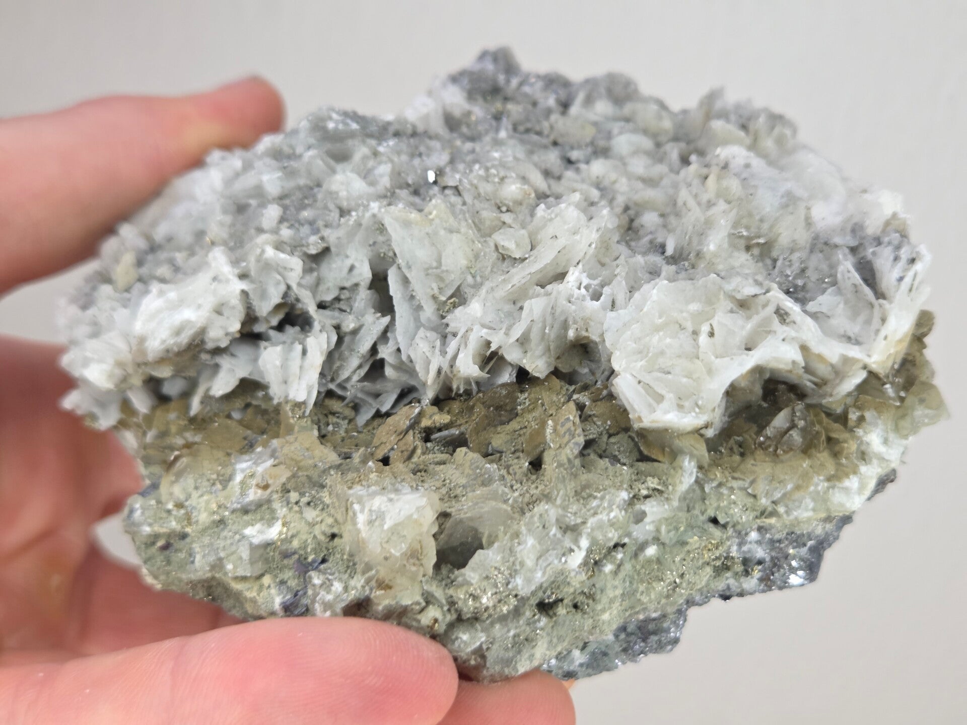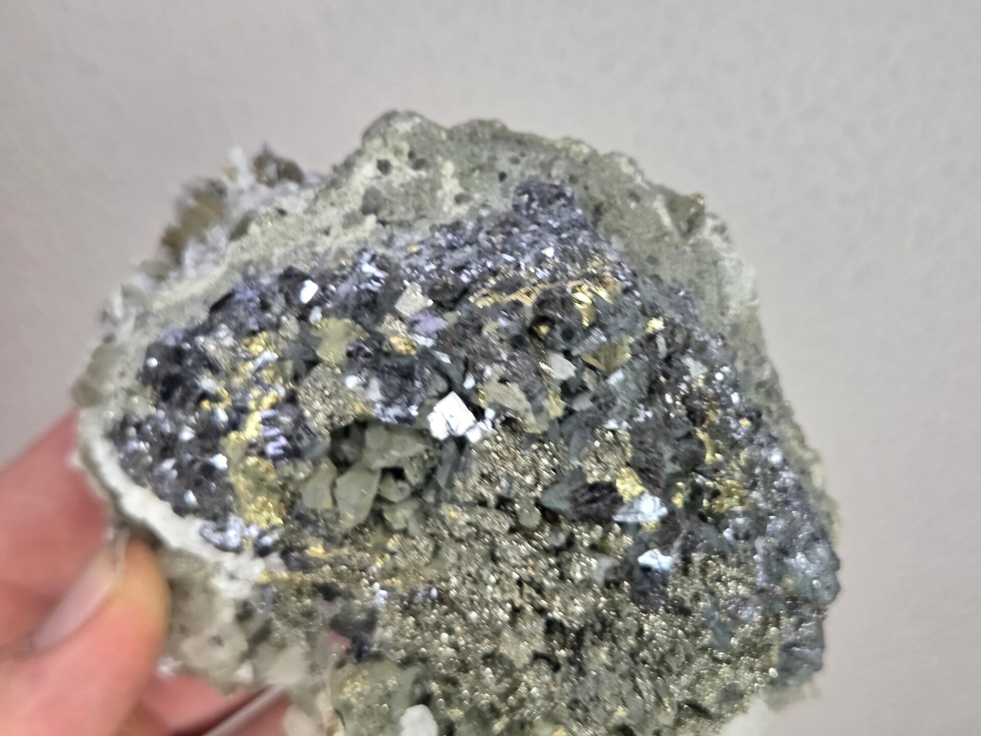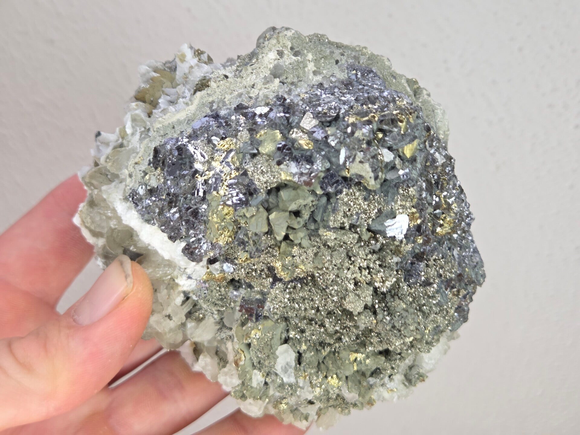 een stukje galeniet met calciet en pyriet uit madan, bulgarije van 10,7 cm bij 9,7 cm bij 7 cm
