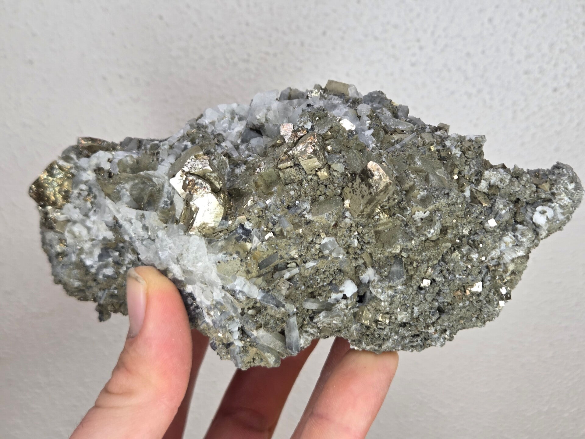 een stukje lkwarts, pyriet en calciet uit madan, bulgarije van 15,4 cm bij 9,4 cm bij 7,1 cm