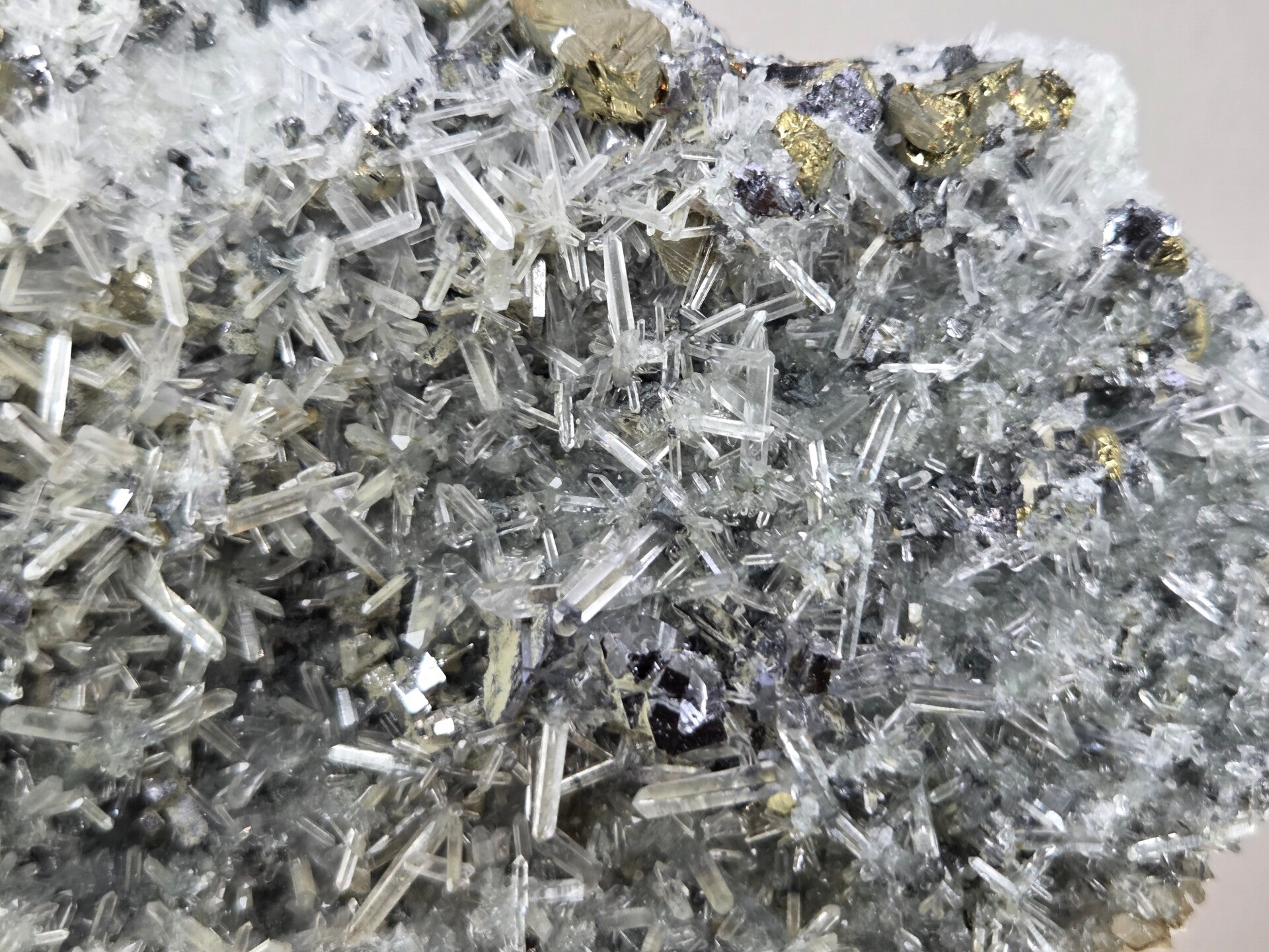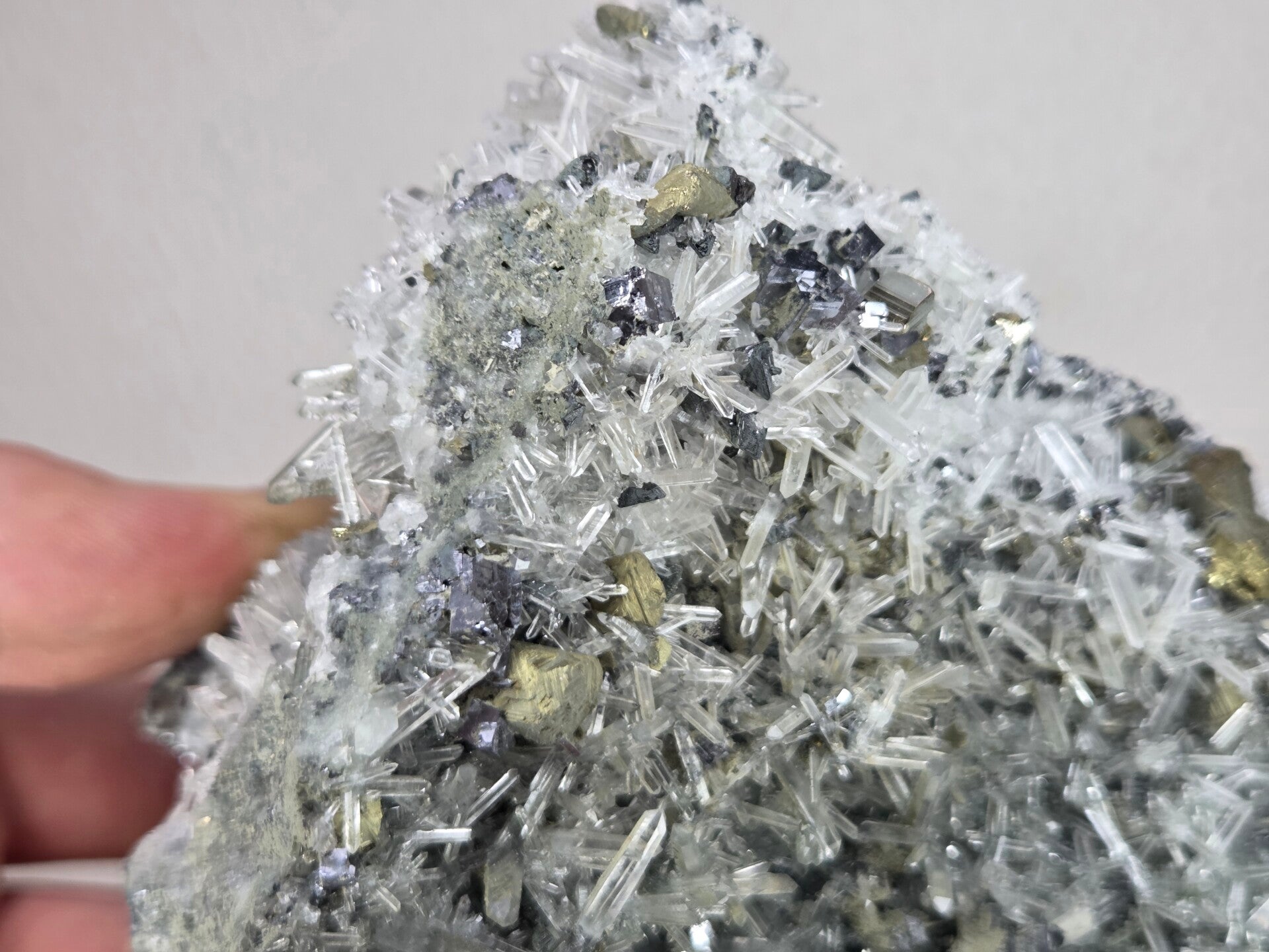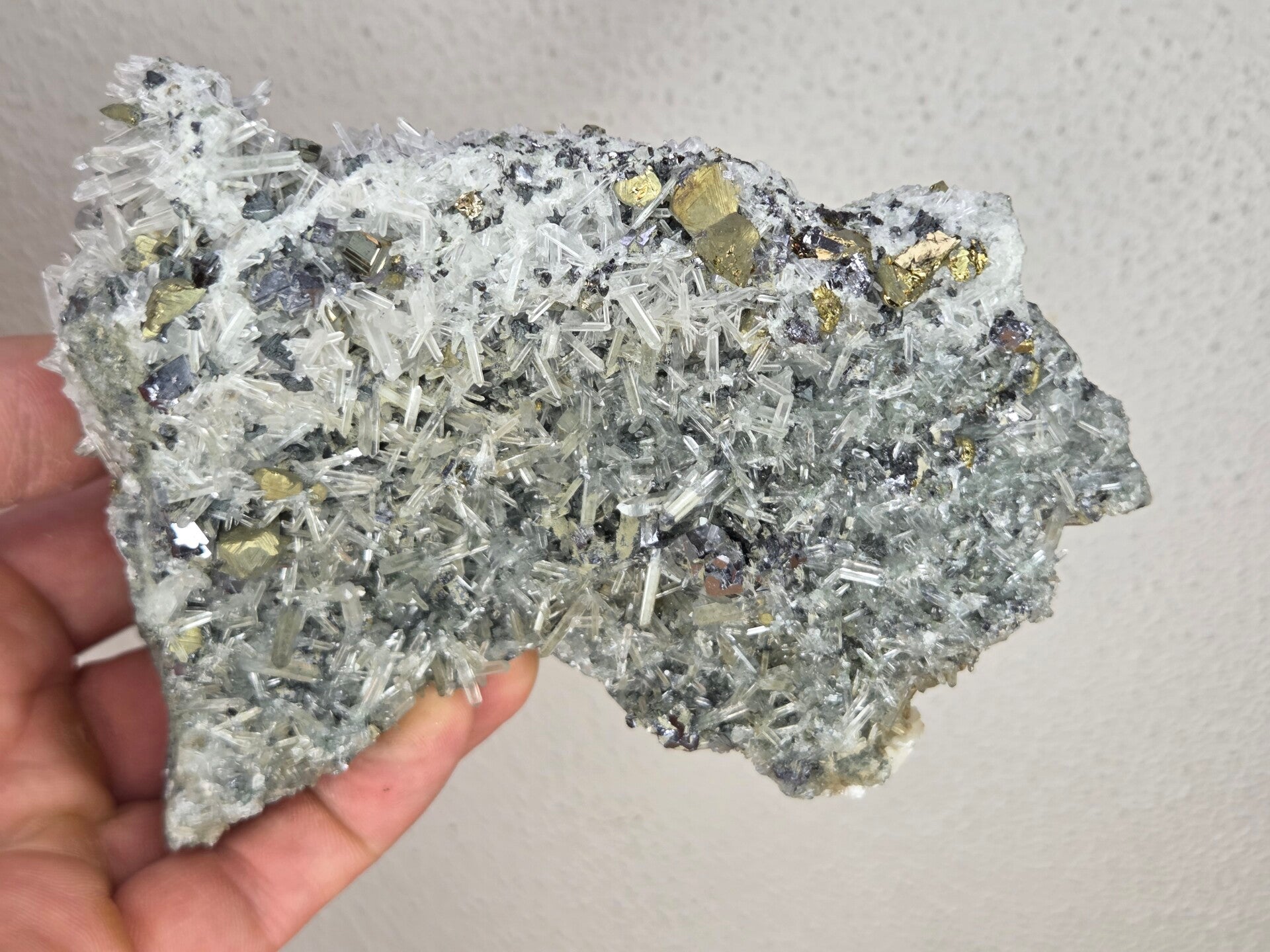 een stukje galeniet met calciet, pyriet en kwarts uit madan, bulgarije van 13 cm bij 9,6 cm bij 8,1 cm