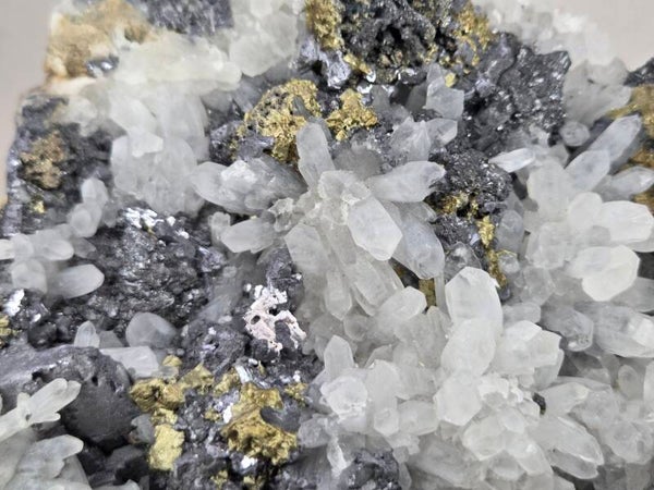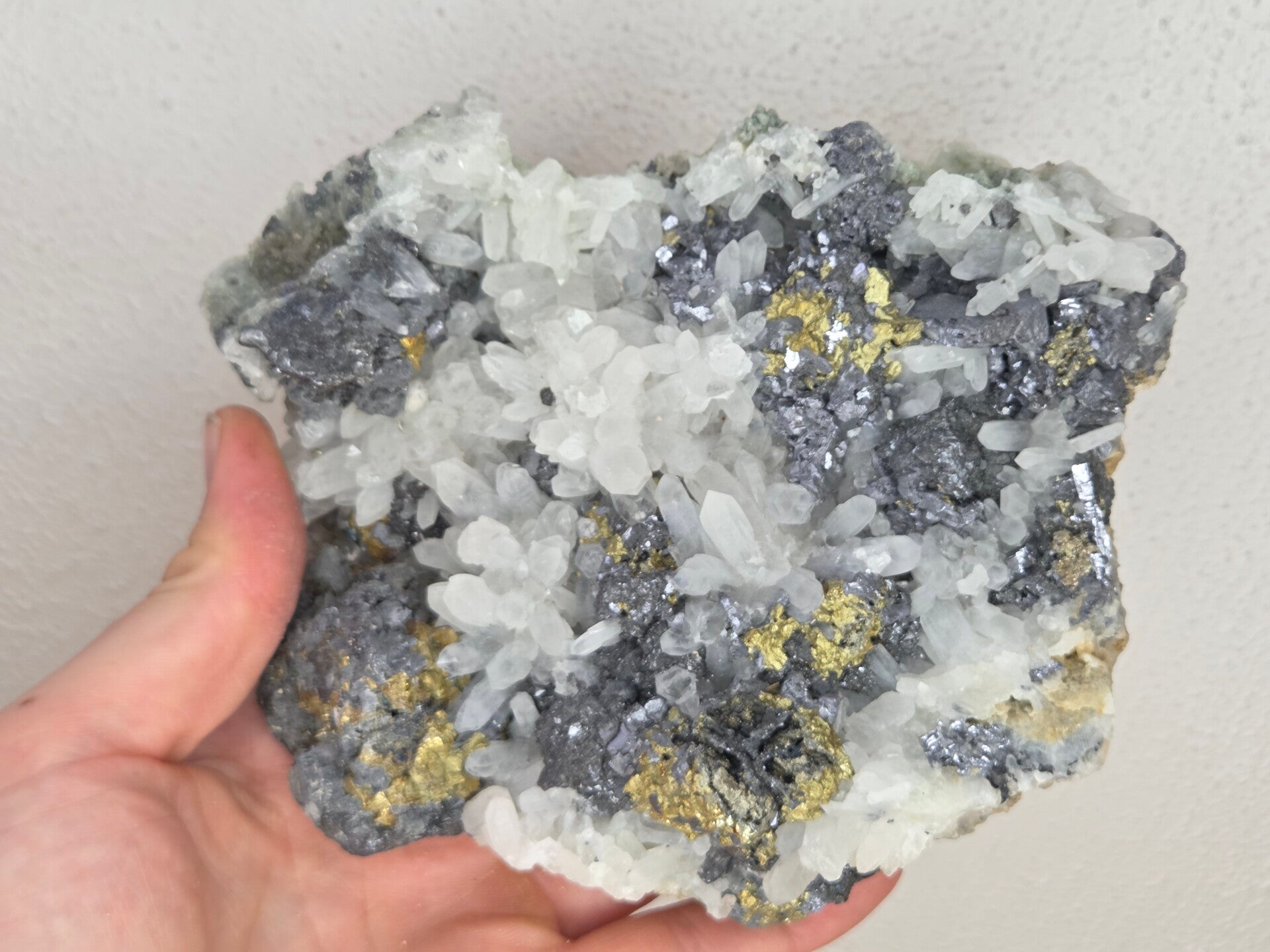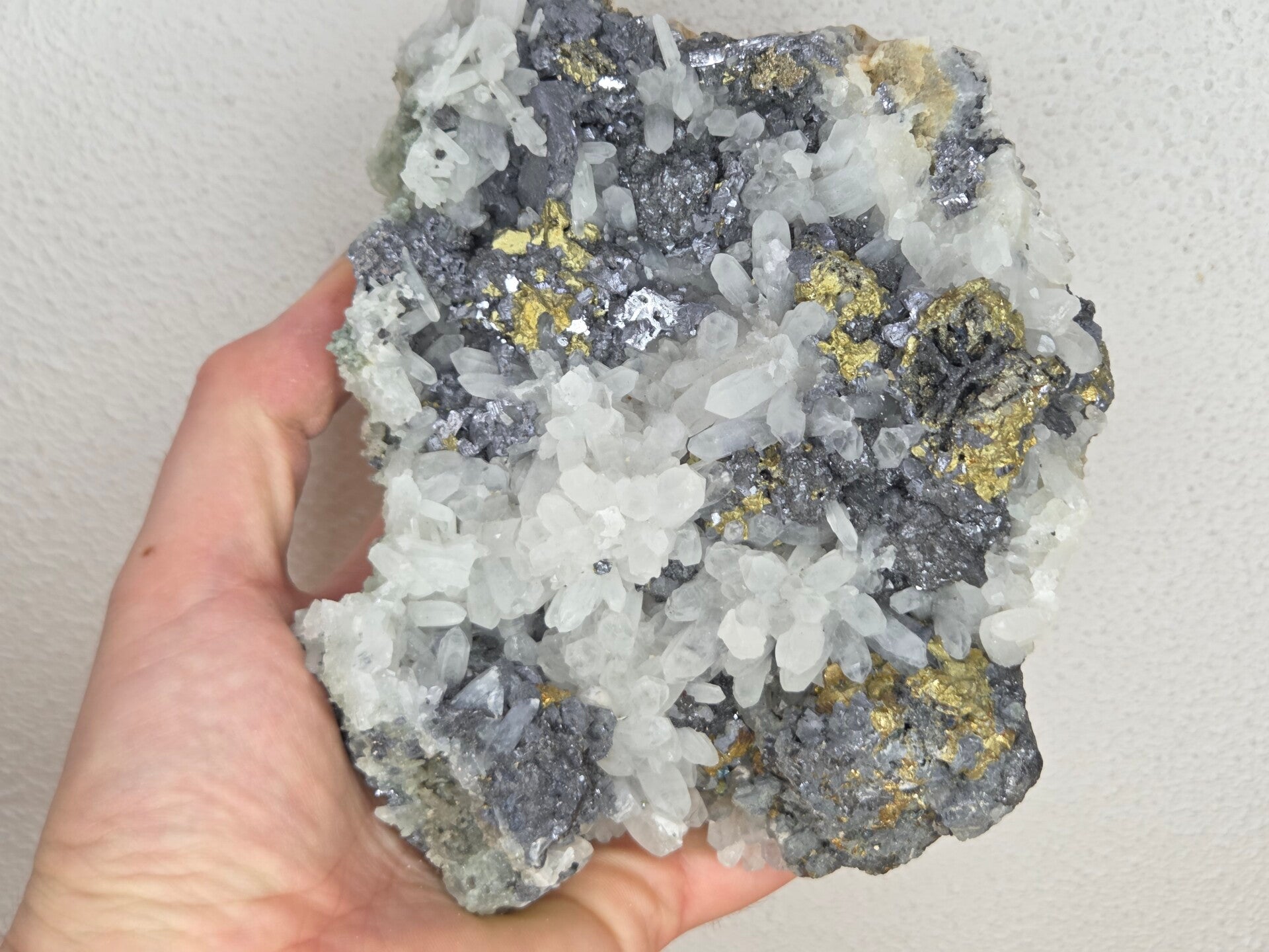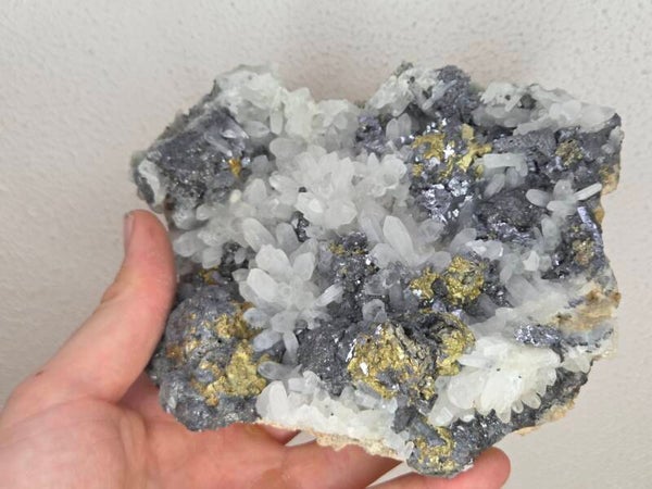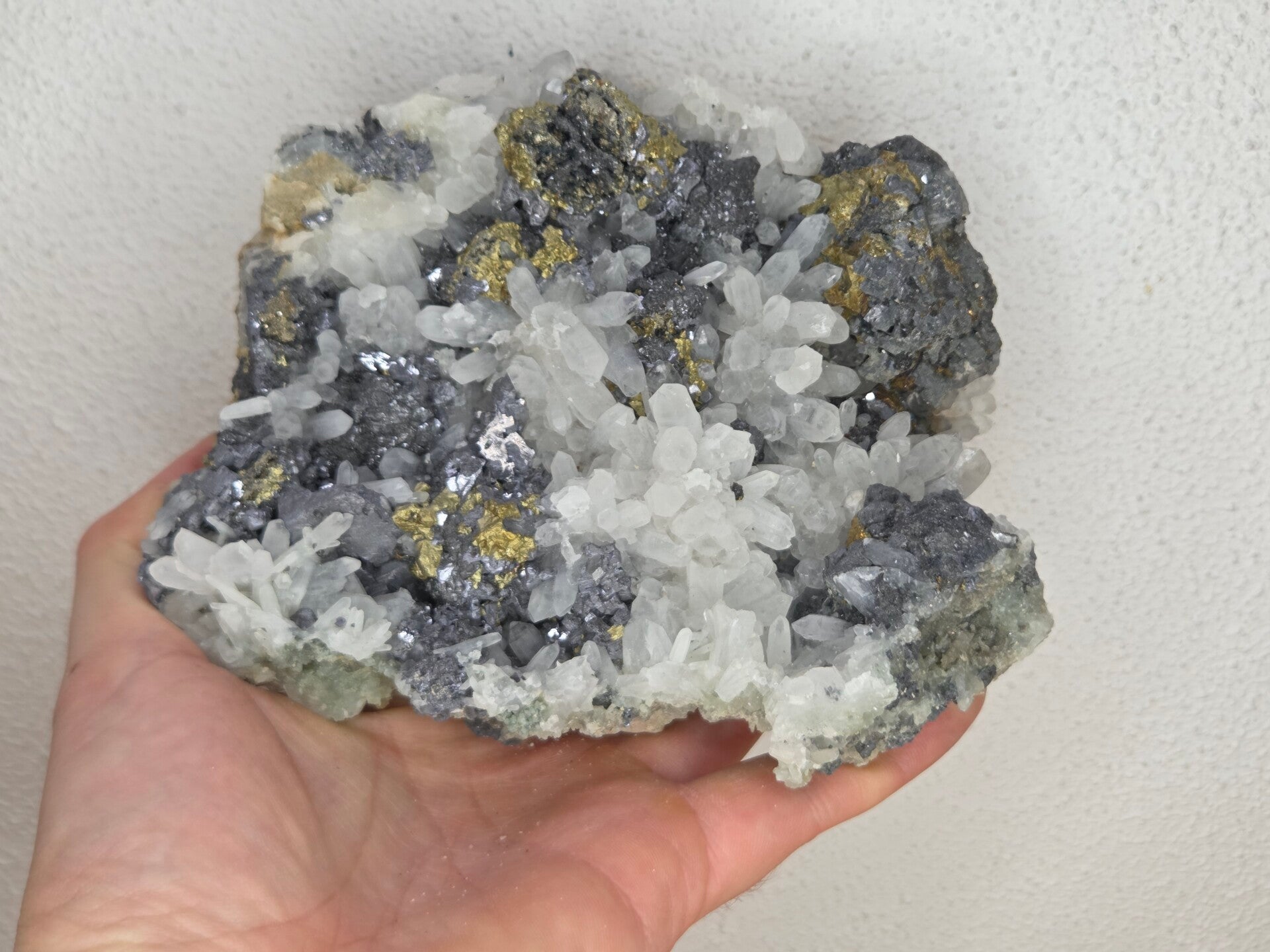 een stukje galeniet met kwarts en pyriet uit madan, bulgarije van 15 cm bij 12,2 cm bij 6,7 cm