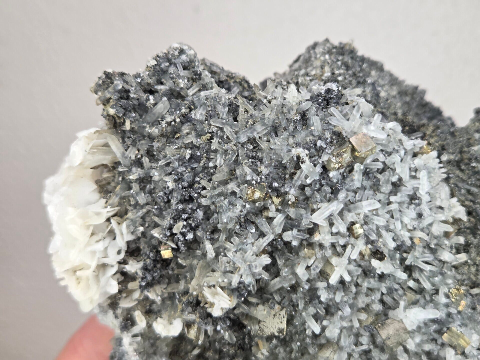 een stukje kwarts, pyriet en calciet uit madan, bulgarije van 14,2 cm bij 12,2 cm bij 7,1 cm