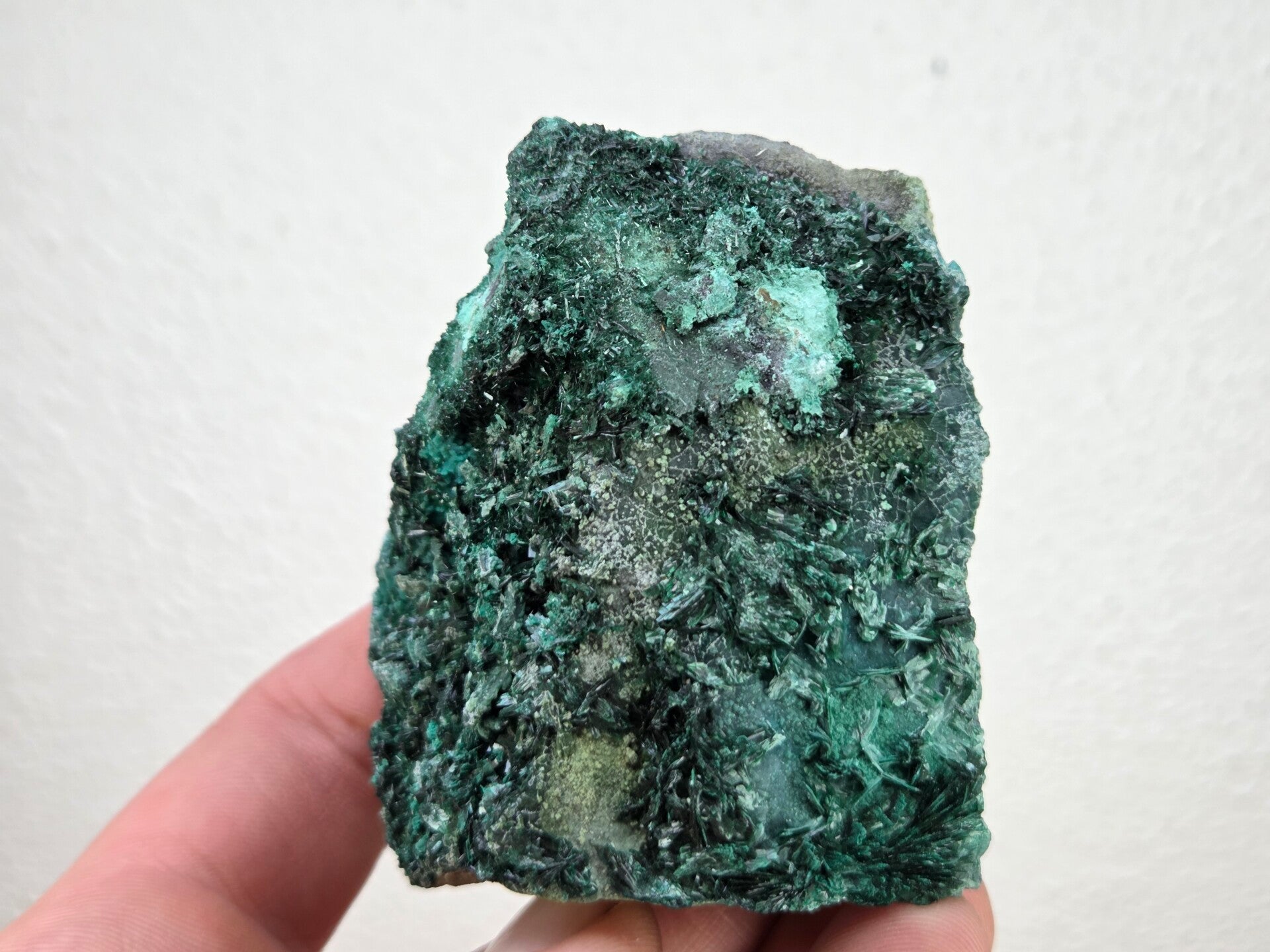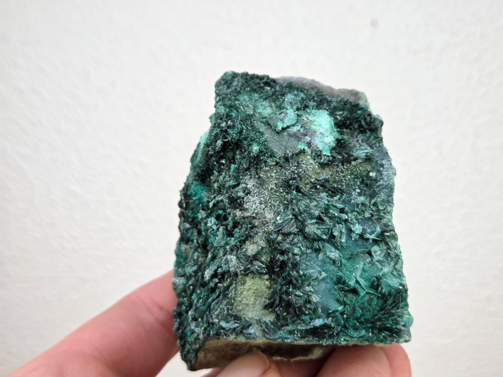 een stuk donker groene atacamiet met mooie kristallen uit de atacama woestijn, chili van 6,4 cm bij 5,4 cm bij 3,5 cm