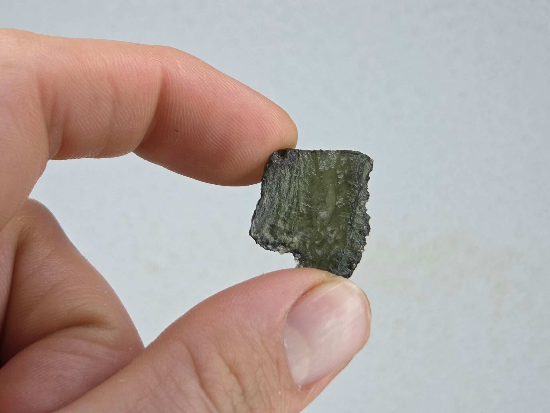een stukje moldaviet uit chlum, tsjechië van 3,20 gram en 2,2 cm bij 1,8 cm bij 0,5 cm
