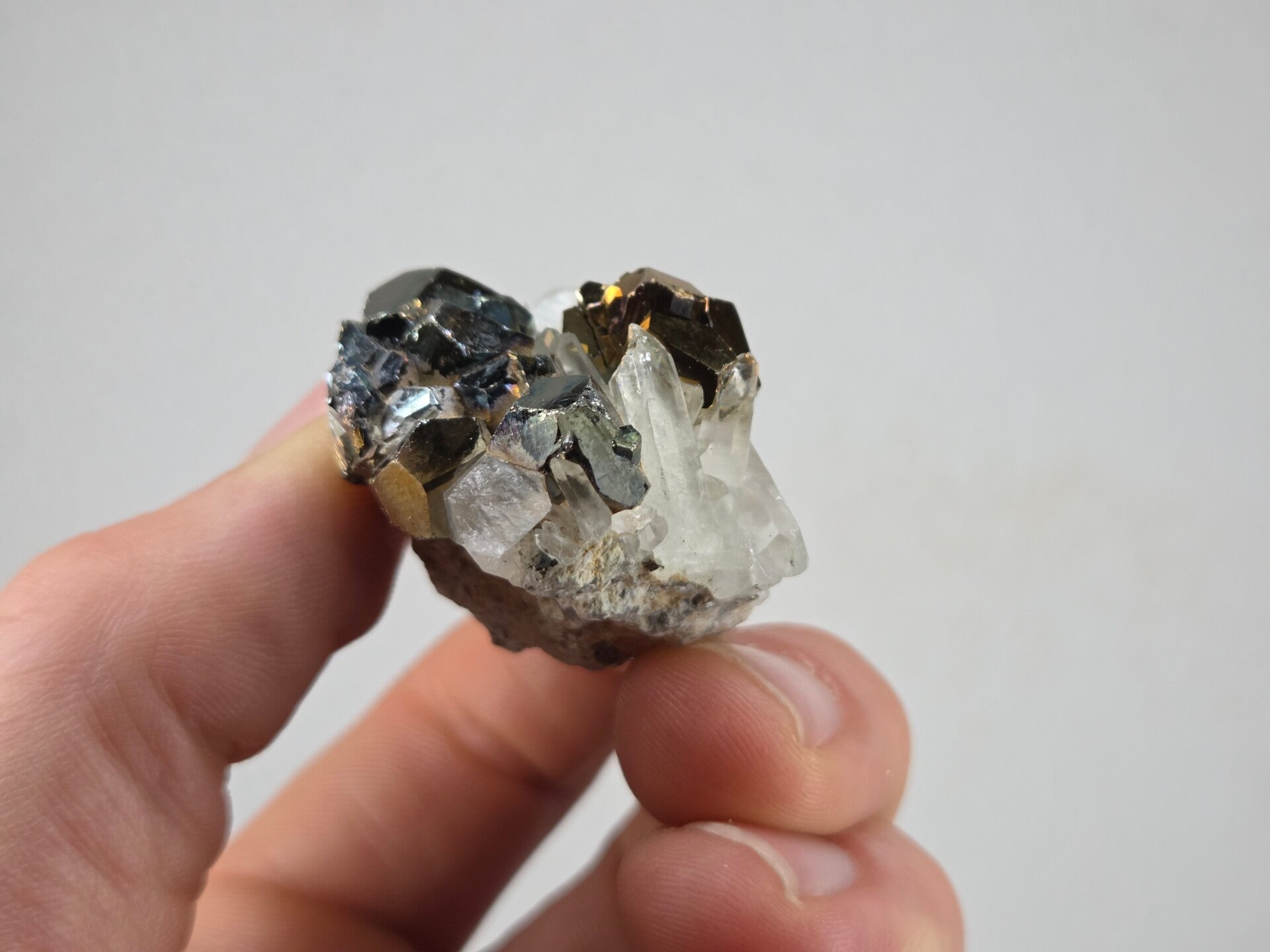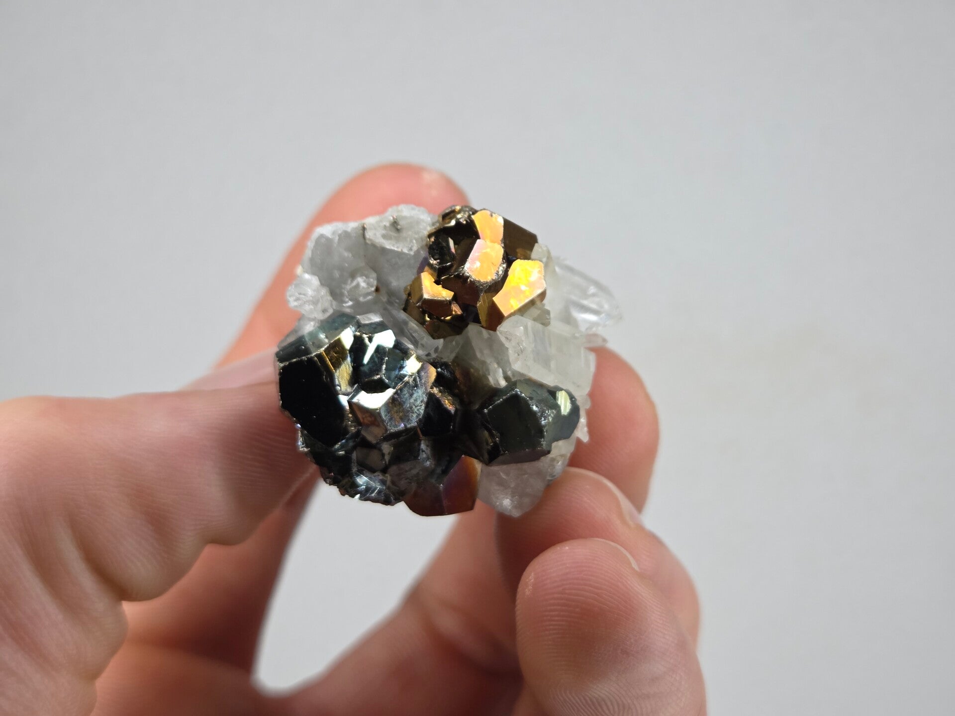 een stukje regenboog pyriet met kwarts uit de kalimantan mijn in borneo, indonesië van 3,3 cm bij 3,2 cm bij 2,7 cm