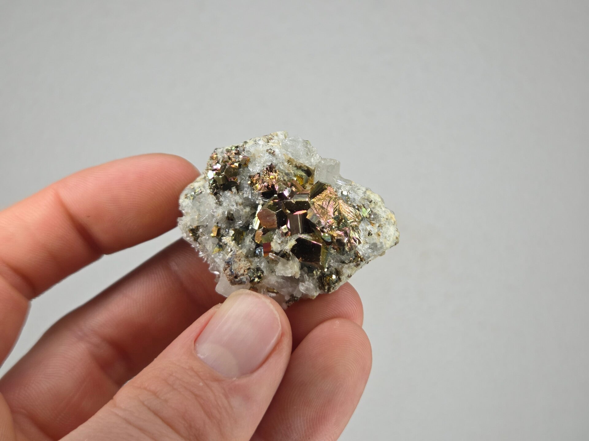 een stukje regenboog pyriet met kwarts uit de kalimantan mijn in borneo, indonesië van 3,3 cm bij 4 cm bij 2,3 cm