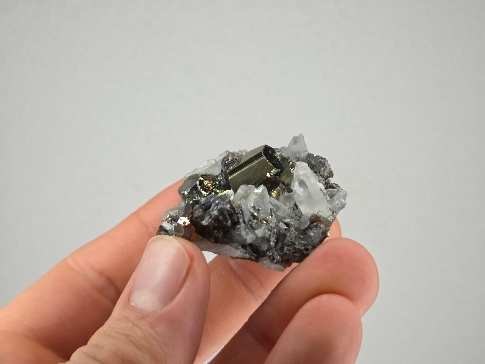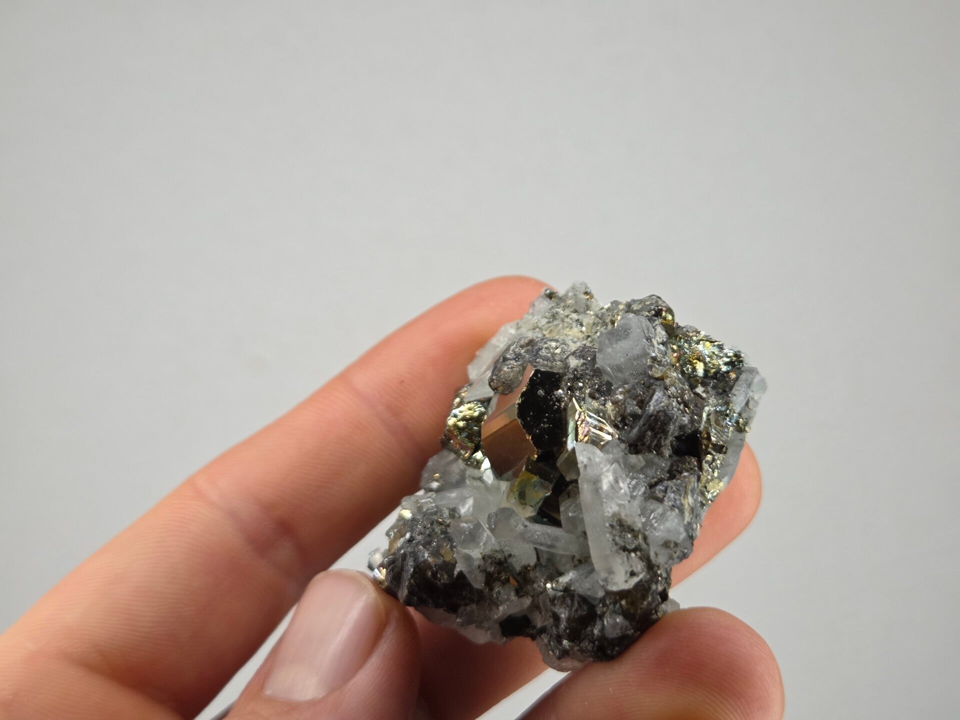 een stukje regenboog pyriet met kwarts uit de kalimantan mijn in borneo, indonesië van 4,3 cm bij 4,5 cm bij 2,1 cm