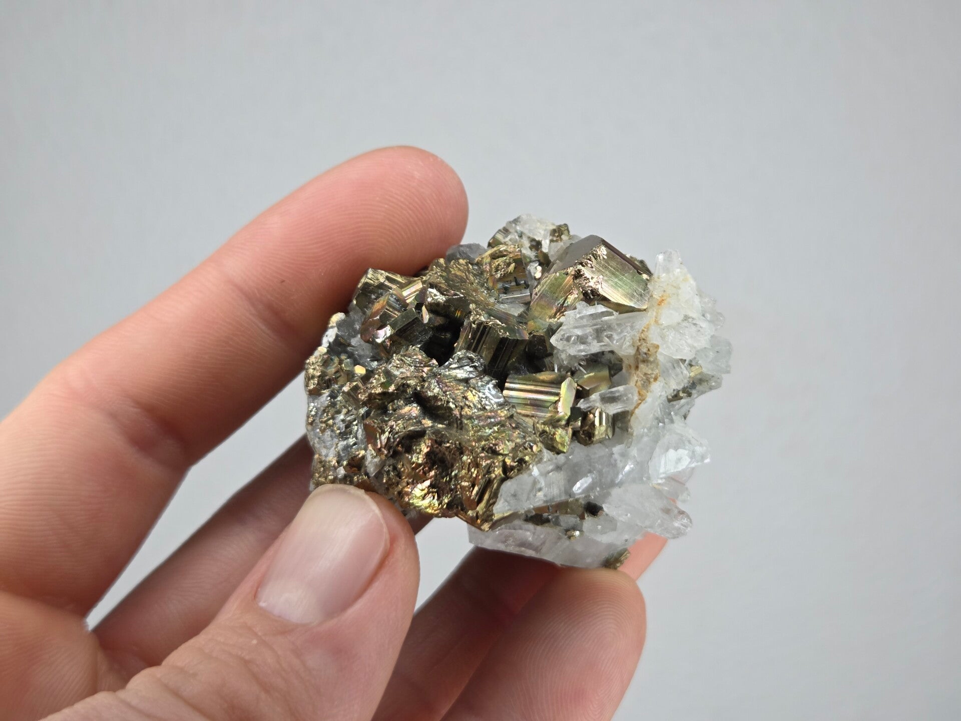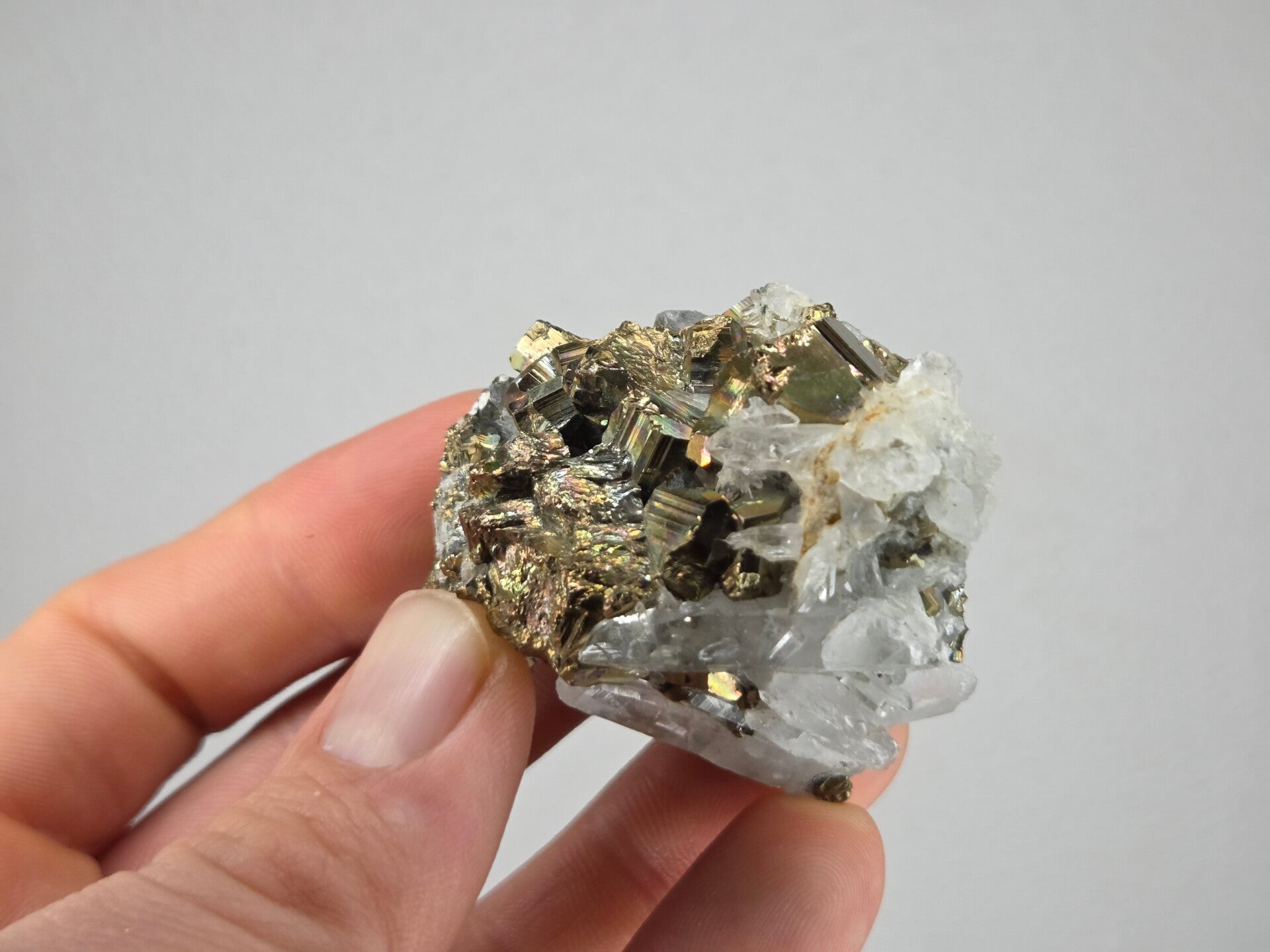 een stukje regenboog pyriet met kwarts uit de kalimantan mijn in borneo, indonesië van 4,8 cm bij 4,5 cm bij 3,2 cm