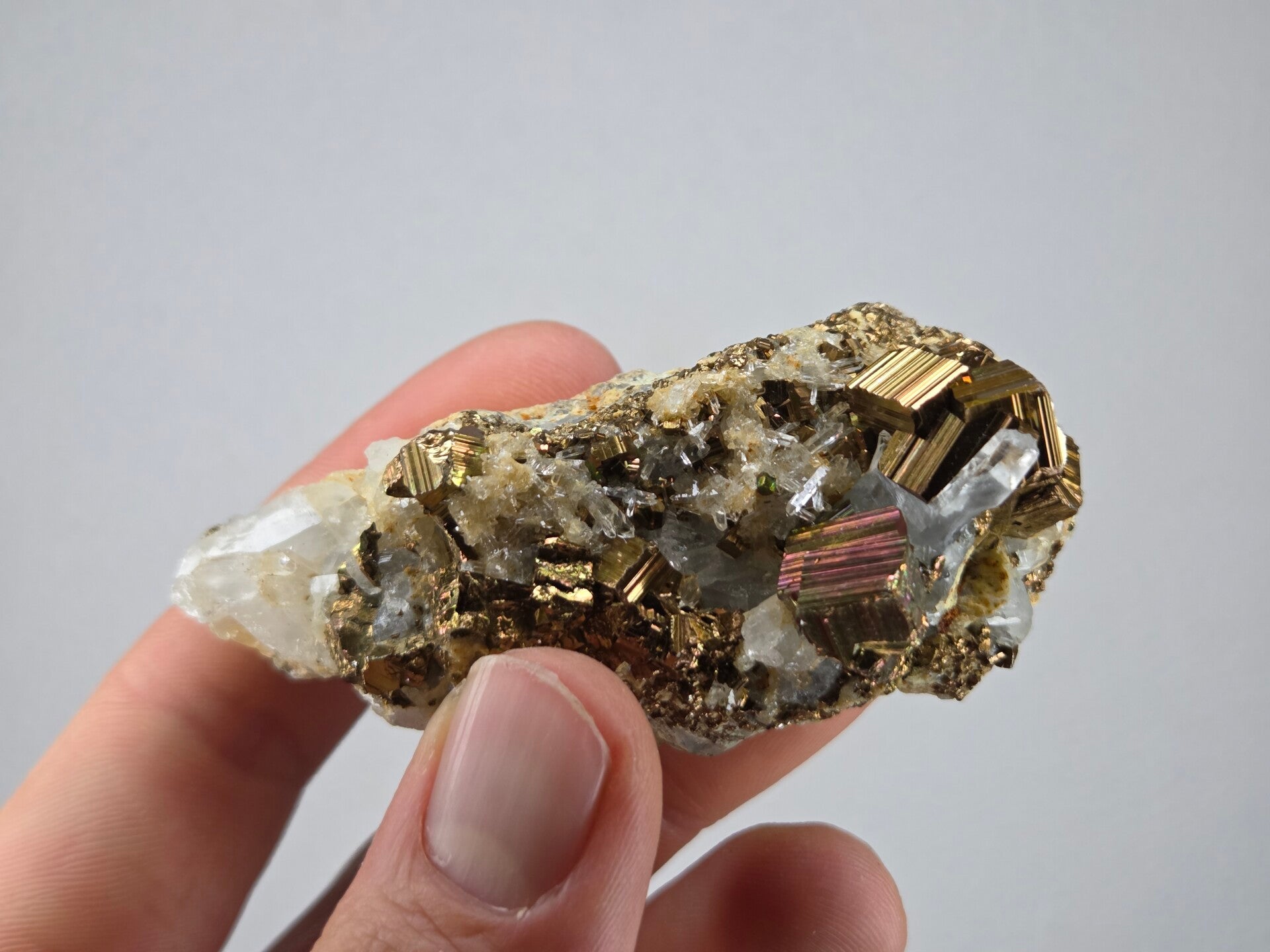 een stukje regenboog pyriet met kwarts uit de kalimantan mijn in borneo, indonesië van 7,3 cm bij 3,4 cm bij 3,2 cm