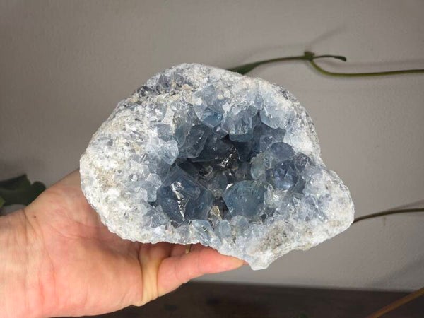 een grote celestien geode uit madagaskar van 4,8 kilo en 15,4 cm bij 17,8 cm bij 11,4 cm