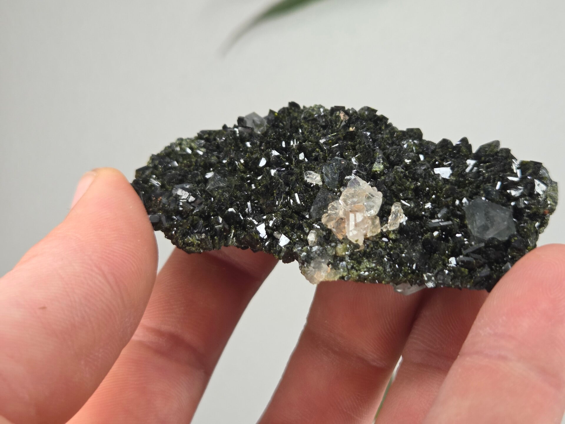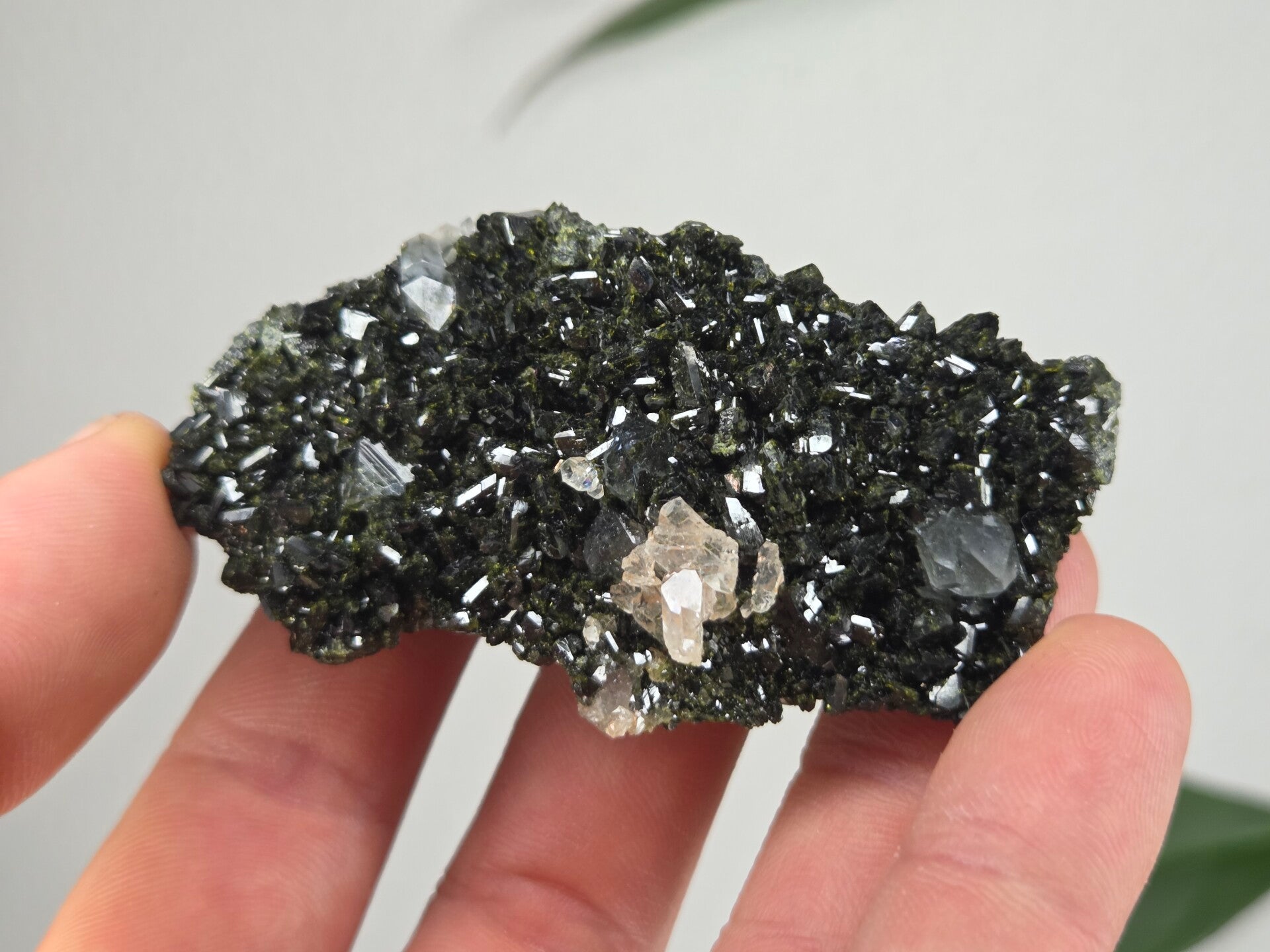 een stuk glanzende epidoot met heldere kwartsen uit semdinli, hakkari gebergte, turkije van 7,4 cm bij 2 cm bij 4,2 cm